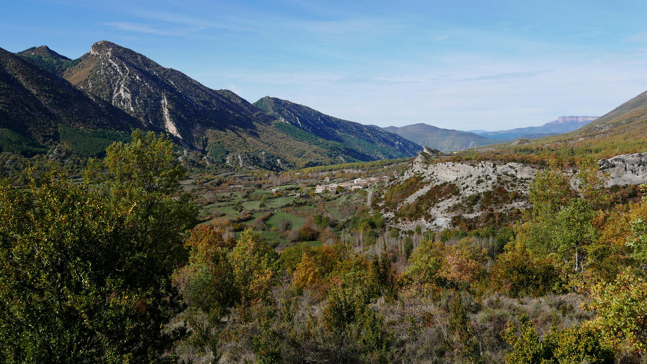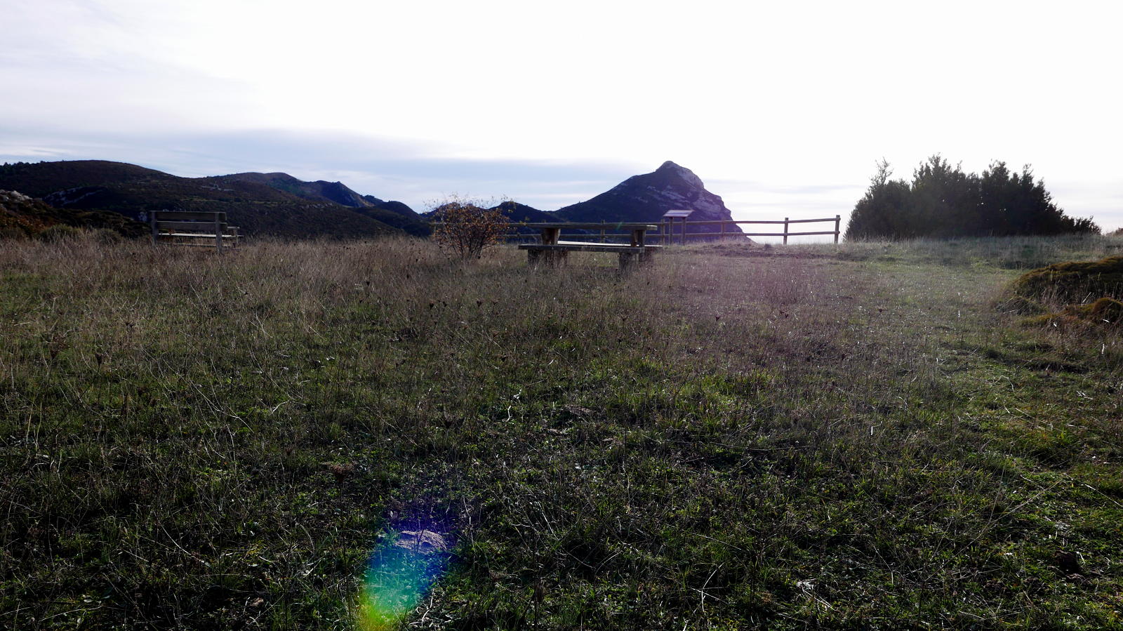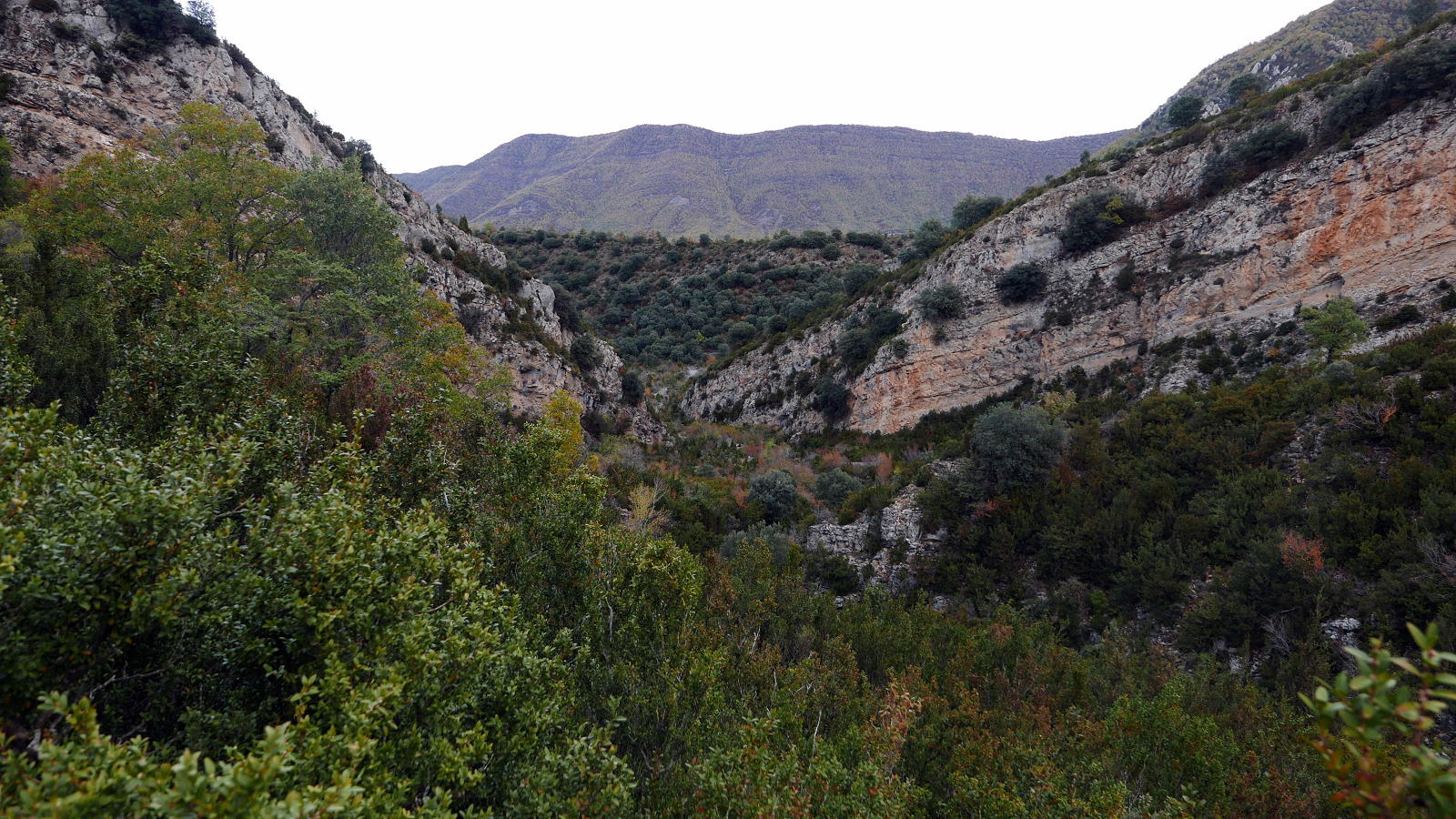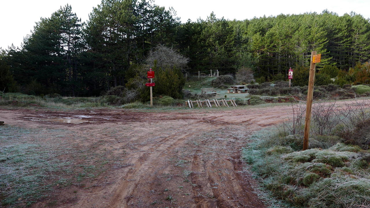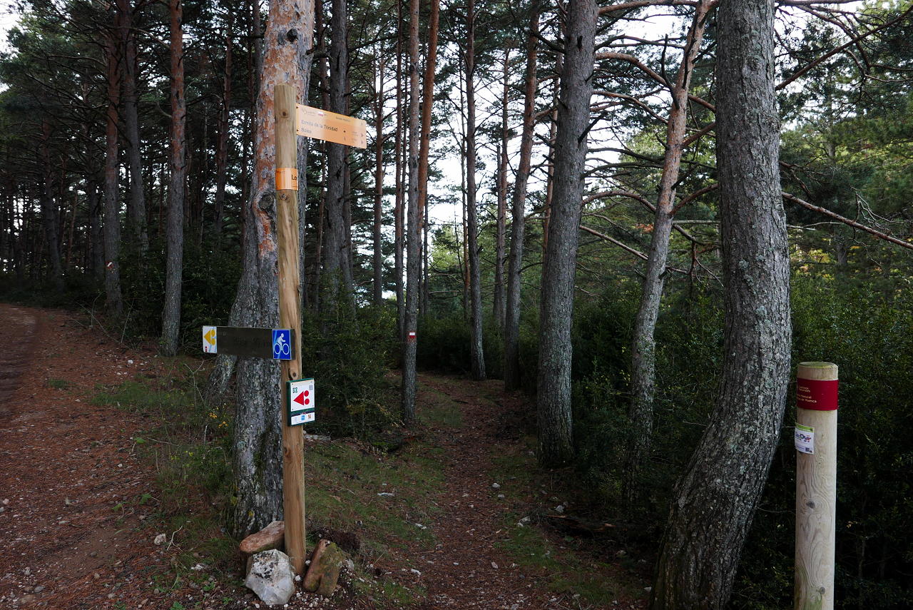 Toca continuar la cresta hacia NNW, en general un pelín por su derecha, hasta subir a una cota sin nombre que llamaré Punta Norte del Peiró (1501m 3h30′). Después retrocedo un poco hasta un punto en que hay un hito gordo que marca el descenso hacia el SW por una senda medio perdida, entre vegetación en un bosquete de quejigos, en algunos puntos hay que estar atento al GPS. Tiene fuerte pendiente y, con el barrillo y la hojarasca, está bastante resbaladiza. Por fin, más abajo, hay un cartel de madera (1330m 3h53′) que pone Bentué. Parece que el camino está más claro y desemboca en una pedrera (1115m 4h08′) recta para abajo.