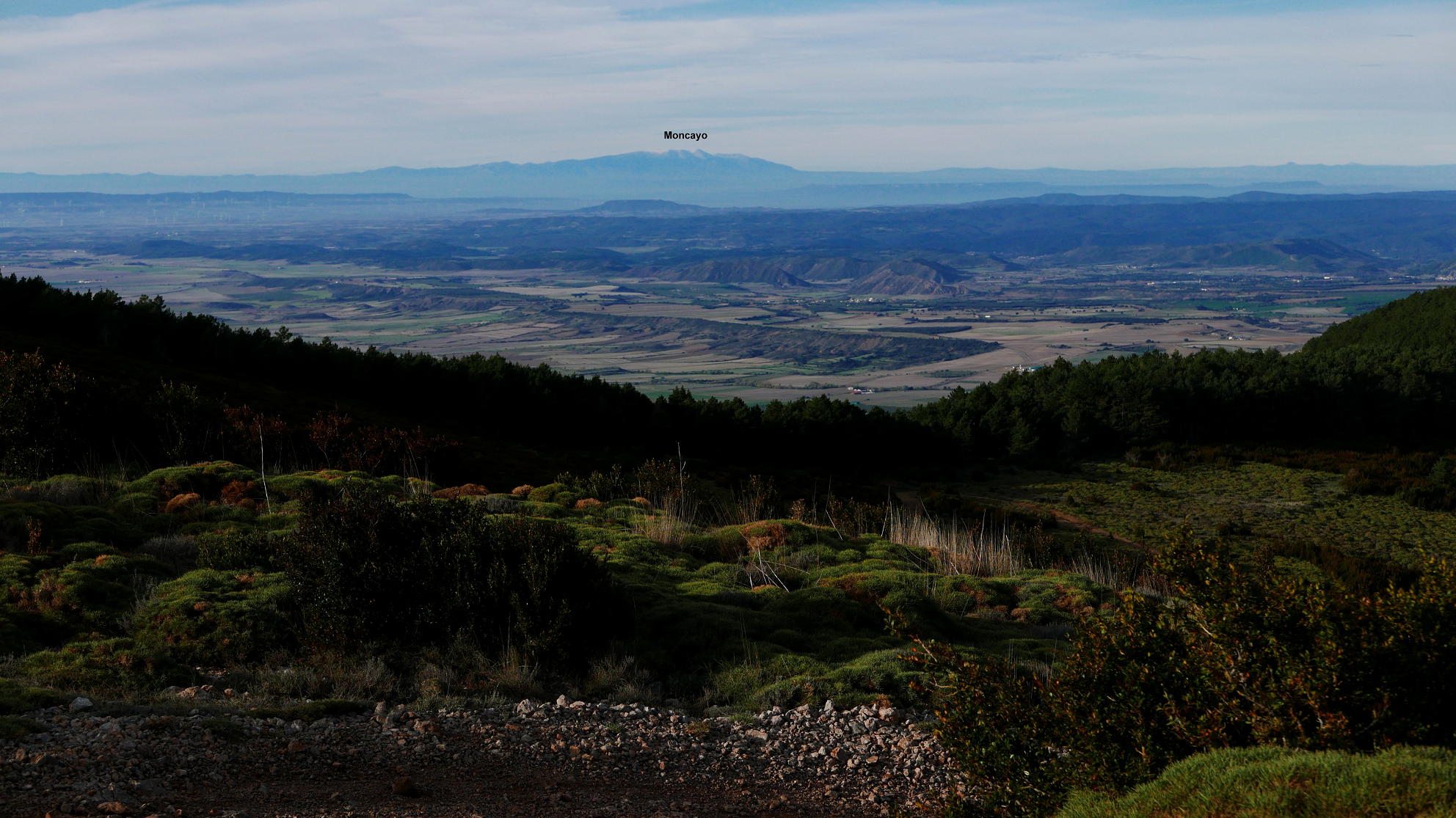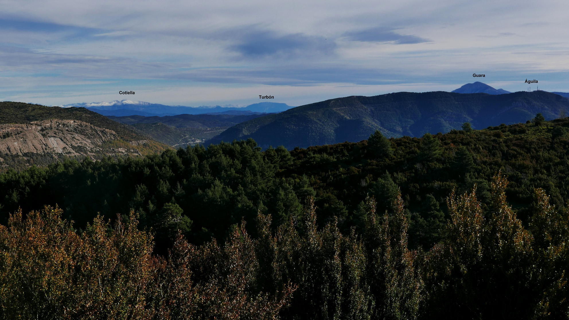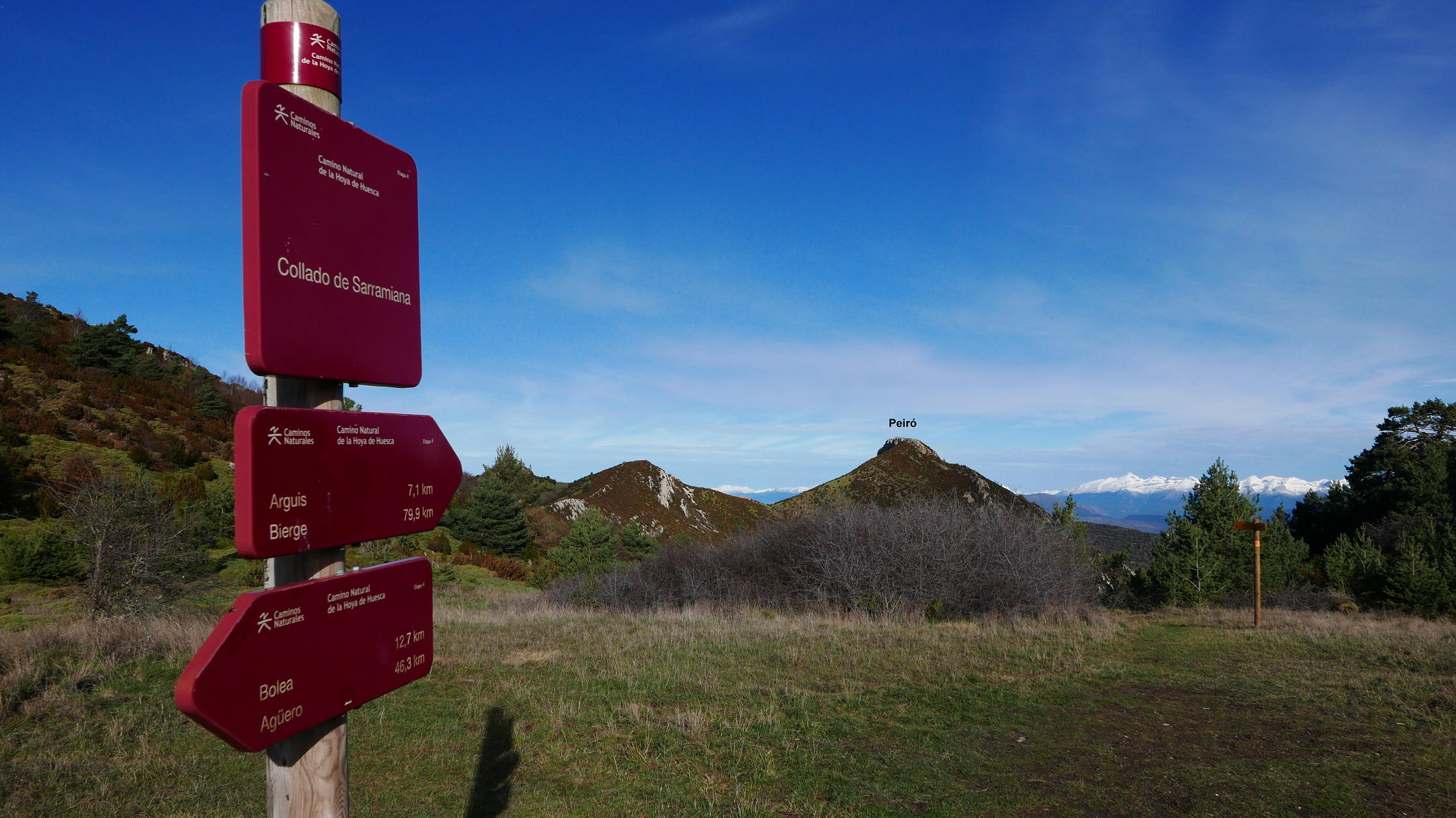 A la derecha se va a Naviella (Sierra Caballera). De frente salen dos caminos, uno a la ermita de la Trinidad y Bolea y otro es un camino para BTT. A la izquierda Hayedo de Peiró y Arguis. Esta última es la dirección a seguir, pero yo voy por un camino justo a su derecha que va más recto, ataja la pista y, un poco más arriba, desemboca en ella. Este va a ser un tramo de pista larga y pesada. Pasa junto a un mirador (1375m 1h42′) sobre la Hoya de Huesca. Bastante más adelante la pista sigue recta pero tomo un ramal a la izquierda (1380m 2h07′) que me lleva al collado Sarramiana (1497m 2h19′) con vista al Peiró y una amplia panorámica al Pirineo que ya está nevado.
