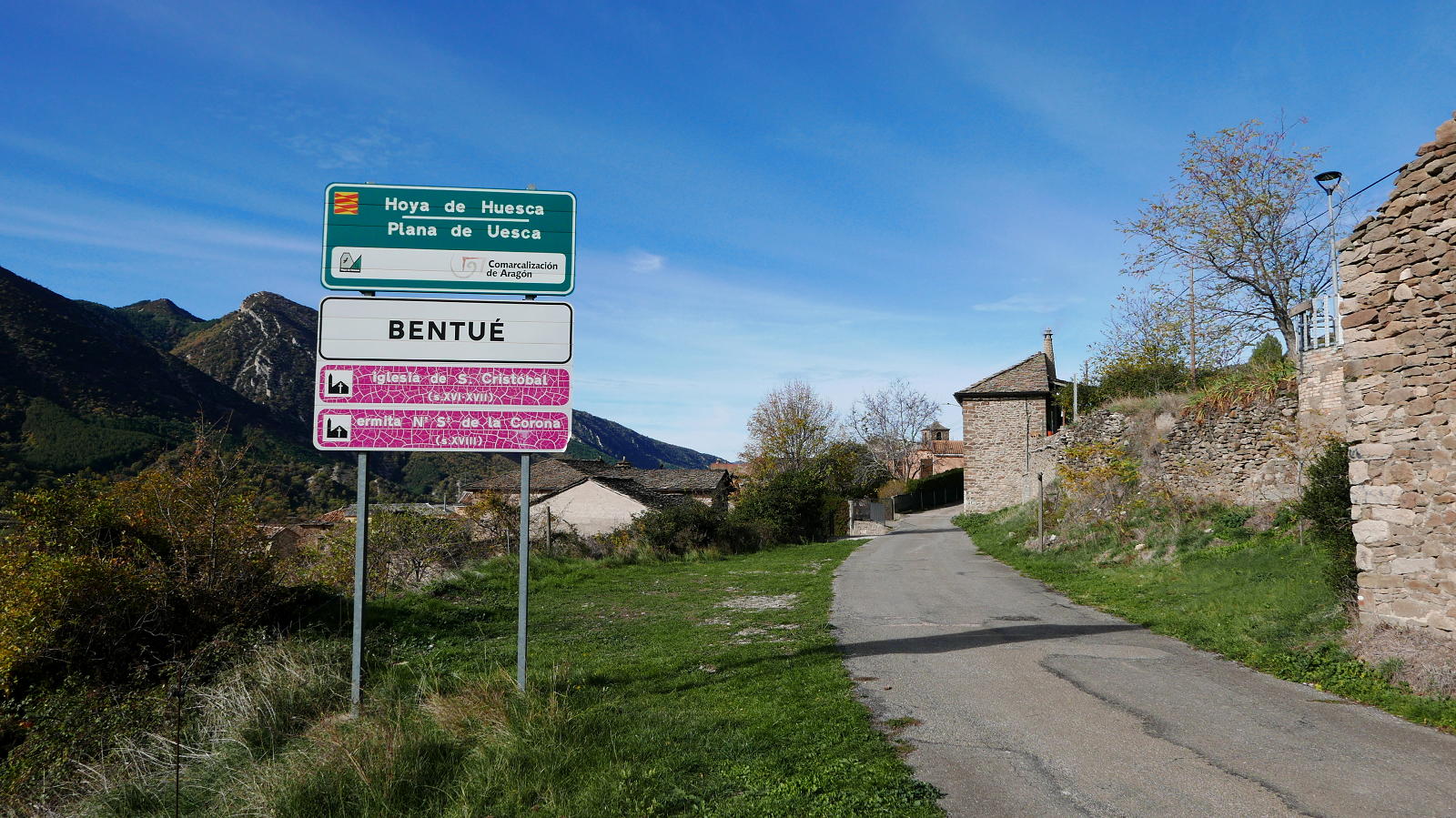 Acceso: En la A-23 de Huesca a Jaca, salir hacia Arguis, atravesar el pueblo y, cuando empieza la subida a Mesón Nuevo, tomar la desviación a la izquierda hacia Bentué de Rasal, es la HU-V3001, una carretera muy estrecha que en 8km llega al pueblo de Bentué. aparco en una placita delante de la iglesia, junto a la fuente.