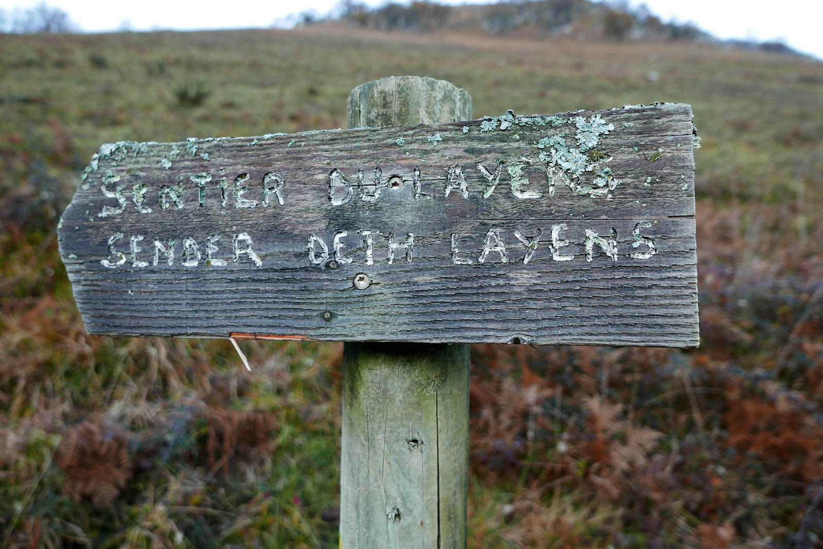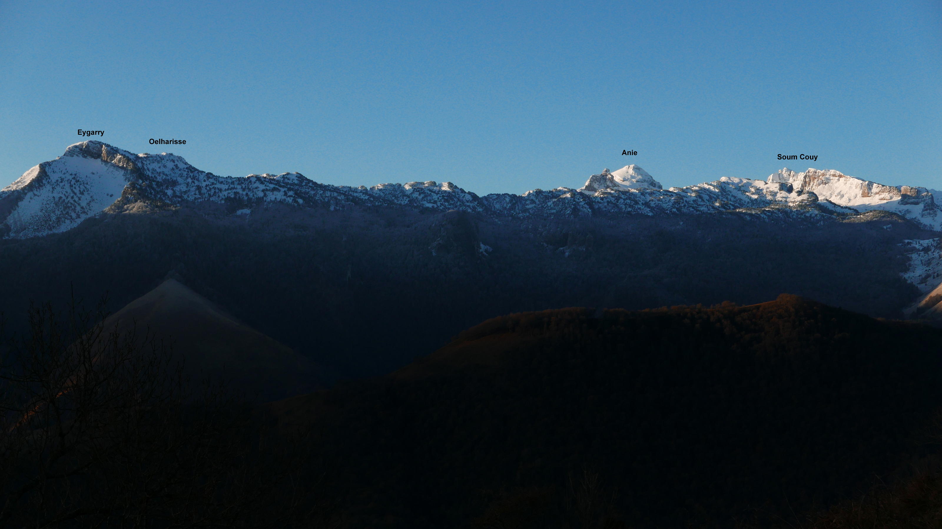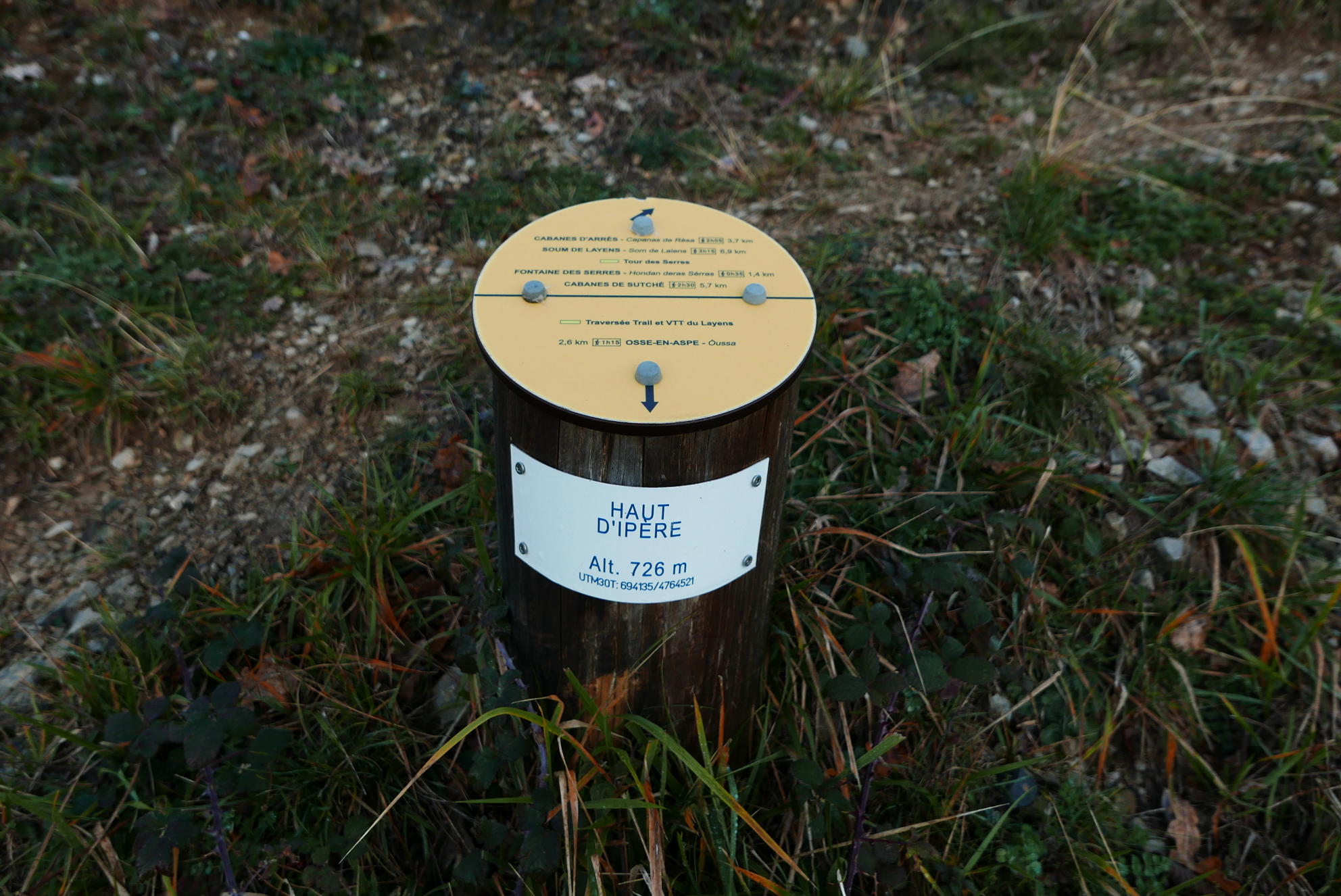 Descripción de la ruta: Osse-en-Aspe (435m). Salgo del pueblo por el NW, por un camino señalizado como Chemin de Coussaü, con pintura amarilla. El camino está balizado con postes, una primera bifurcación como Tousse de Coussau (575m 0h21′)) sigo a la izquierda dirección Soum de Layens; otro poste marcado como Labachotte (685m 0h32′) donde salgo a una pista que sigo a la derecha, y después un taco marcado como Haut d’Ipere (720m 0h39′) donde cruzo una carretera y tomo una senda. La senda empieza a ascender con zigzags la ladera SE del Soum de Lastutas. Un nuevo taco marcado como Bas de Serres (746m) marca una bifurcación y sigo a la izquierda el cartel de madera «Sendero del Layens». A mi izquierda ya se van asomando las cimas del circo de Lescun, con el Anie sobresaliendo entre ellas.