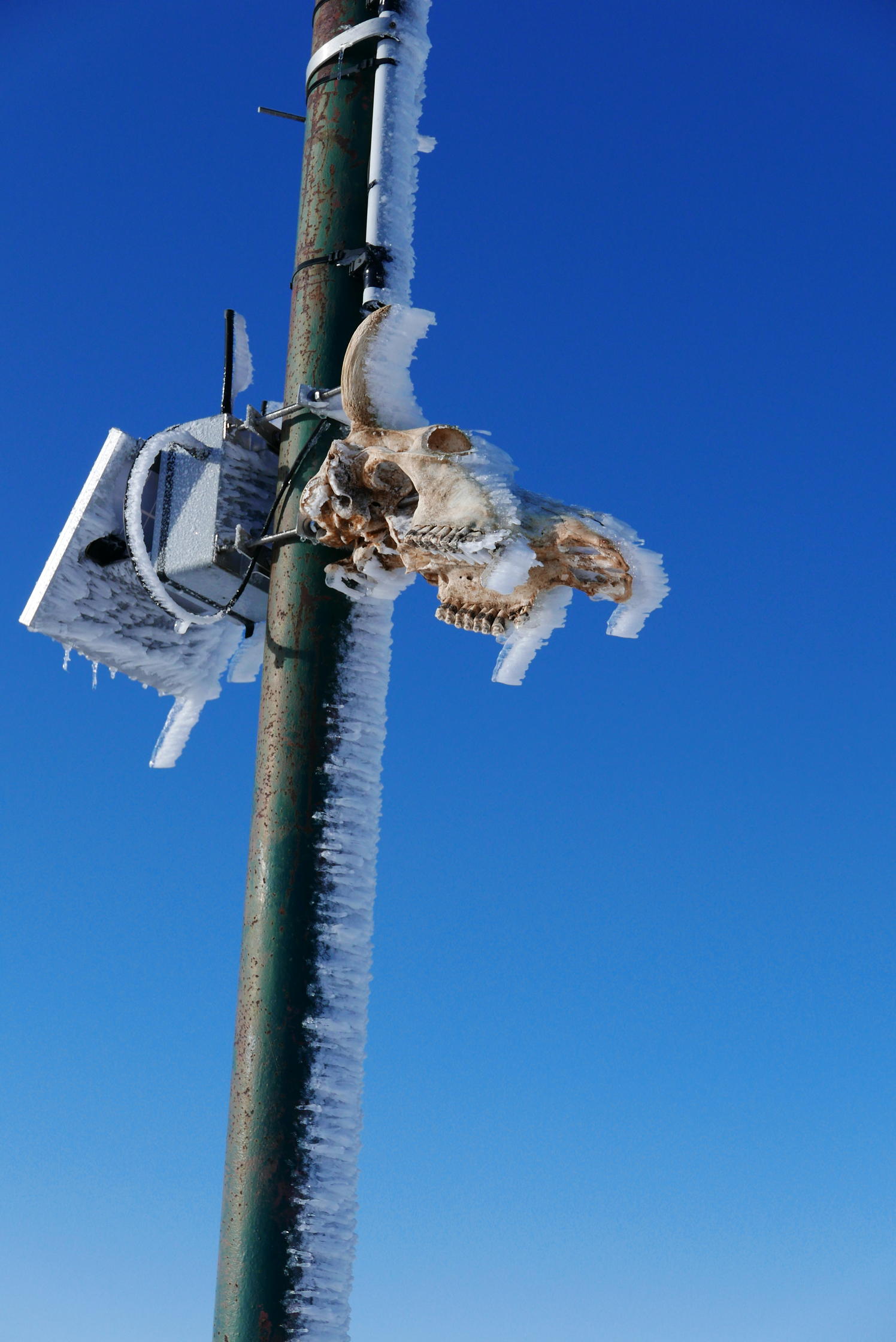 Tras esta fuerte subida llego a la cabaña de Arrès (1350m 1h47′) donde ya hay nieve y no se distingue muy bien el camino, pero es seguir faldeando en diagonal hacia arriba hasta la cabaña de Coum (Cabane de Coungies, en el taco) (1385m2h00′), justo bajo el Soum de Lastutas, zona con diversas sendas de ganado, yo voy tomando una vía algo más directa hacia arriba, por debajo de los resaltes rocosos de Lastutas para llegar a la cresta en un collado al oeste de Lastutas (en OpenTopoMap se llama Col de Sutche). Sigo el fácil lomo nevado hacia el NW con espléndidas vistas a los dos lados y el Layens como objetivo. Unos metros antes de la cima hay una antena con un cráneo de vaca cubierto de hielo venteado y rápidamente corono el Layens (1625m 2h39′). Visto y no visto, unas espesas nubes cubren la zona así que, sin perder mucho tiempo, empiezo un descenso con muy poca visibilidad y ambiente puramente invernal.