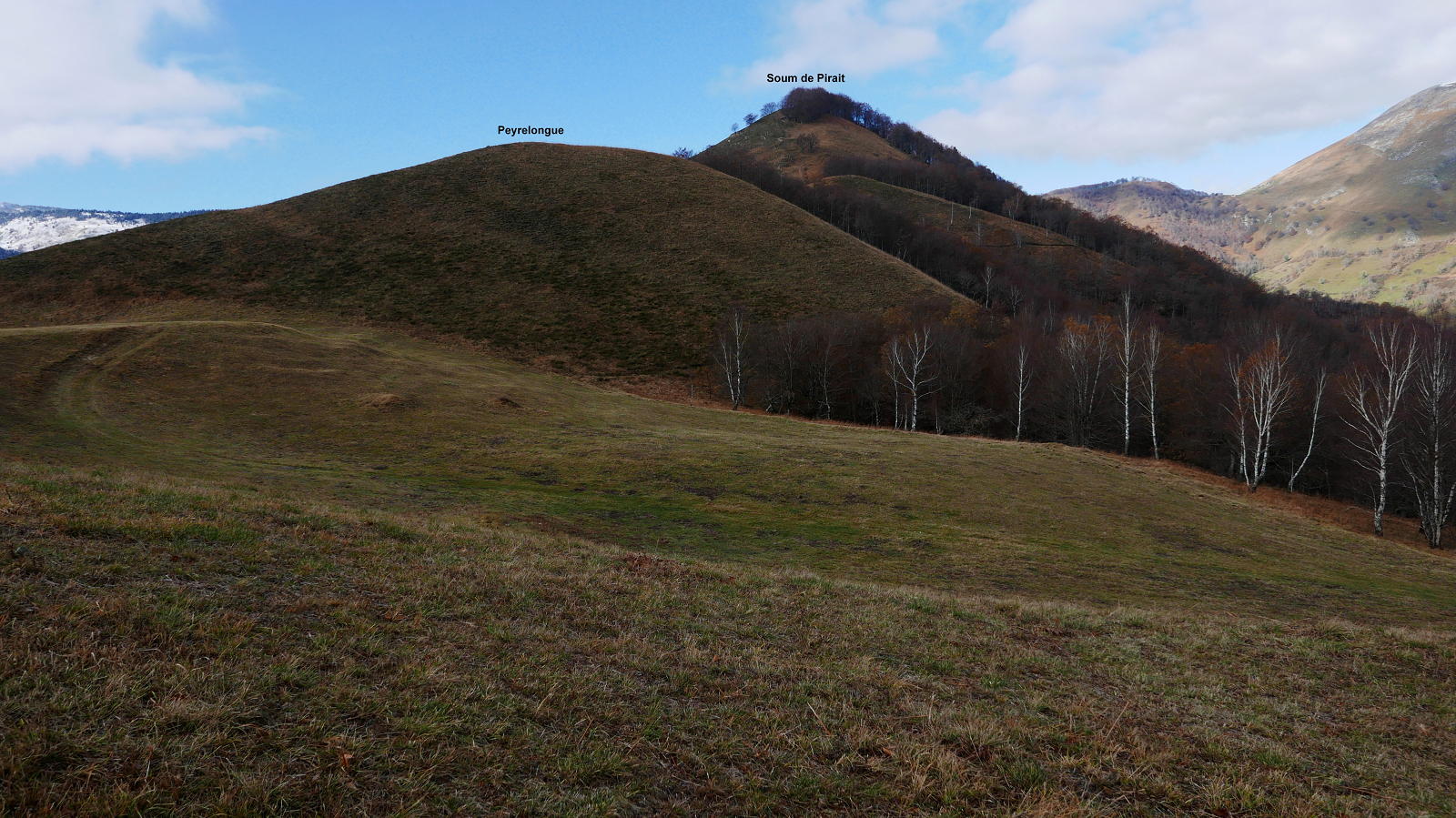 Por el collado pasa una pista que, en ascenso, también sube al Layens más suavemente que la bajada que yo he hecho, y en descenso, al principio cementada y luego asfaltada, va al col de Hourataté (1010m 3h44′). Aquí hay un poste y sigo dirección Plateau de Pirait, un buen camino por el bosque en ligerísima subida hacia el SE. En una bifurcación hay que ir recto a la derecha (1060m 3h58′) hacia una barrera canadiense y una zona de prados, donde giro a la izquierda para ascender por una senda entre los pastos al Soum de Pirait (1126m 4h05′) que tiene una piedra cúbica en su cima con una X grabada.