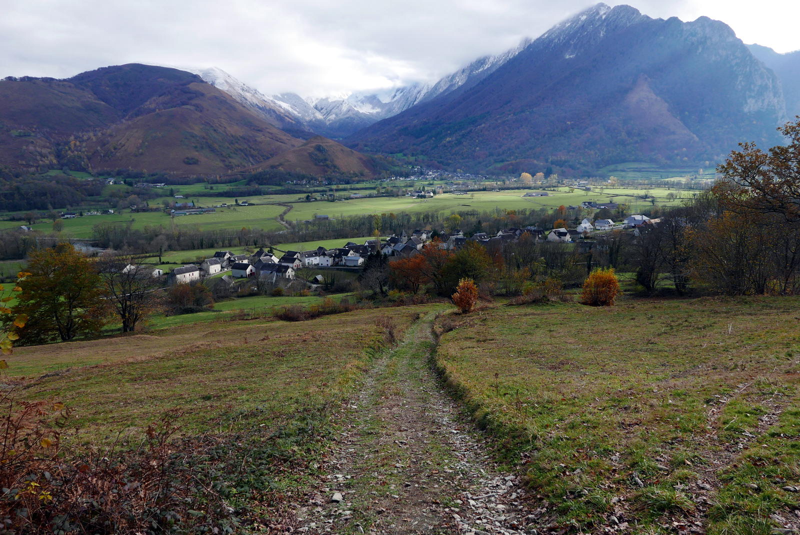 El descenso hacia el SE por una difusa senda sobre el suave lomo hasta que encuentro de nuevo señal de pintura amarilla (970m 4h17′) en una cota que el IGN francés rotula como Soum de Peyrelongue, pero que no tiene ninguna entidad. Siguiendo la senda desemboco en un camino( 920m 4h26′) (podría haber atajado por prados esta curva) y lo sigo hacia la derecha. Tras descender unos zigzags desemboca también en una pista (780m 4h36′) con un poste para seguir dirección hacia Athas. Un poco más abajo dejo la pista por un atajo a mi izquierda, todo el rato ya es senda balizada hasta entrar en Athas (430m 5h01′) por un camino entre prados de pasto para ganado.