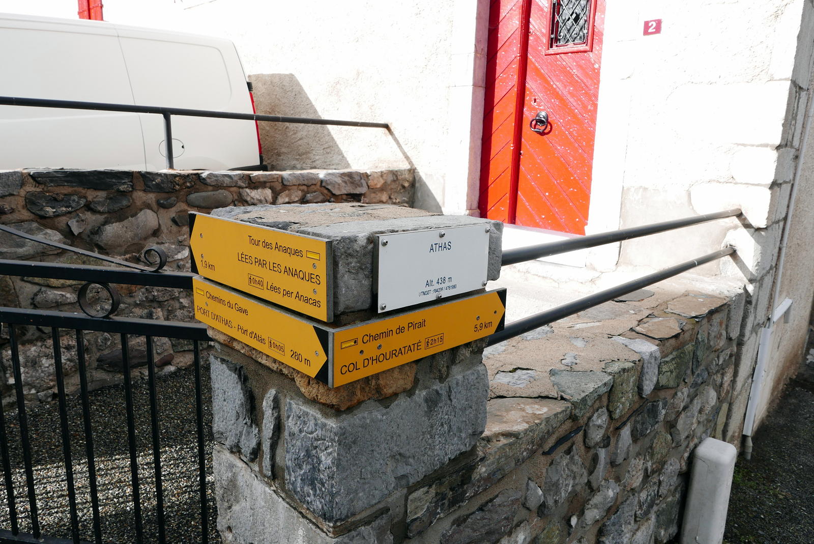 Atravesando Athas tomo la carretera D237. Hay un desvío de un camino a la izquierda señalizado con un poste que pone «la Moulette, Panorama de Lagunse, Osse an Aspe», pero veo que es un camino que empieza a subir mucho y no tengo muy claro por dónde continuará, así que vuelvo a la carretera que enseguida entra en el pueblo de Osse-en-Aspe, donde callejeo hasta el aparcamiento (435m 5h18′)