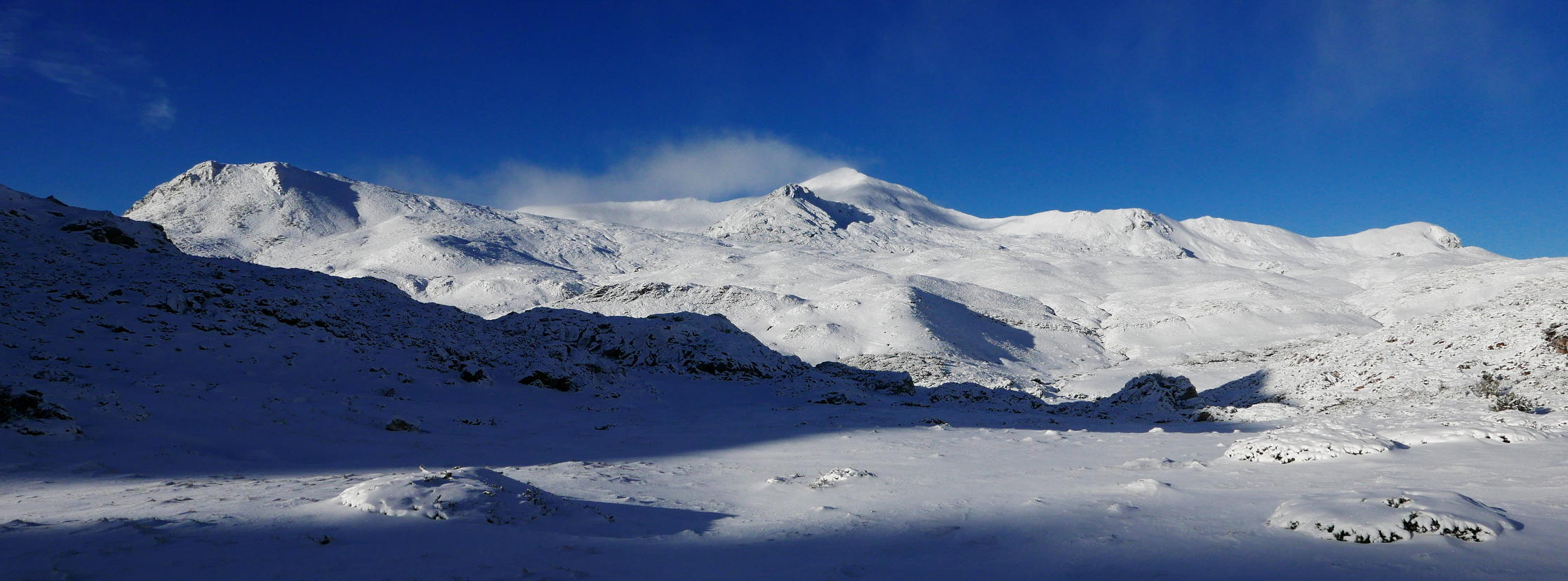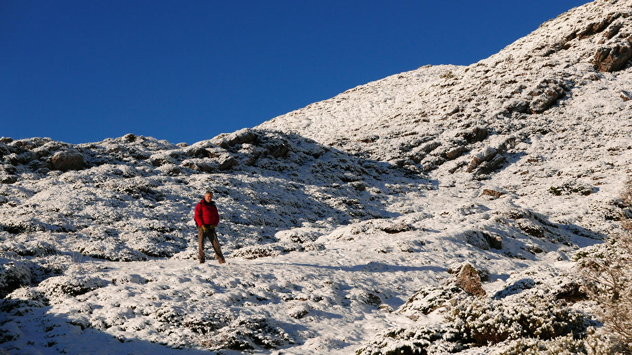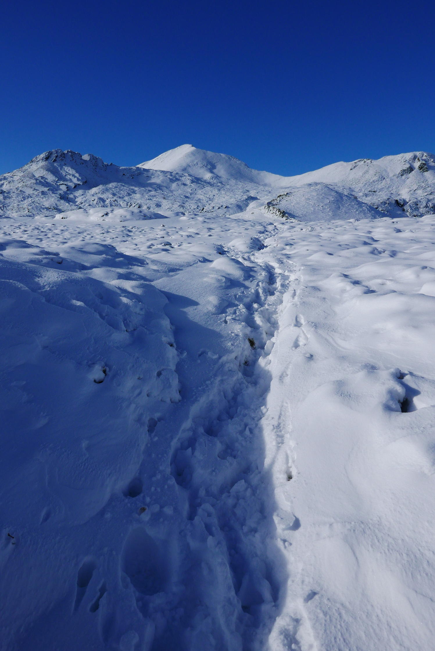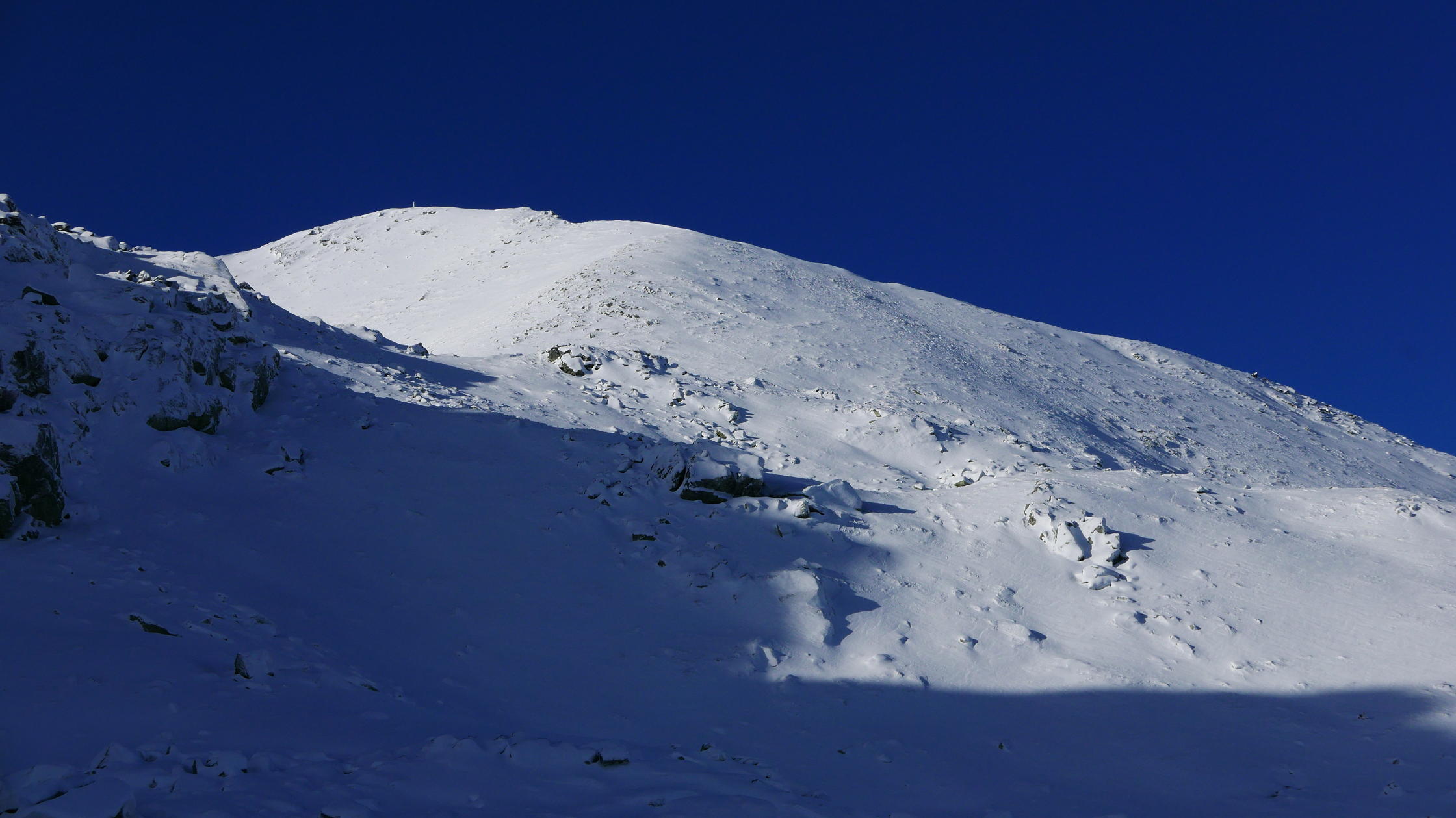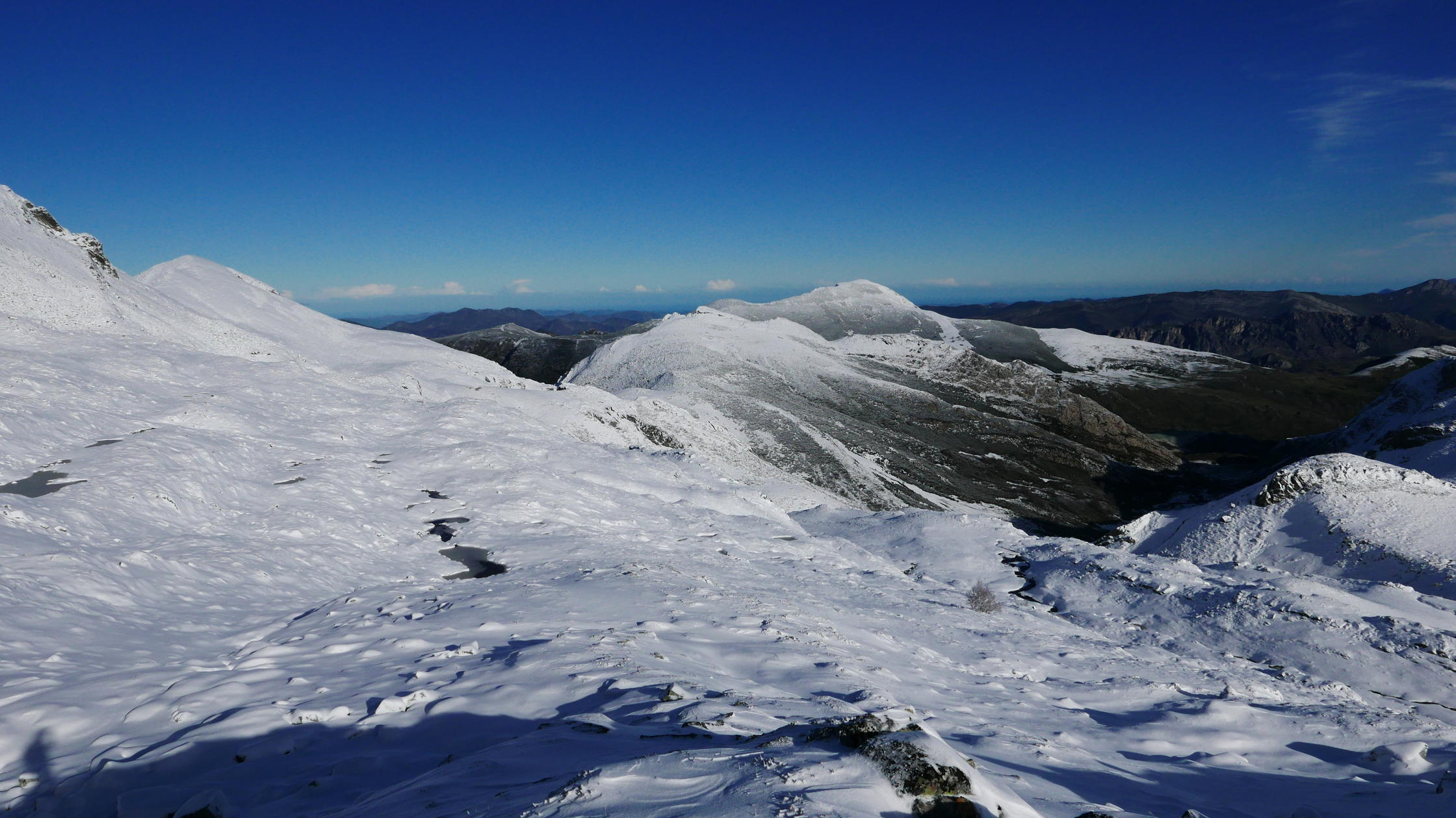 La nieve ralentiza nuestro paso y Luigi, algo cansado, decide darse la vuelta. Yo avanzo un poco más, hasta los 2000m de altura, pero cada vez es más profunda la nieve y, a pesar de que no me parece que haya problemas hasta la cumbre, creo que se me va a hacer muy largo y no quiero dejarlo solo tanto tiempo, así que también me doy la vuelta a pesar de tener el hito cimero a la vista. Disfrutamos de una preciosa mañana y unos paisajes tapizados de nieve fresca que todavía nadie ha pisado.