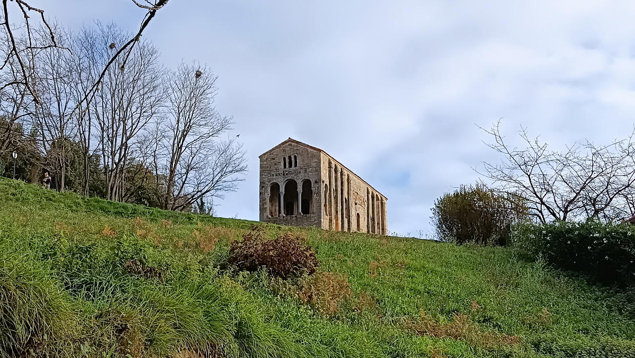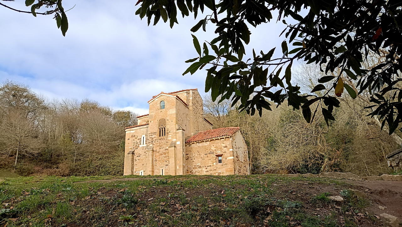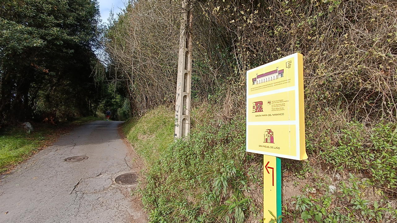 La carretera sale de la ciudad siguiendo la avenida de los Monumentos hasta que encuentro un camino que se desvía a la derecha (315m 0h32′), con una barrera y una señal que solo permite el paso a peatones. Más arriba cruza la carretera y asciende hasta el Centro de Recepción e Interpretación, quedando a la derecha el aparcamiento y un poco arriba a la derecha Santa María del Naranco (350m 0h37). Dejando la ermita a la derecha, el camino continúa hasta San Miguel de Lillo (385m 0h40′).