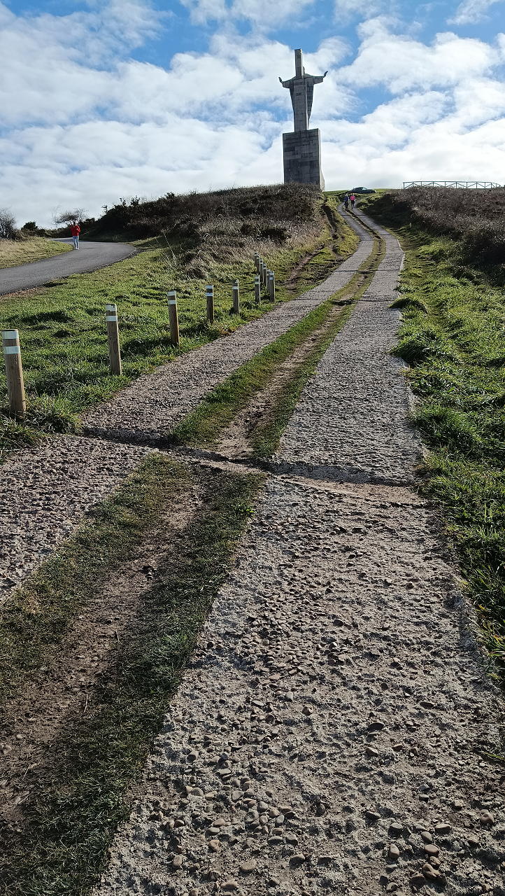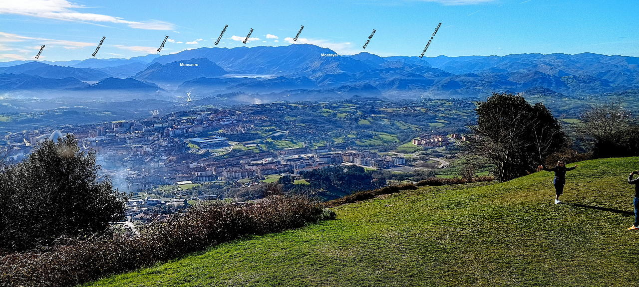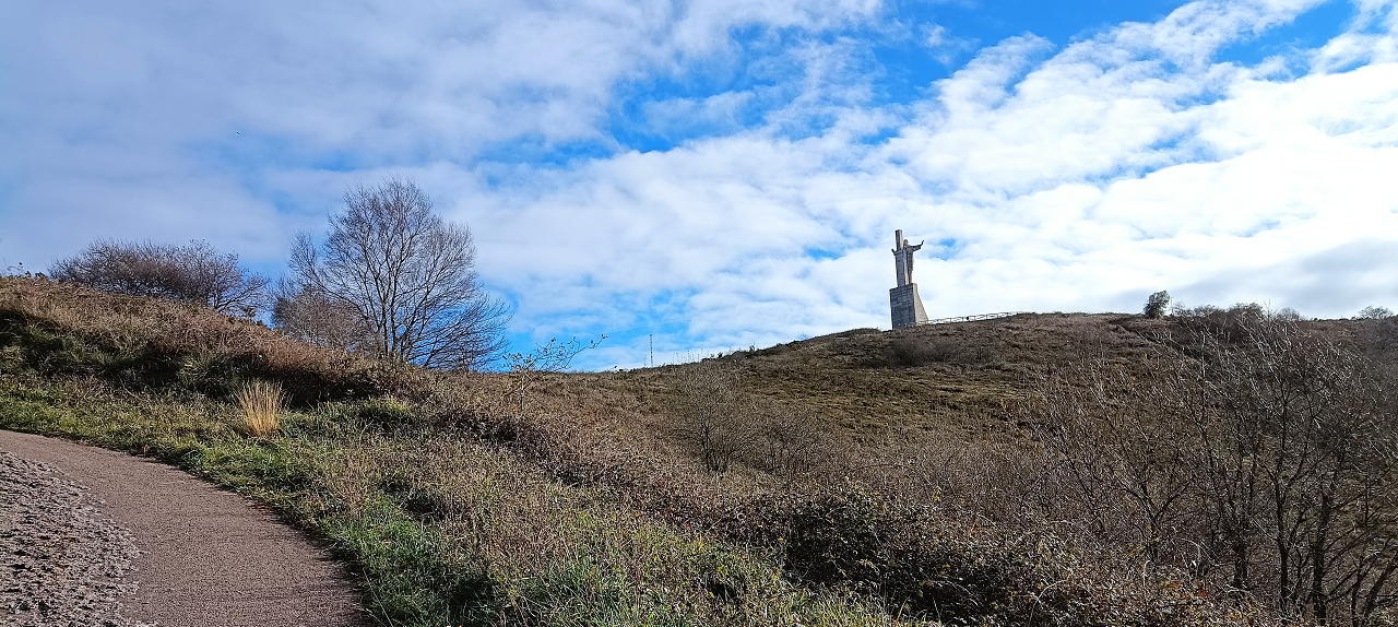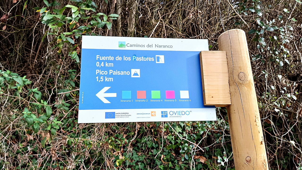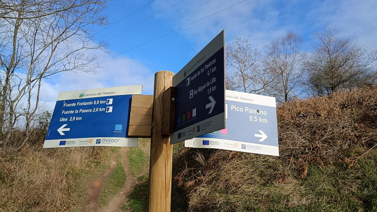 Allí me equivoco y sigo por un camino en fuerte subida hacia el NW que se dirige a Ulés, así que tengo que retroceder a la ermita, salir a la curva de la carretera y tomar un camino asfaltado que sube a la izquierda de la carretera (NNW) por zona boscosa. Habrá que seguir este camino sin pérdida con indicaciones hacia el Pico Paisano. Desemboca en la carretera, al oeste del Naranco, con el gigantesco Corazón de Jesús a la vista. Pico Paisano (636m 1h04′). El mirador merece una parada y una vista reposada del entorno.