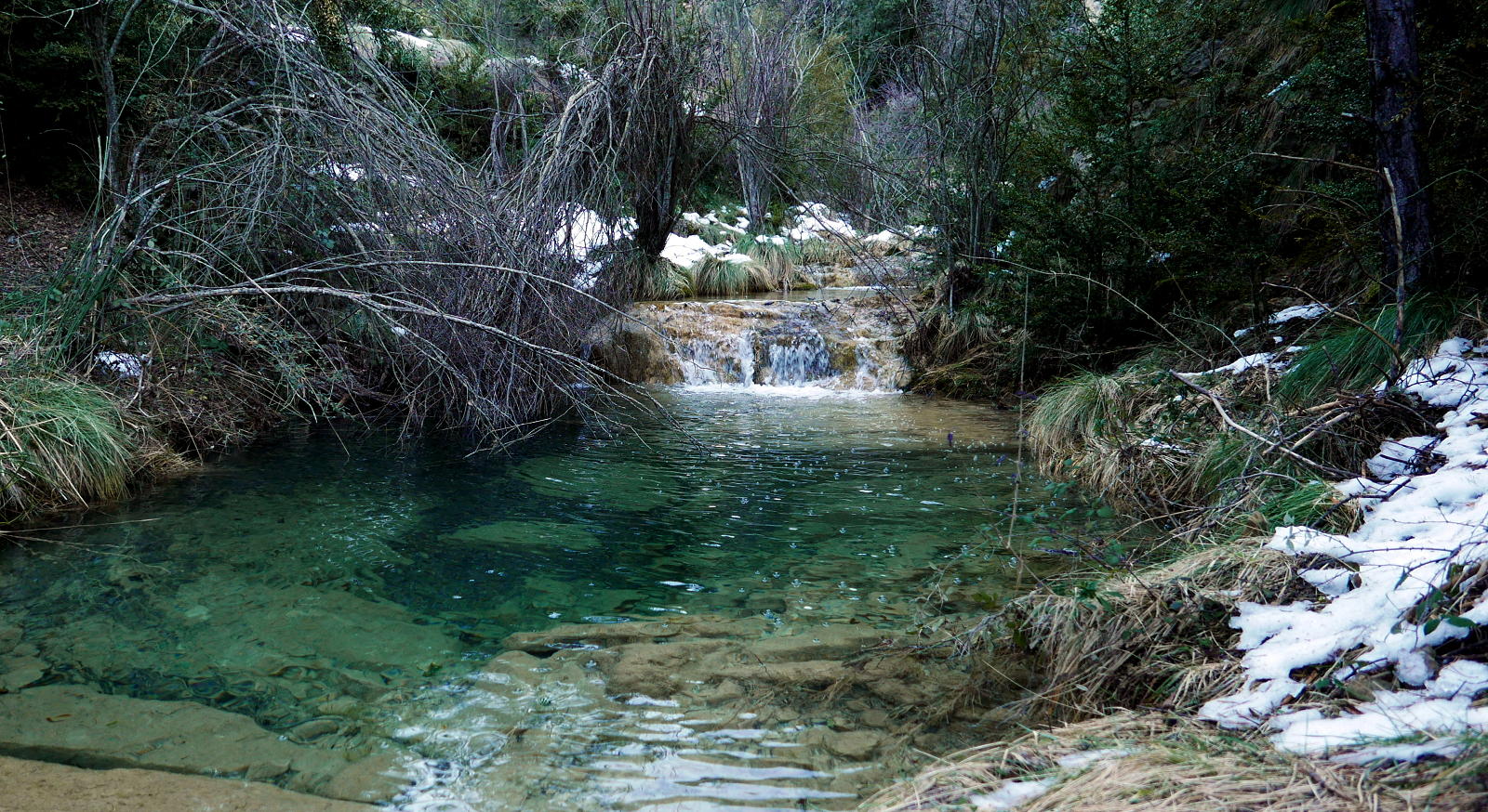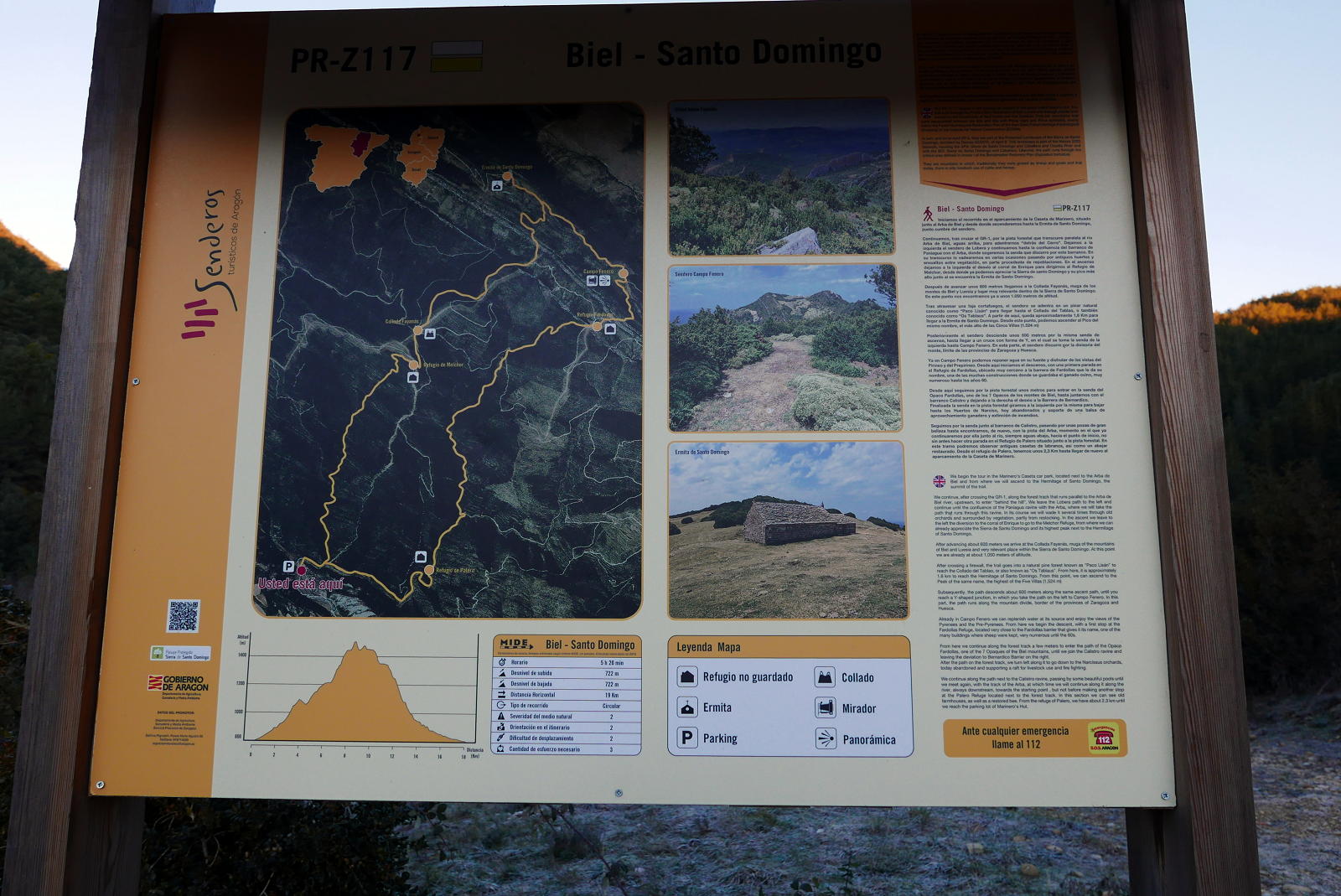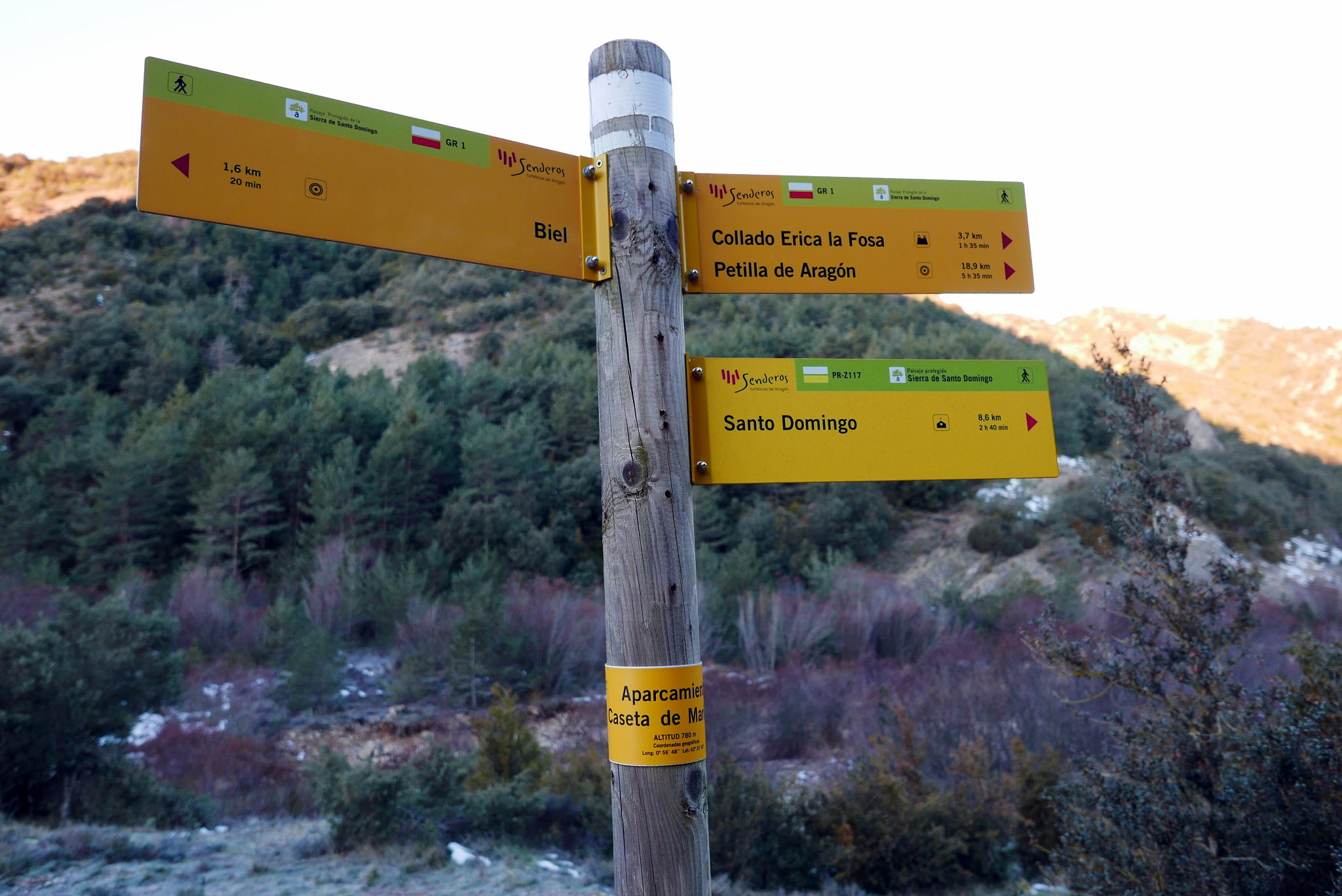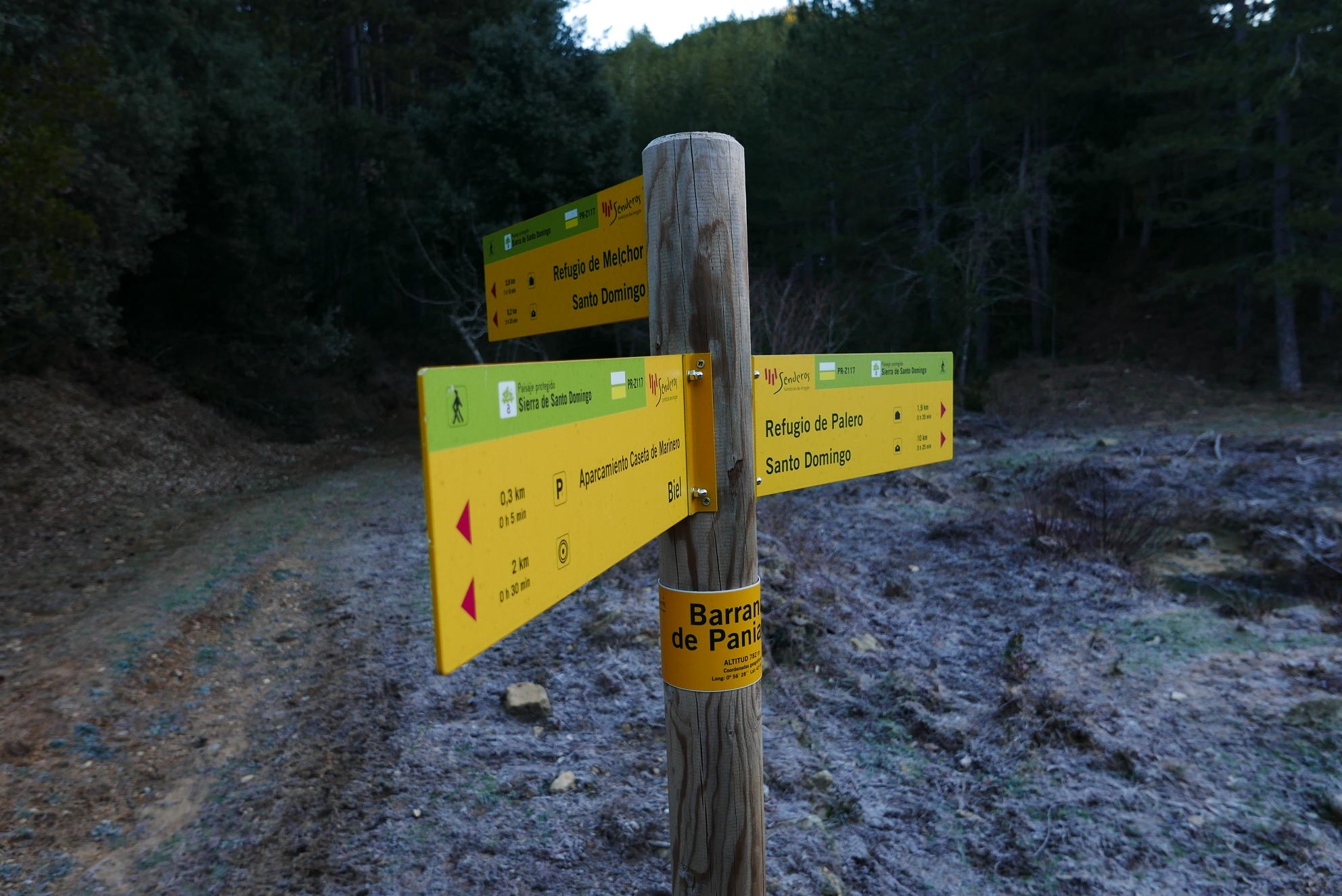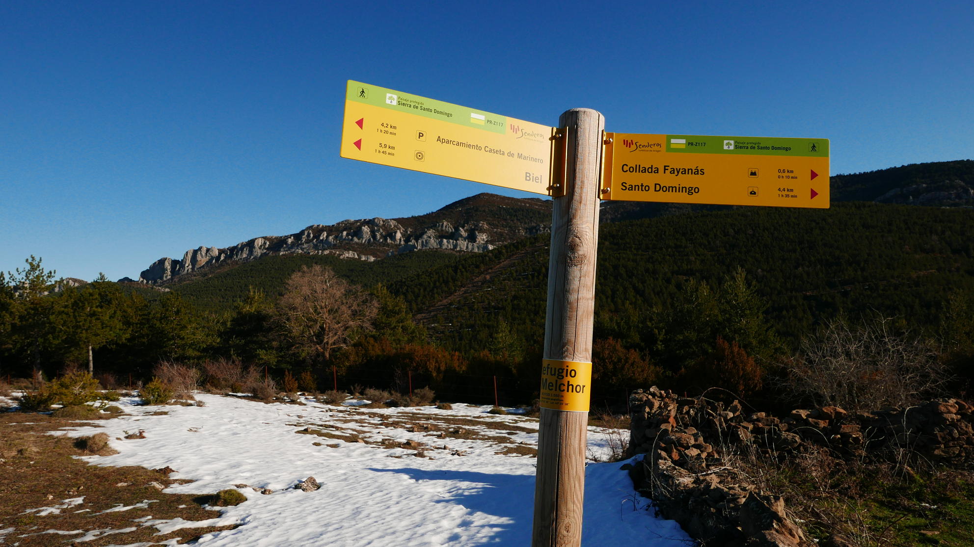 Descripción de la ruta: Aparcamiento Casetas de Marinero (780m). Continúo la pista que es el GR-1, Paso el puente sobre el río Arba de Biel. Unos metros más adelante tomo una desviación a la izquierda señalizada como PR-Z-117 que se interna en el barranco de Paniagua. La senda progresa junto al cauce, cruzándolo en 15 ocasiones, aunque siempre hay algunas piedras estratégicamente colocadas para facilitar el paso (supongo que en temporadas de crecida la cosa se complica). Sigo siempre la señalización que indica hacia refugio Melchor/Santo Domingo.