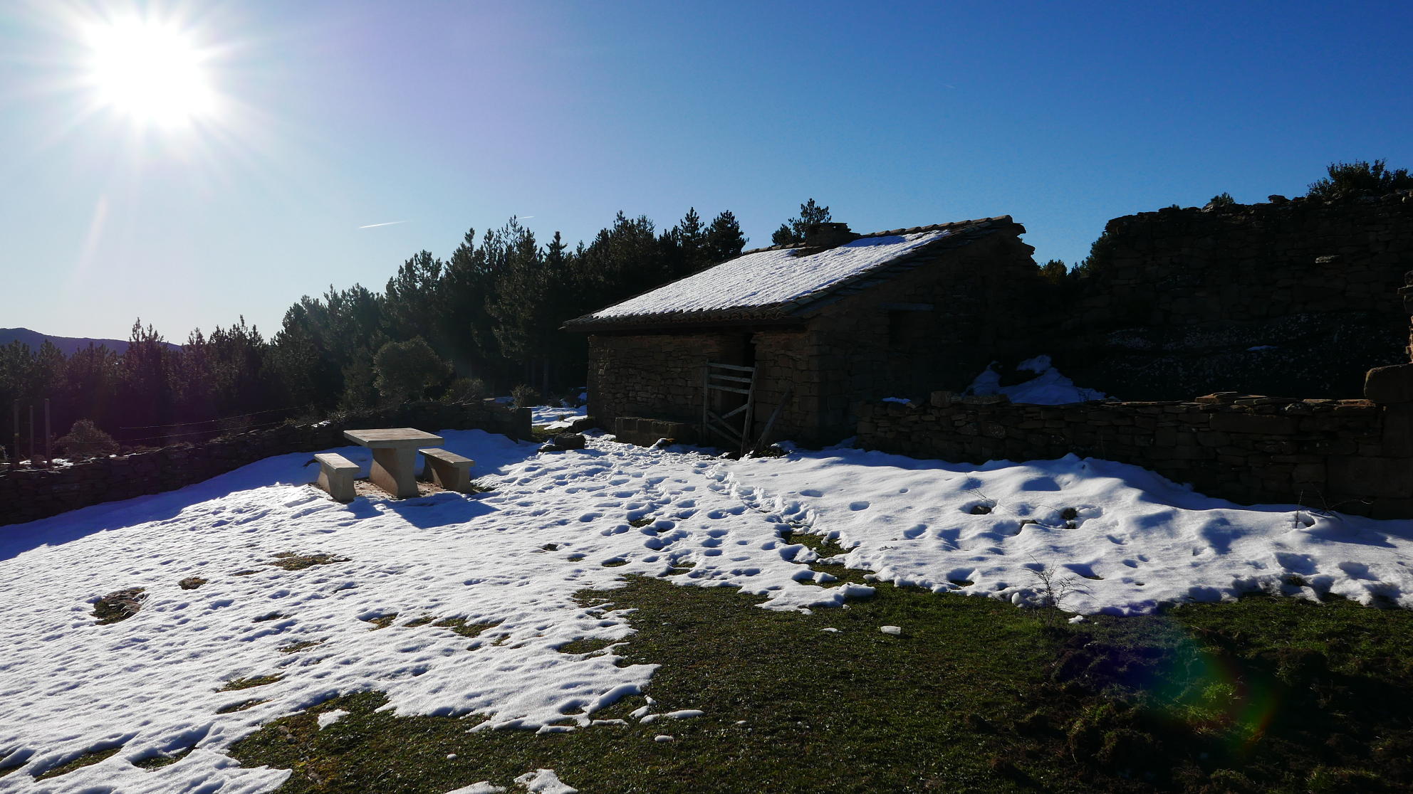 Paso por un cartel que me indica a la derecha (895m 0h40′). Un poco más arriba cruzo el barranco por última vez (925m) y el camino asciende alejándose del cauce por un denso pinar. Se sale a cruzar una pista, al otro lado está el refugio Melchor (1085m 1h02′), abierto y con una mesa y bancos al exterior, por fin salgo a una zona abierta y al sol después de toda la subida sombría. Pasado el refugio continúa un camino que sale a una pista (1050m 1h24′) (ojo porque a la vuelta sigo unos metros por la pista sin darme cuenta de tomar este camino de nuevo al refugio, pero es descuido mío ya que la balización es buena con postes pintados de verde o postes del PR con amarillo y blanco).