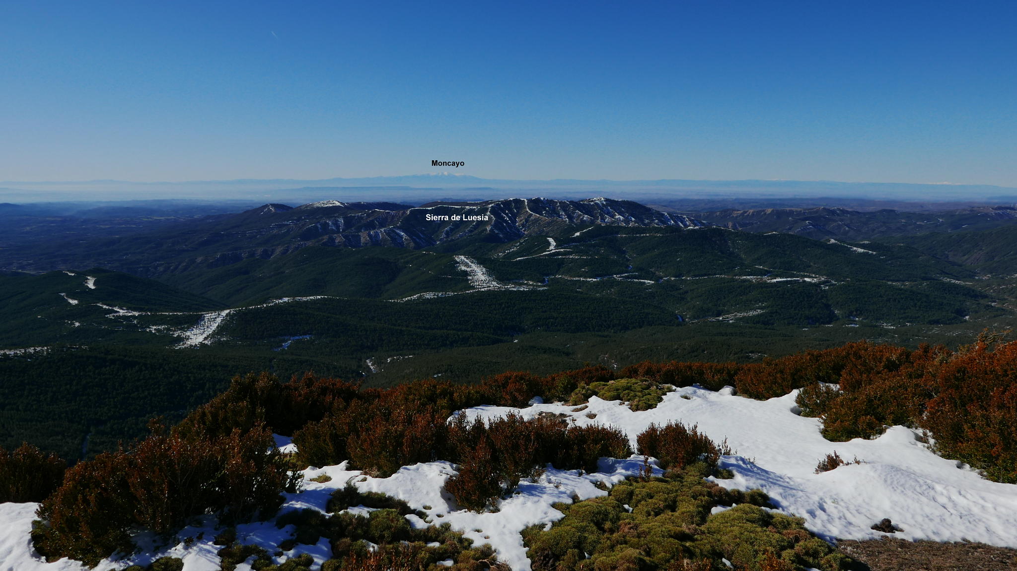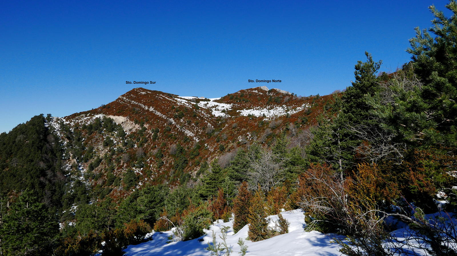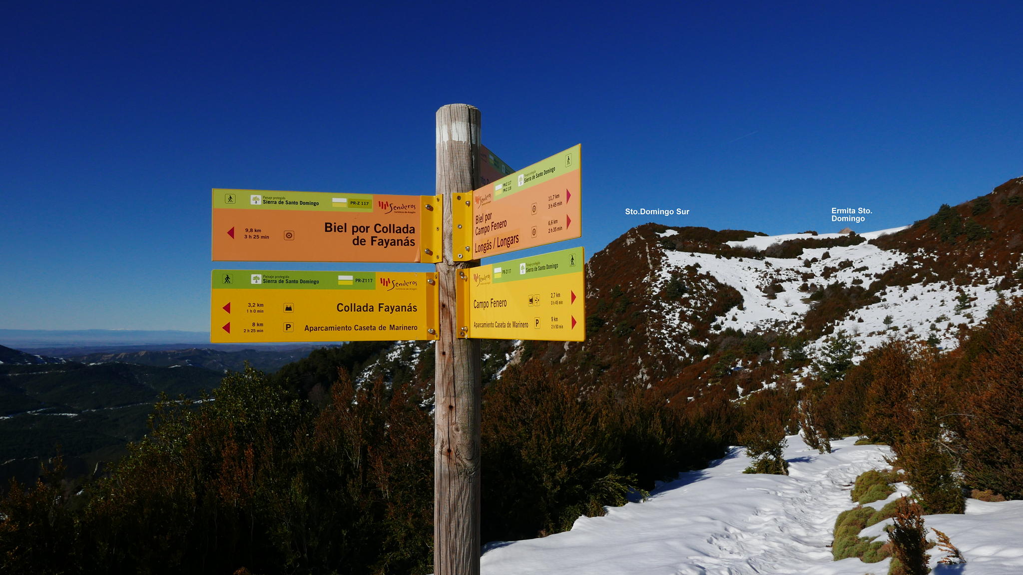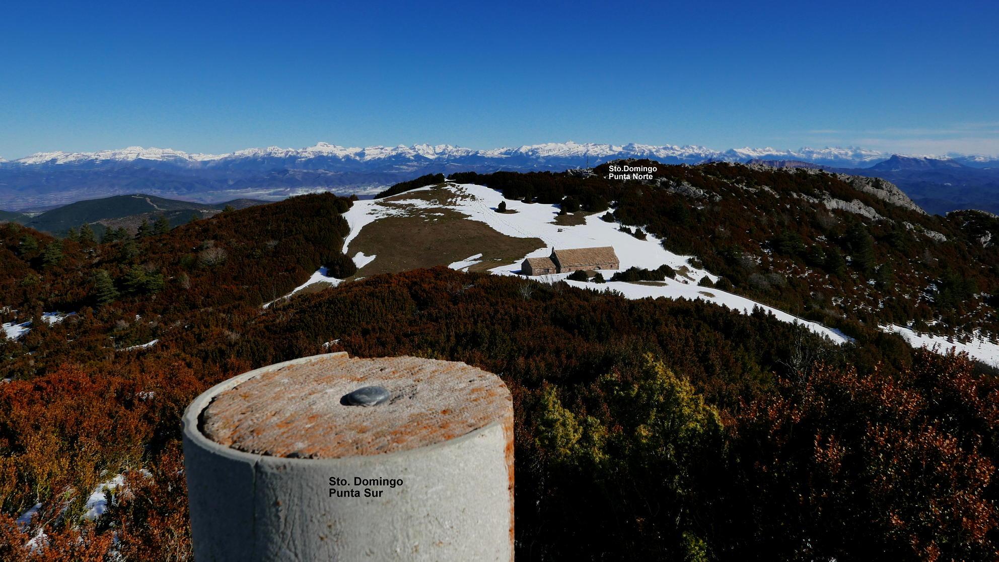 Dejo la pista por un desvío a la izquierda a la altura del collado del Tablado (1200 2h02′). Comienza una senda en ascenso por bosque de quejigos. Esta senda se une a la que viene de Longás (1435m 2h31′). Ya cerca, pero con nieve más profunda, se encuentra el collado con la ermita de Santo Domingo (1503m). A derecha e izquierda están los dos picos. Primero accedo al pico Norte (1523m 2h50′) con una gran mesa de orientación y una casita de metal en la cumbre. Después, con nieve hasta las rodillas, al pico Sur (1524m 2h58′). Ambas cumbres tienen una amplísima vista, pero más espectacular la del pico Norte.