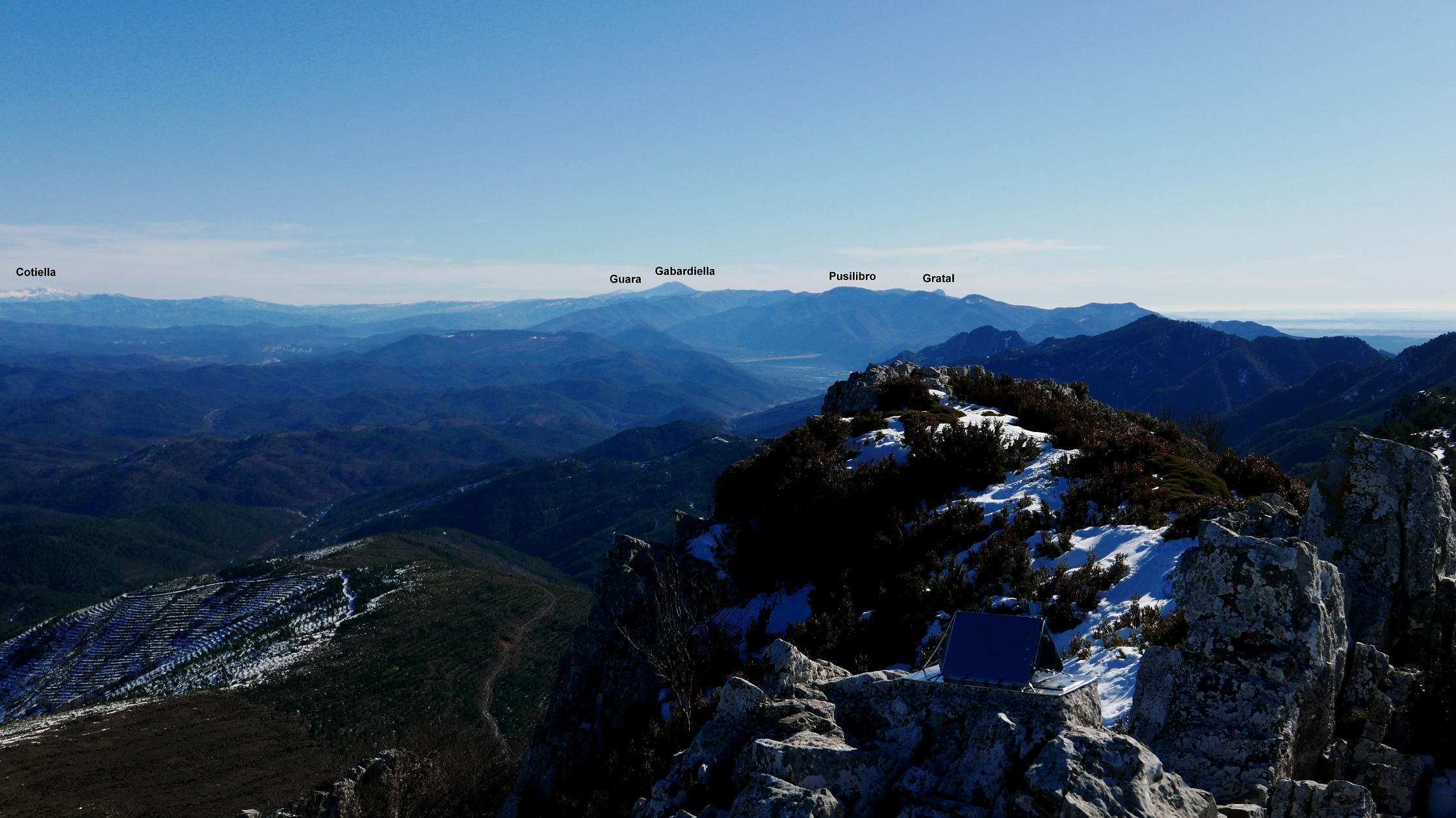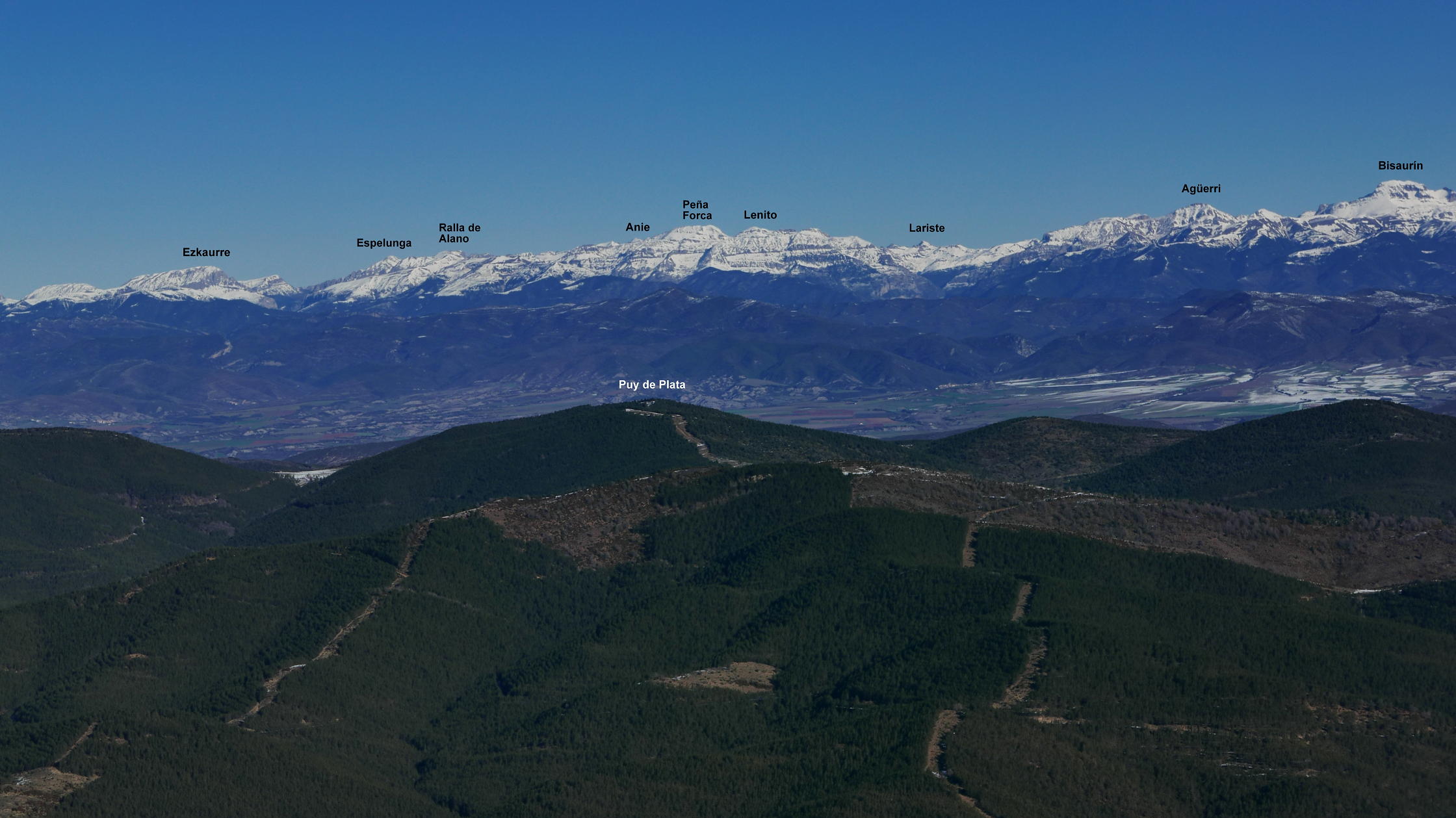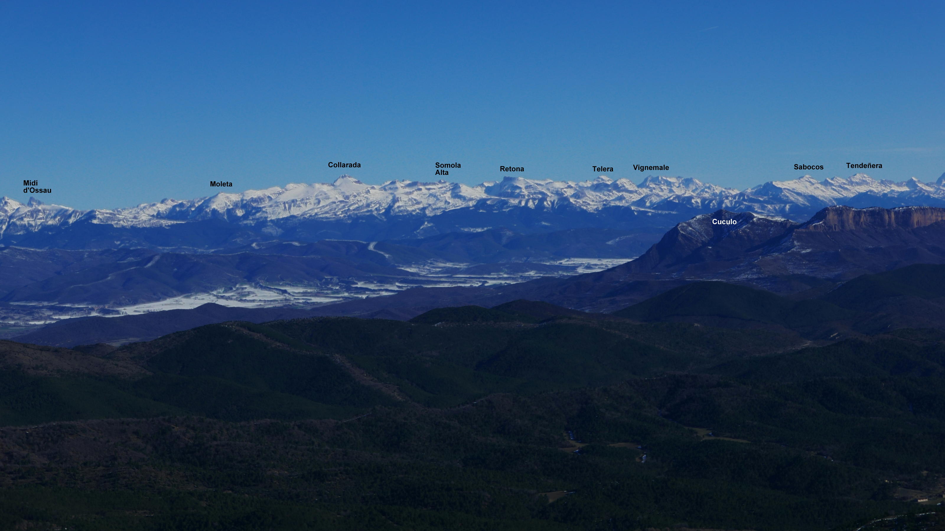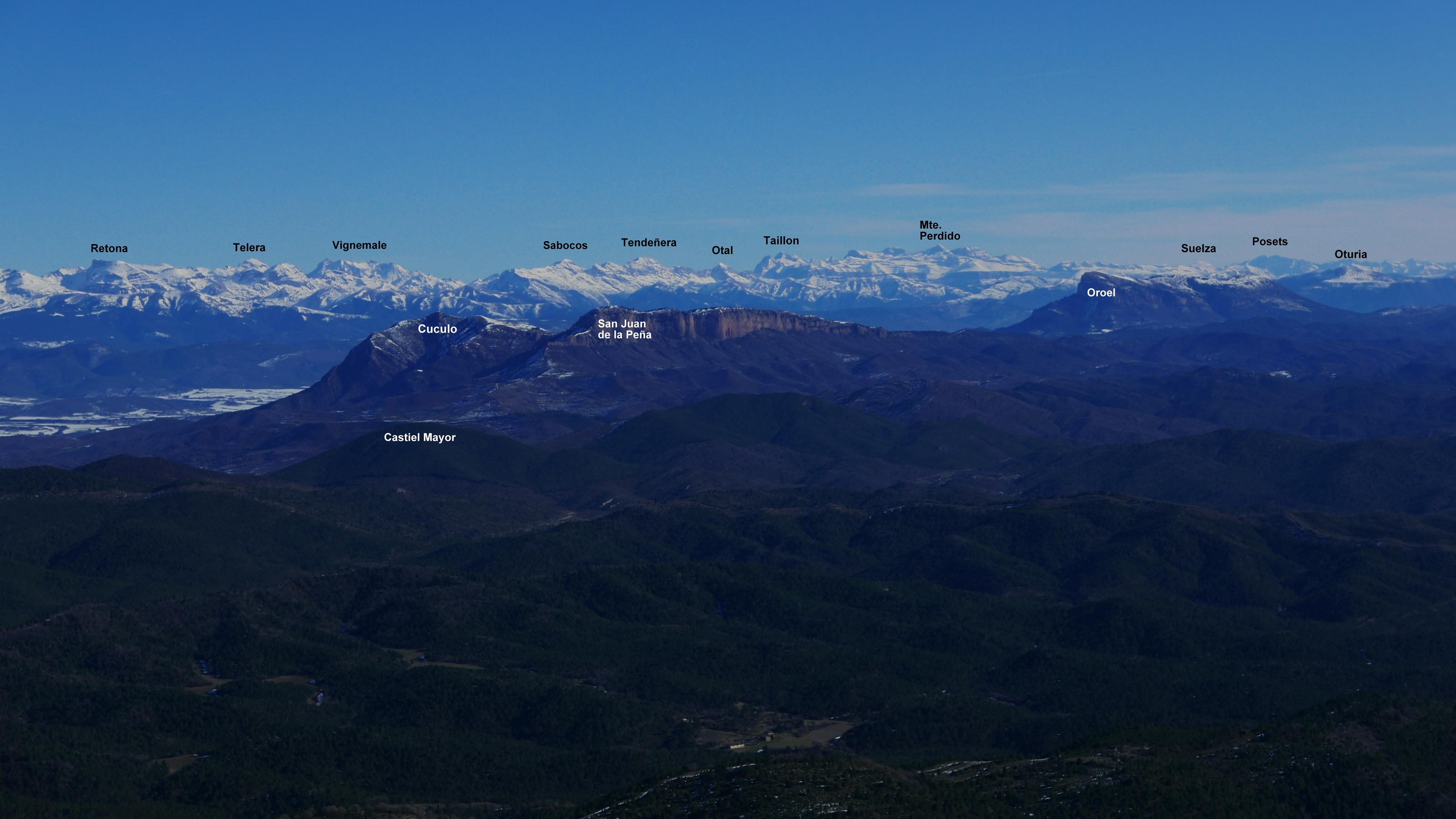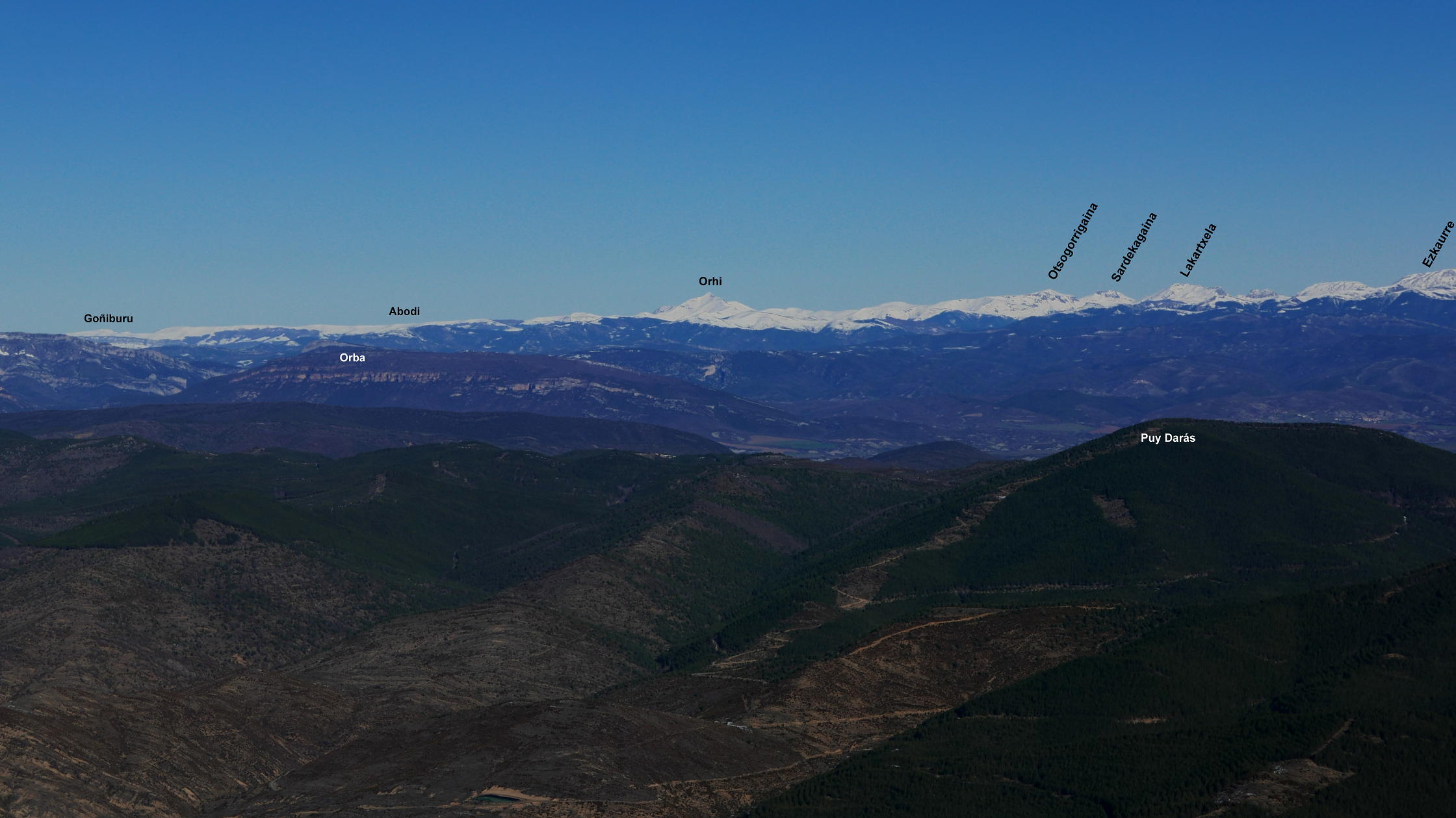 Dejo la pista por un desvío a la izquierda a la altura del collado del Tablado (1200 2h02′). Comienza una senda en ascenso por bosque de quejigos. Esta senda se une a la que viene de Longás (1435m 2h31′). Ya cerca, pero con nieve más profunda, se encuentra el collado con la ermita de Santo Domingo (1503m). A derecha e izquierda están los dos picos. Primero accedo al pico Norte (1523m 2h50′) con una gran mesa de orientación y una casita de metal en la cumbre. Después, con nieve hasta las rodillas, al pico Sur (1524m 2h58′). Ambas cumbres tienen una amplísima vista, pero más espectacular la del pico Norte.