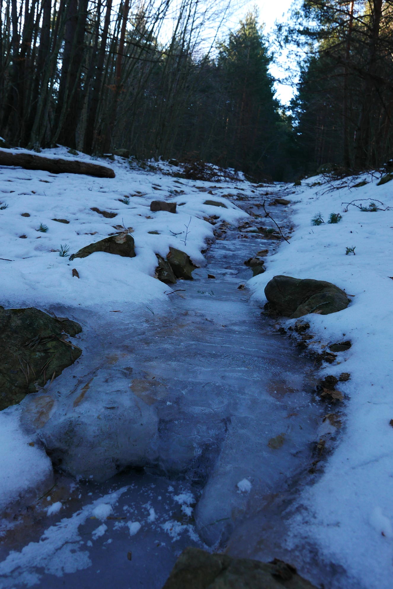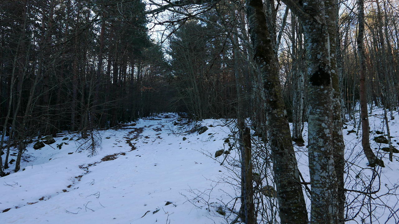 Se empieza a ascender recto por bosque de pinos, con muchos troncos caídos que se van sorteando sin dificultad. Una alambrada discurre todo el rato a mi derecha. Llego a una curva de la pista (1298m 1h25′) que había cruzado más abajo y sigo recto, dejando que la pista avance hacia la izquierda. Un último tramo que, con menos pendiente, llega al collado Paso Ancho (1325m 1h33′).