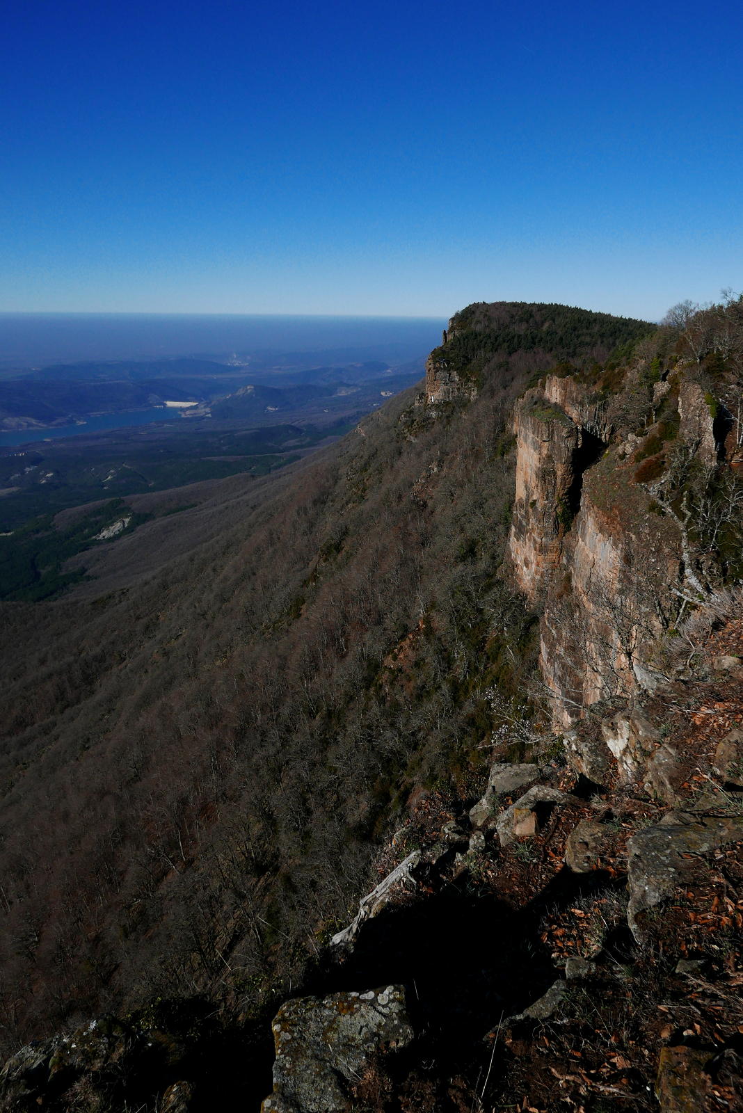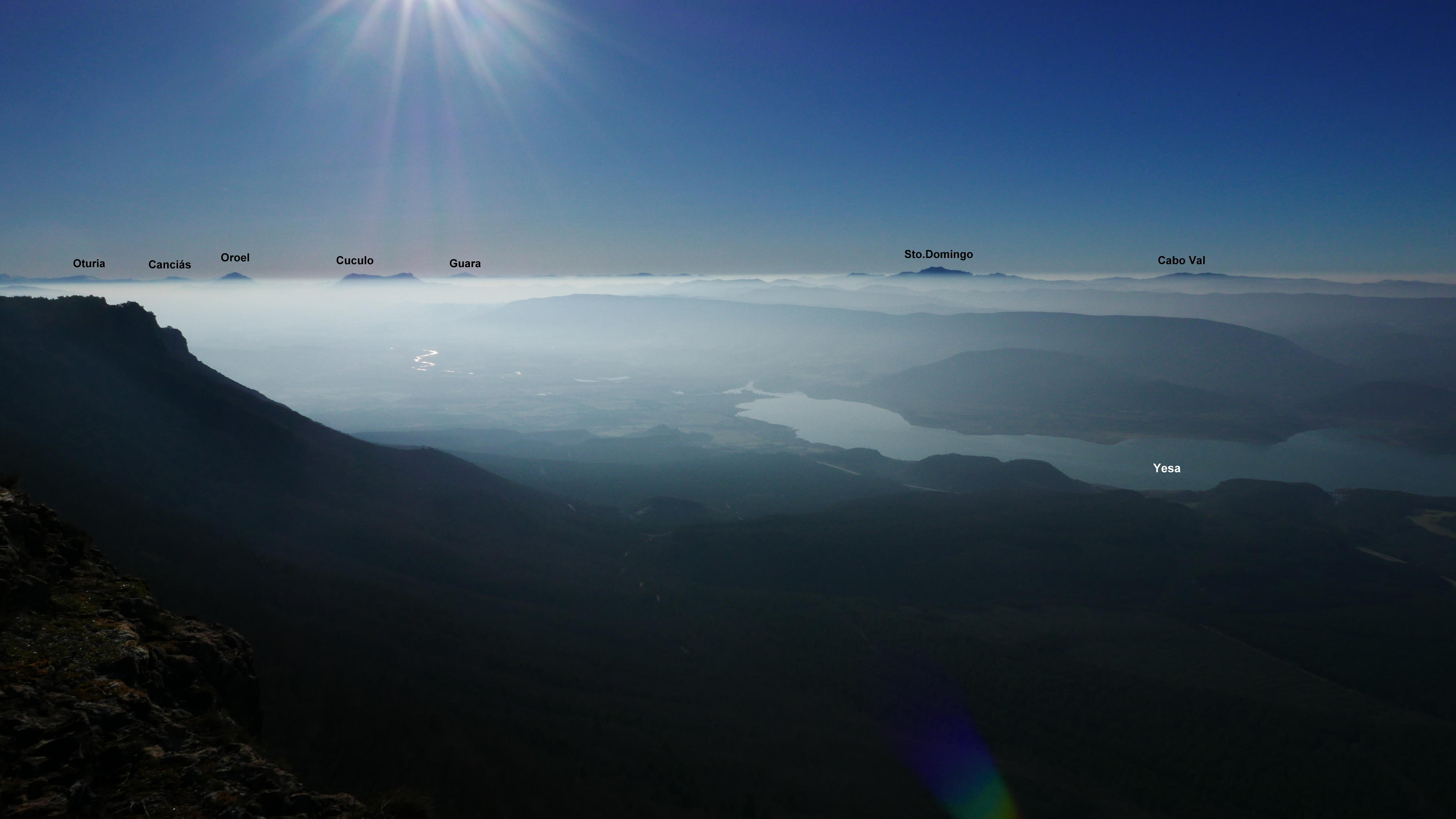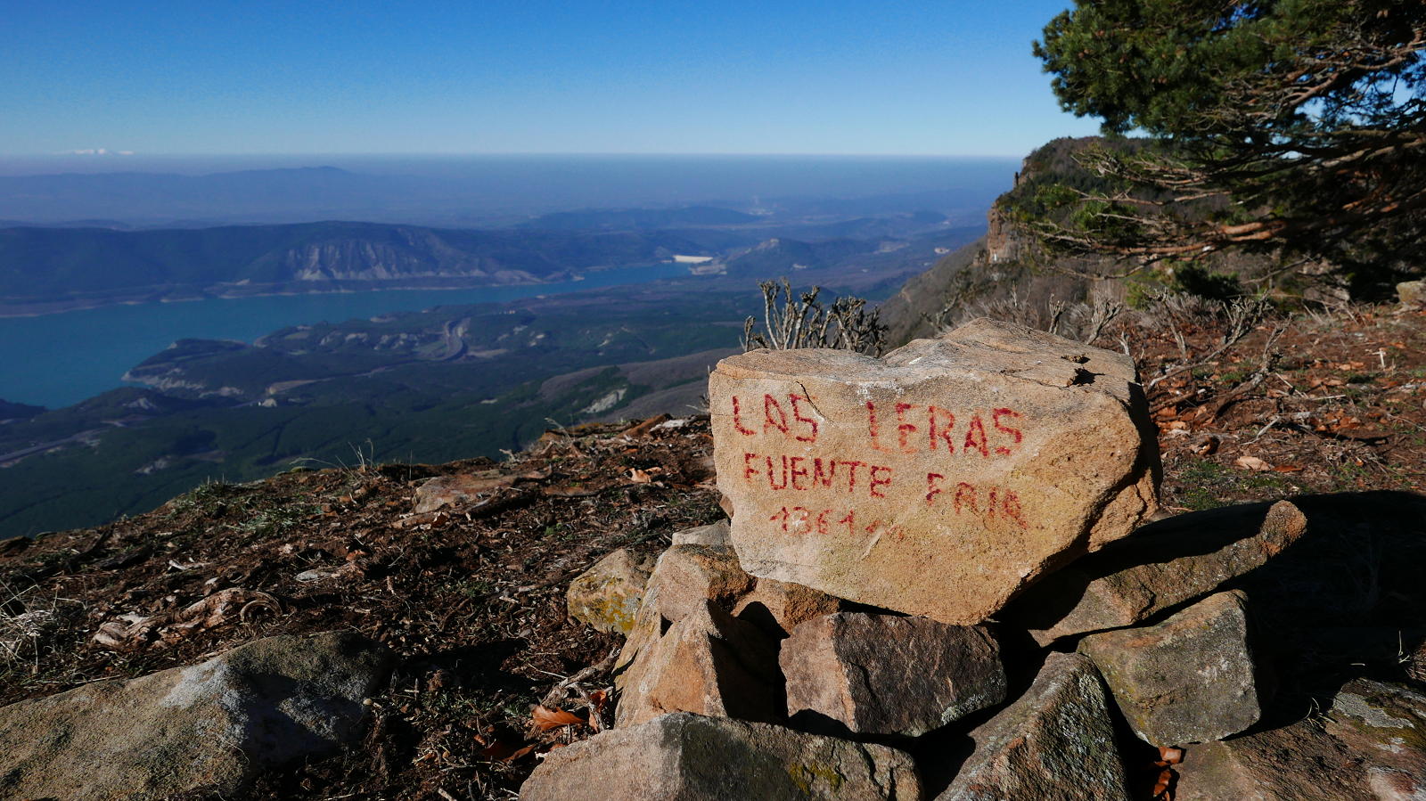 A mi derecha está el Cerro de las Cabañas y a mi izquierda Las Leras. El primero está catalogado con 2 metros menos (1359 m) y hay que atravesar la valla con alambre, así que como aún pienso hacer otra cima más, no me lío y me voy al alto de las Leras. La desviación con un hito está un poco antes de llegar al Paso Ancho. Es una entrada entre bojes bastante confusa, pero luego el bosque se aclara y es más sencillo avanzar más o menos cerca del acantilado hasta asomarse a un espolón donde está señalizada la cima de la Fuente Fría (1361m 1h40′). Un panorama espectaculares sobre el embalse de Yesa y el Moncayo, aunque con una capa de neblina baja que difumina un poco la visibilidad.