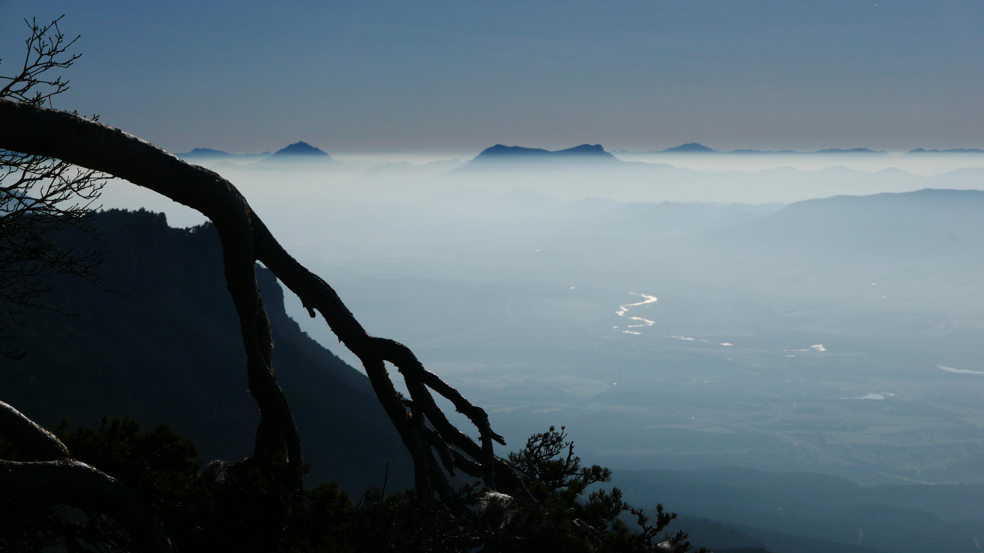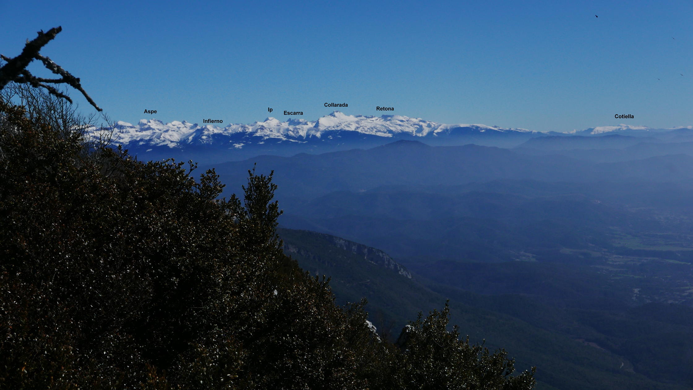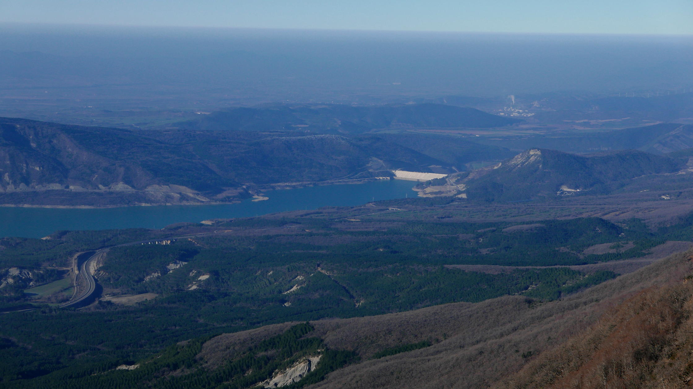 A mi derecha está el Cerro de las Cabañas y a mi izquierda Las Leras. El primero está catalogado con 2 metros menos (1359 m) y hay que atravesar la valla con alambre, así que como aún pienso hacer otra cima más, no me lío y me voy al alto de las Leras. La desviación con un hito está un poco antes de llegar al Paso Ancho. Es una entrada entre bojes bastante confusa, pero luego el bosque se aclara y es más sencillo avanzar más o menos cerca del acantilado hasta asomarse a un espolón donde está señalizada la cima de la Fuente Fría (1361m 1h40′). Un panorama espectaculares sobre el embalse de Yesa y el Moncayo, aunque con una capa de neblina baja que difumina un poco la visibilidad.