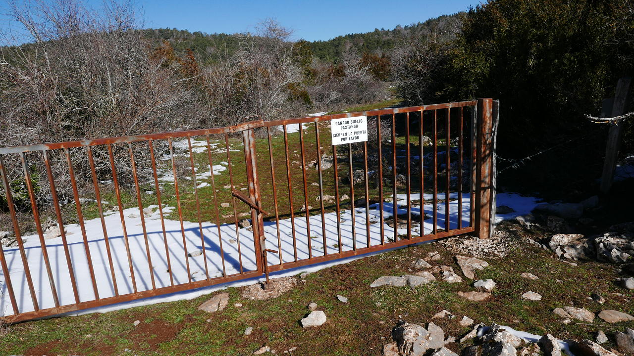 Descripción de la ruta: Desde las Bordas de la Tejería (815m) cruzo la carretera y avanzo por una traza de pista (se notan rodadas de vehículo sobre el campo de pasto) hacia el NNE. Cruzo una pista (850m 0h05′) y sigue difuso el camino por terreno terroso con bojes hasta que se dibuja una senda clara entre más vegetación. Empieza a ascender con más fuerza y está balizada con hitos, introduciéndose en la ladera izquierda de un barranco (Valdeollate en el mapa navarro). Termina en el collado Portillo de Ollate (1085m 0h32′), con un portón para impedir el paso de ganado.