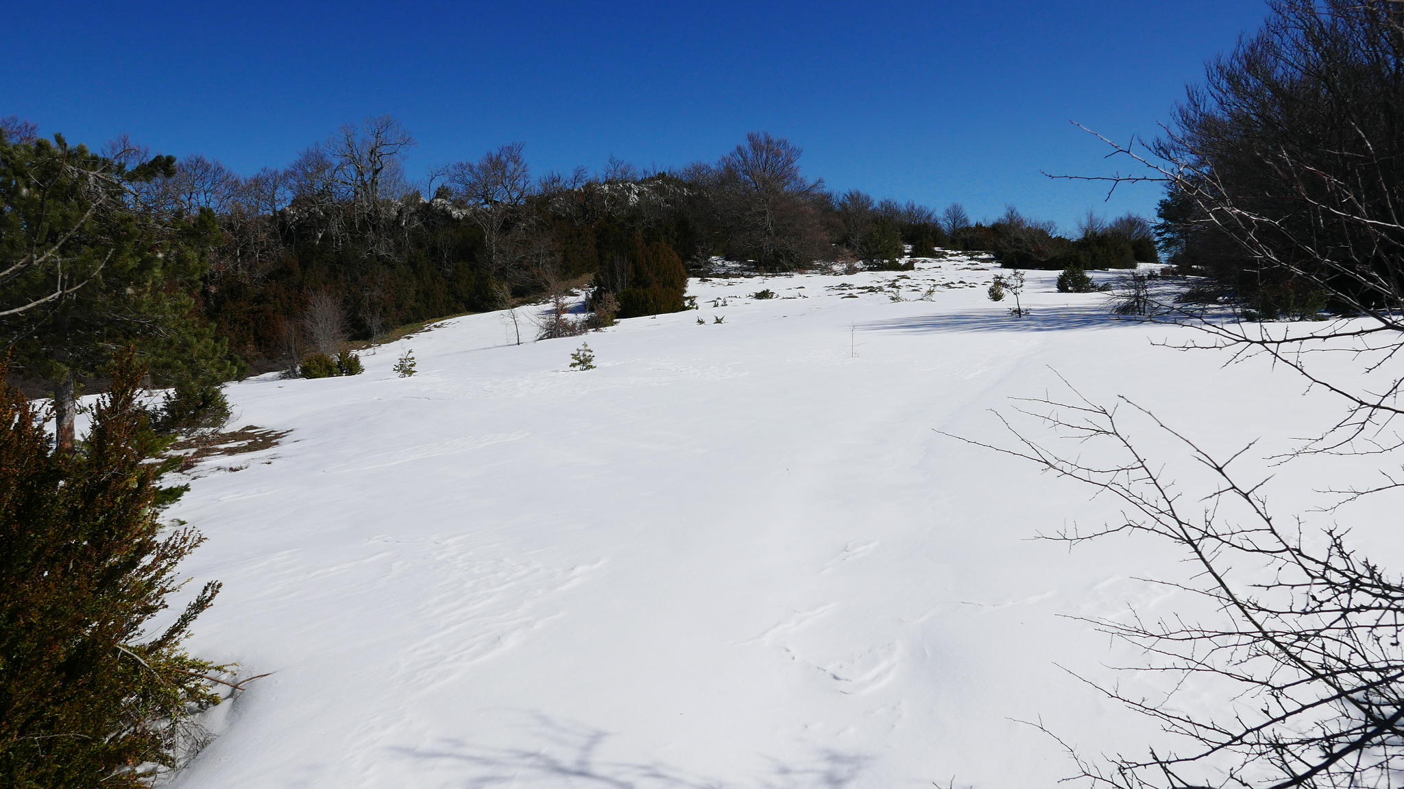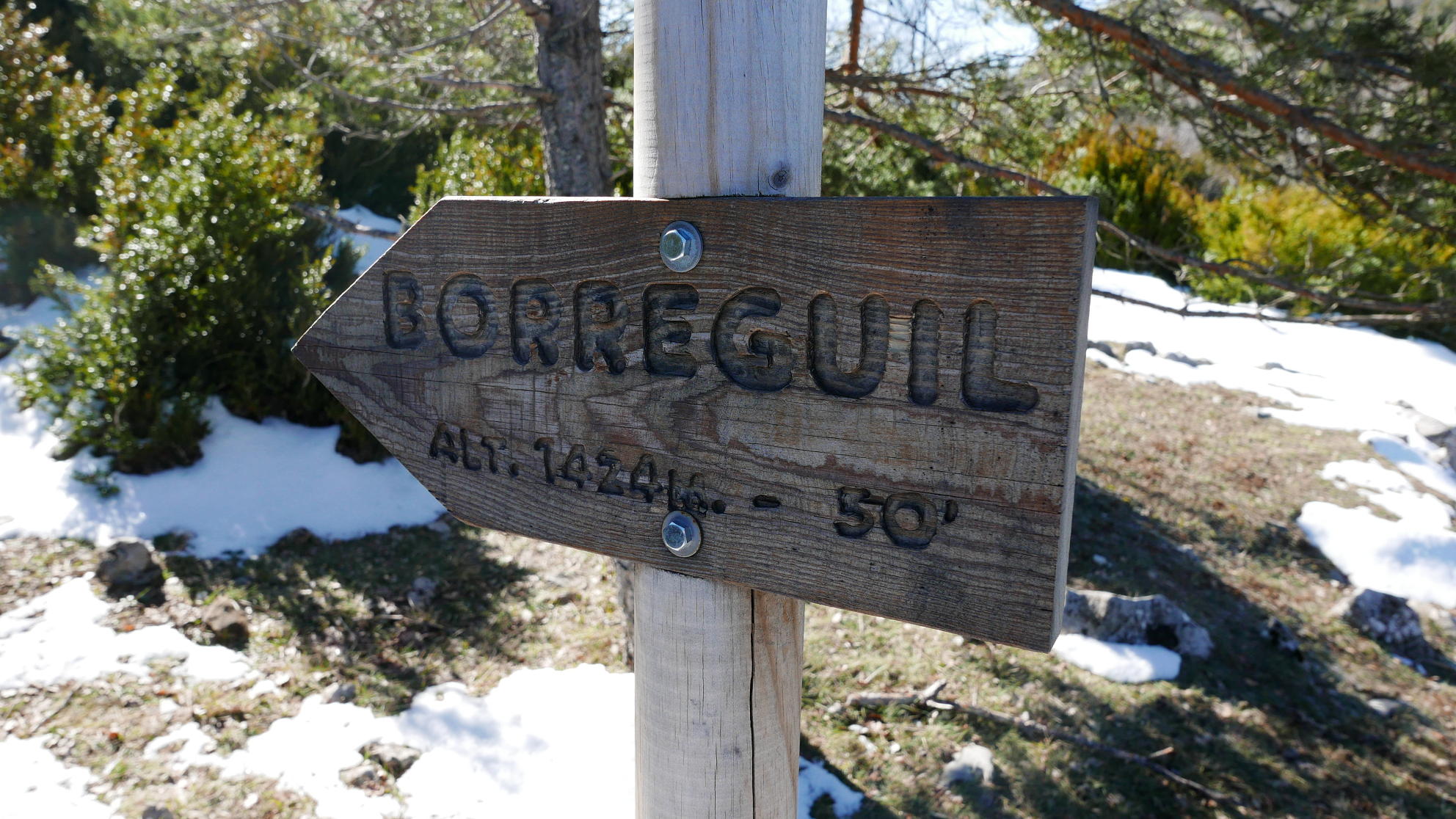Vuelvo a atravesar la mase de bojes, no sé muy bien por dónde, para regresar a la explanada abierta y cubierta de nieve dura y hacer el camino de vuelta a las Bordas de la Tejería (815m 2h13′)