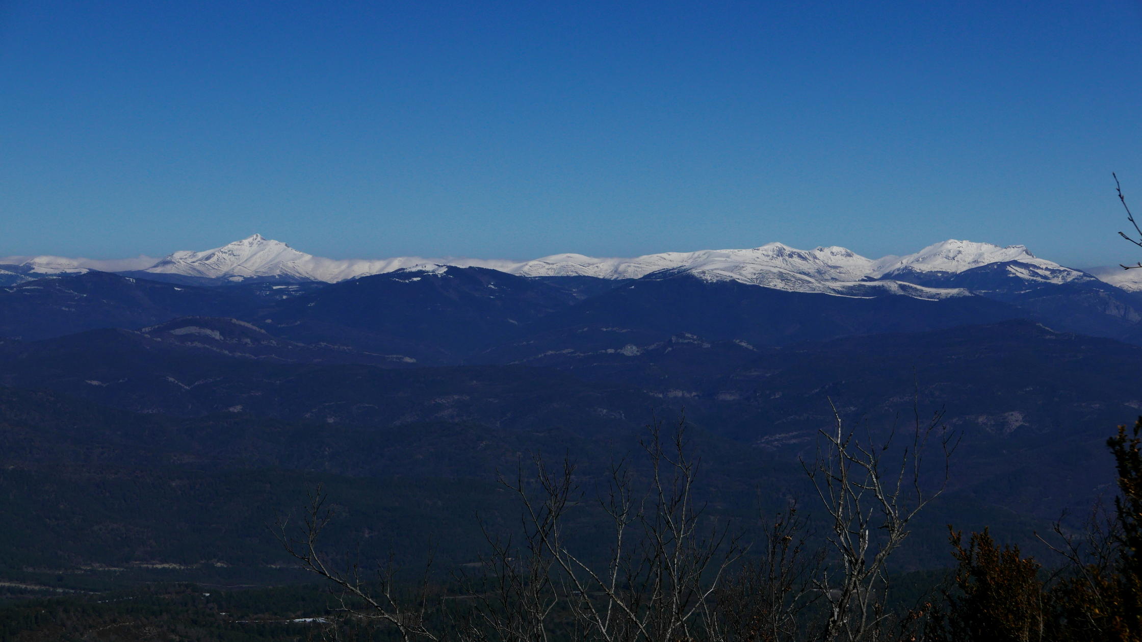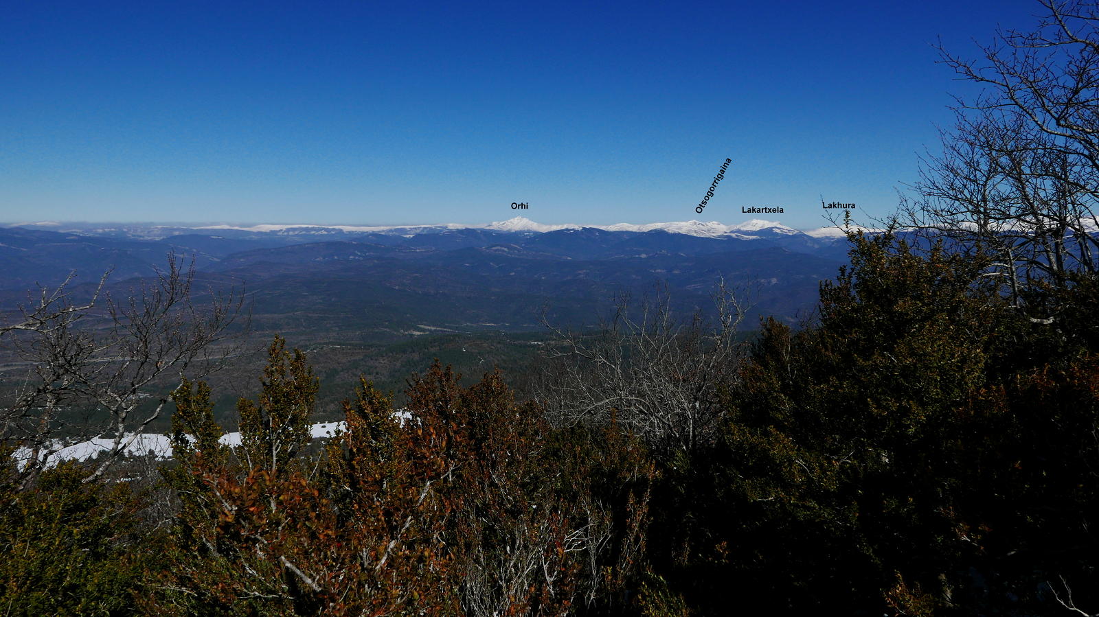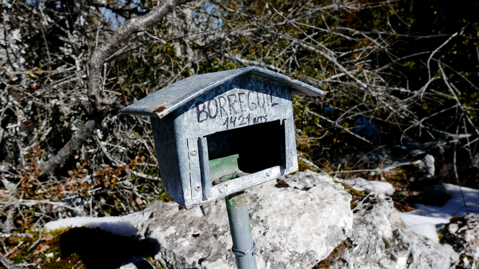 Pasado el portón, a la derecha, un cartel indica el Belbún. Es una entrada confusa en el bosque, luego la senda se hace algo más clara entre los árboles y hay algún hito. Una huella en la nieve también me sirve de guía. Al principio la pendiente es fuerte, luego se suaviza. Llegando a una zona llana y abierta, una ligera cresta rocosa a mi izquierda es donde está situada la cima, pero para alcanzarla hay que atravesar una zona cerrada de boj y, aunque es poco trozo, es incómodo. En la cima del Belbún (1423m 1h14′) hay un buzón con forma de casita. Las vistas hacia el este, al valle del río Esca (Valle de Roncal) son muy bonitas, pero hacia el norte los arbustos de boj dificultan un poco la visibilidad; aún así el Orhi nevado destaca por encima del resto.