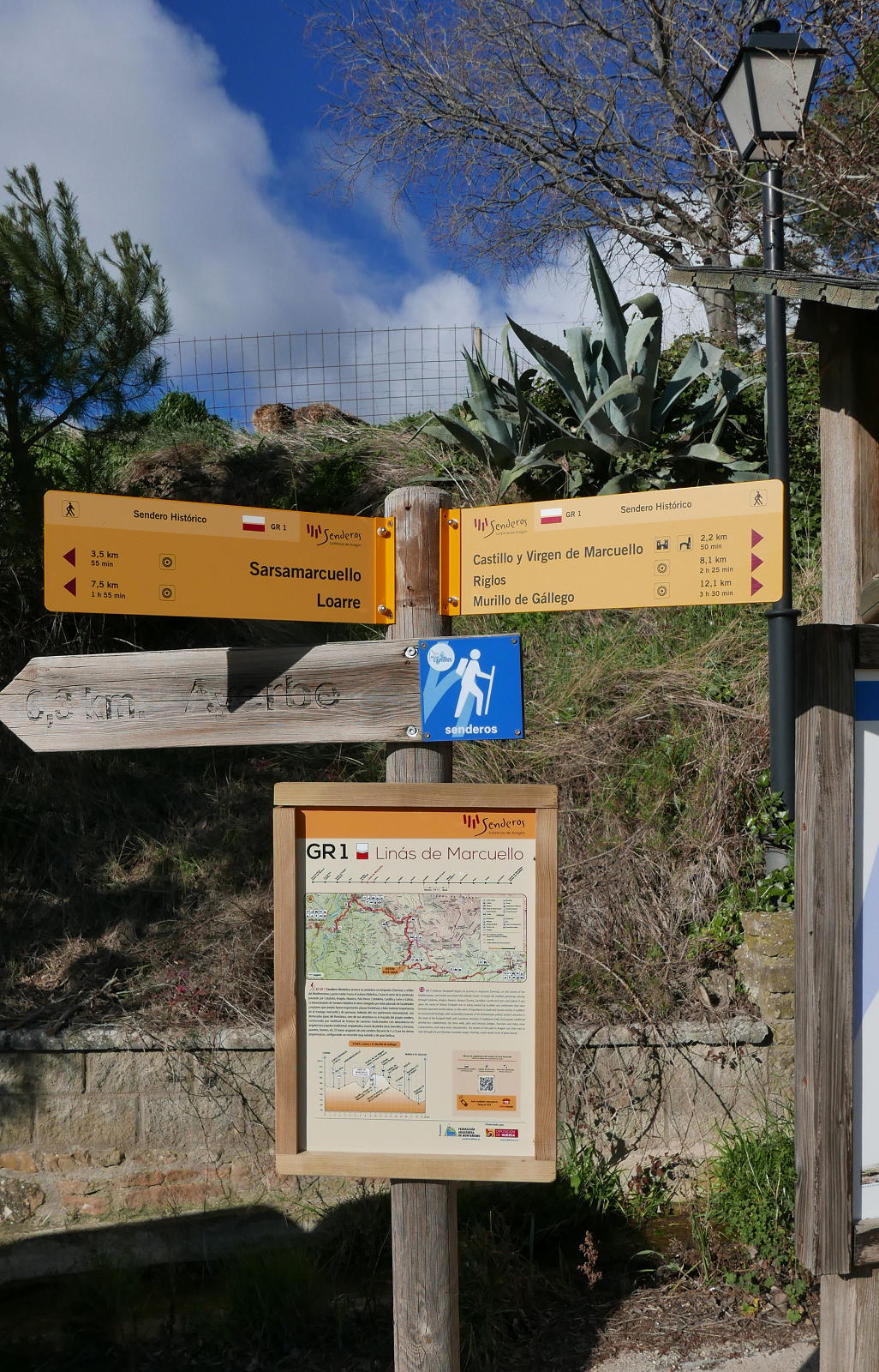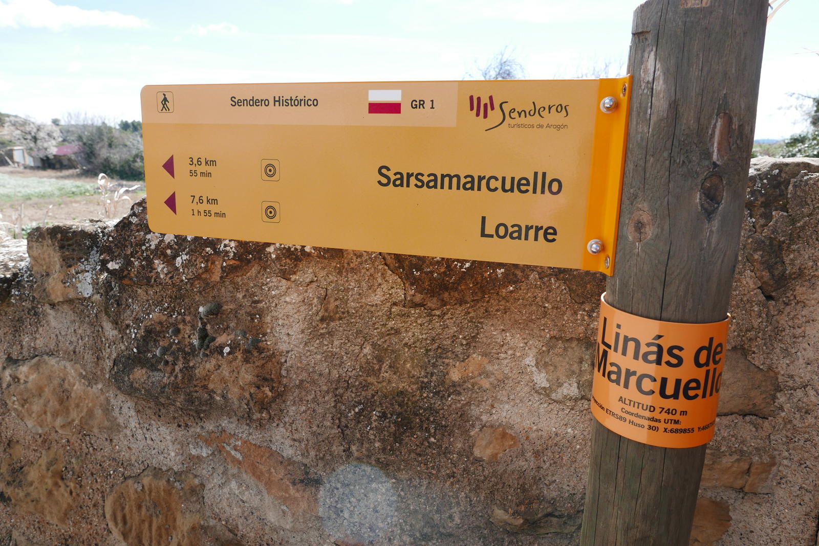 Descripción del recorrido: Aparcamiento a la entrada de Linás de Marcuello (735m). No merece la pena entrar con el coche por las estrechas callejas del pueblo. Se avanza por la Calle Alta siguiendo las marcas rojas y blancas del GR-1 (sendero de gran recorrido que va de Ampurias a Finisterre). Saliendo por la parte alta del pueblo se toma una pista que va a una balsa y el depósito de agua, tras el cual hay un sendero a la izquierda (782m 0h13′), con cartel indicador, comenzando la auténtica subida.