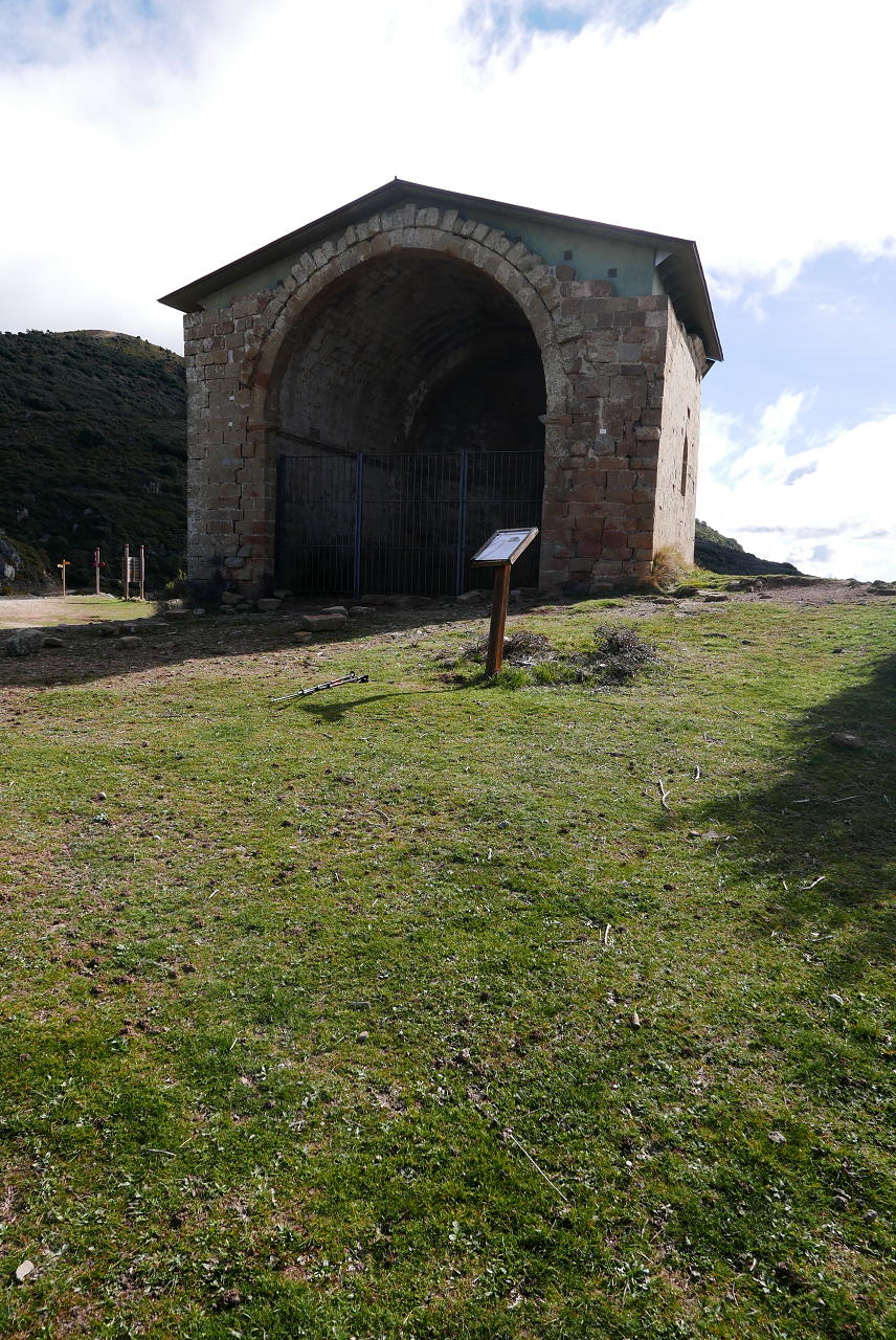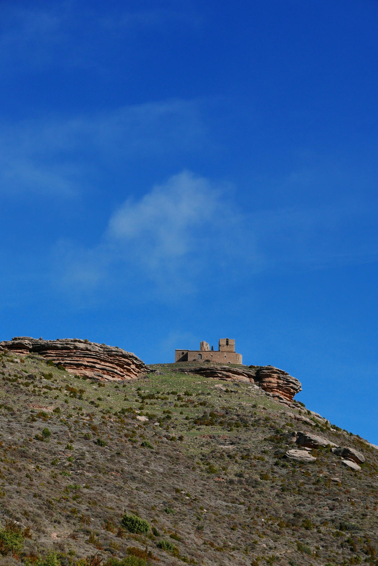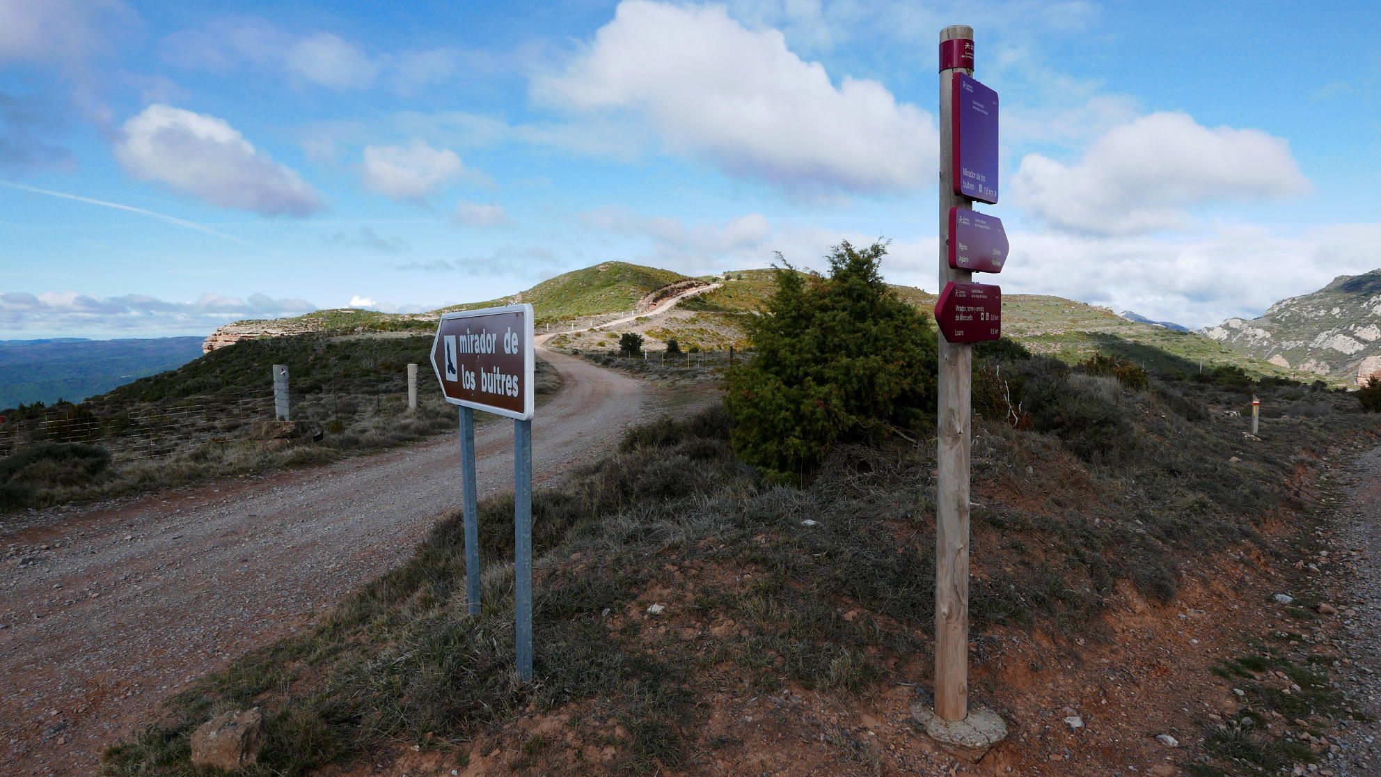 El sendero zigzaguea a las faldas del castillo de Marcuello, cuya esbelta torre en ruinas empieza a destacar enseguida. La senda sigue siendo el GR-1 y está balizada con pintura reciente. Alcanza el collado (995m 0h46′) entre el castillo, a nuestra derecha, y la ermita de San Miguel, a la izquierda. Junto a la ermita se toma la pista hacia el oeste. Enseguida se bifurca, tomando el ramal de la izquierda (1002m 1h02′) que indica con un gran cartel la dirección del Mirador de los Buitres y obviando las señales hacia la derecha que siguen el GR-95 (sendero de gran recorrido que une Zaragoza con el Bearn francés por la calzada romana).
