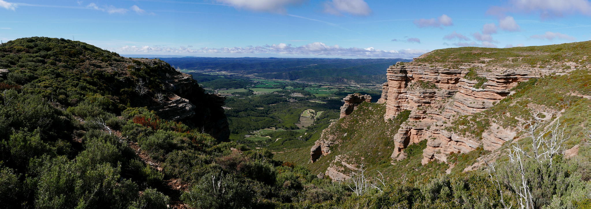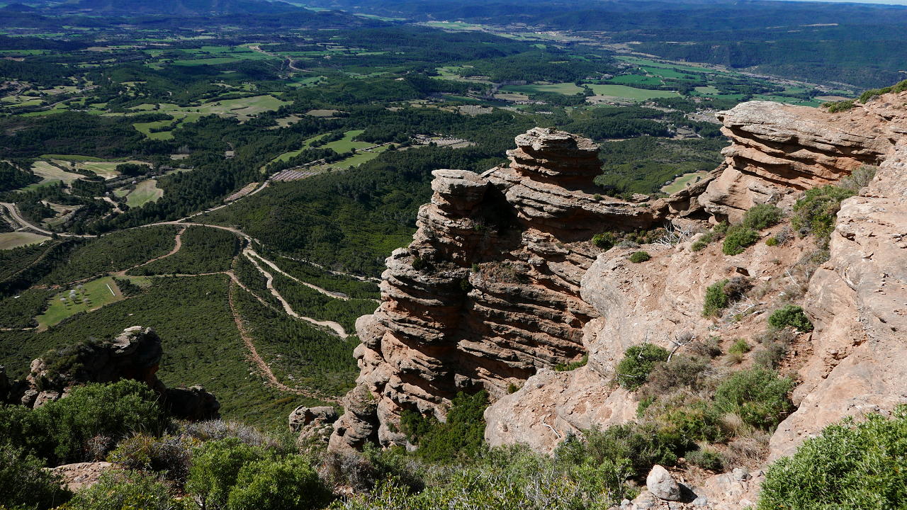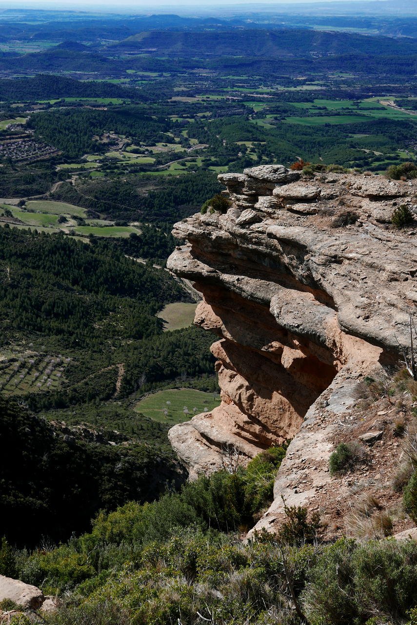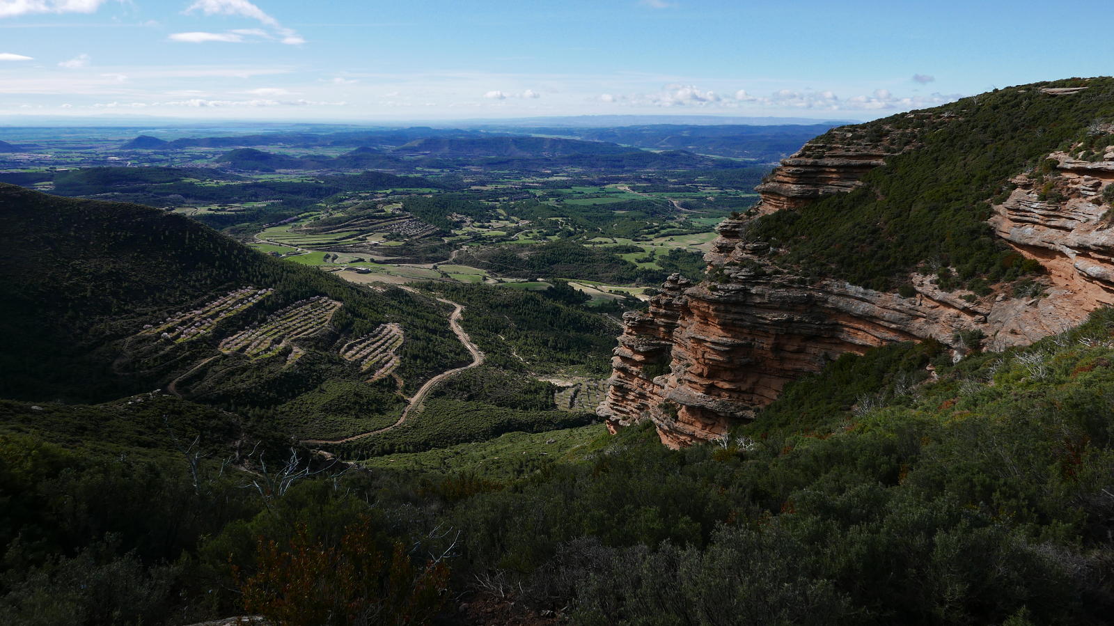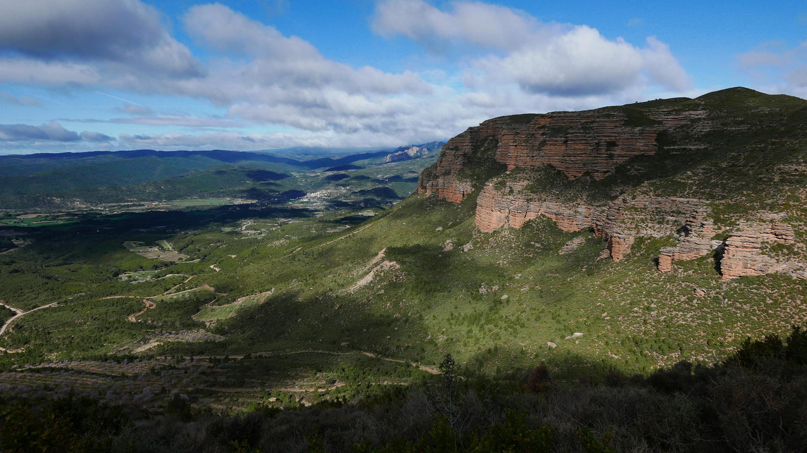 Pronto dejaremos esta pista, cruzando una valla por una zona abierta, para seguir una senda que se va asomando al acantilado sobre la Hoya de Huesca con unas vistas impactantes. Esta senda no tiene pérdida y acaba saliendo de nuevo a la pista por otra abertura de la valla a pocos metros del Mirador de los Buitres (1030m 1h36′), donde uno puede pasar un buen rato admirando los Mallos de Riglos y el vuelo de los buitres.