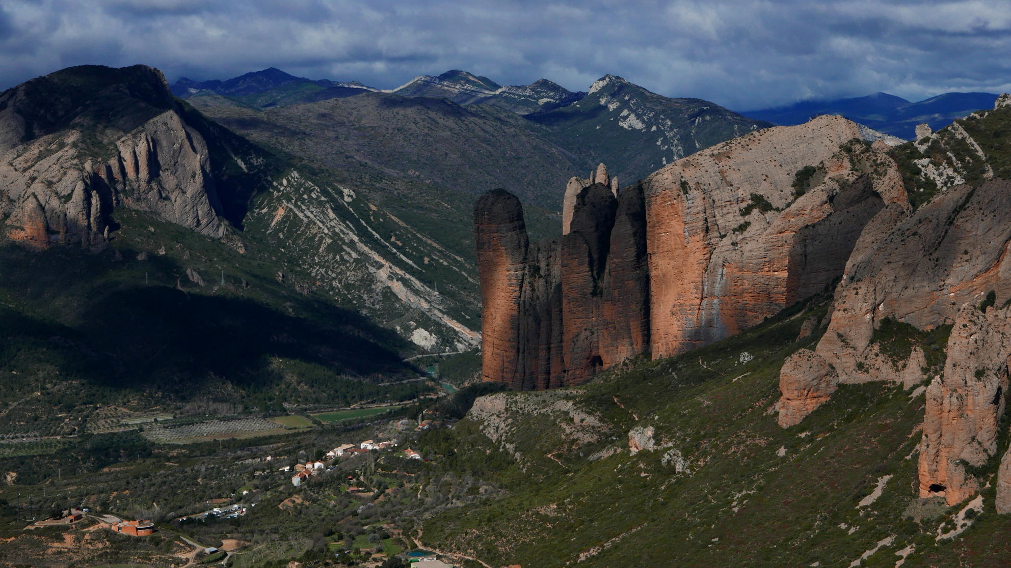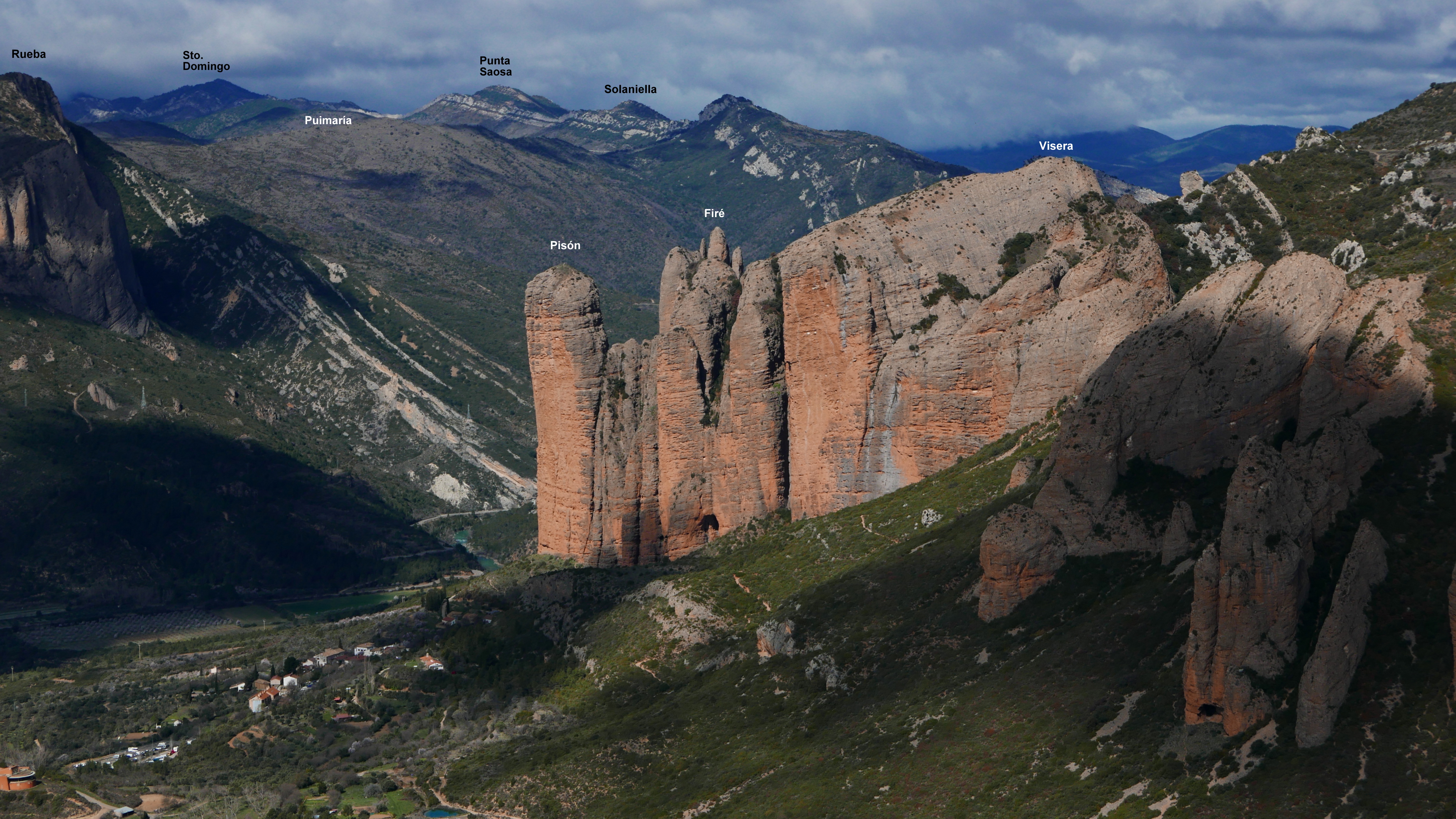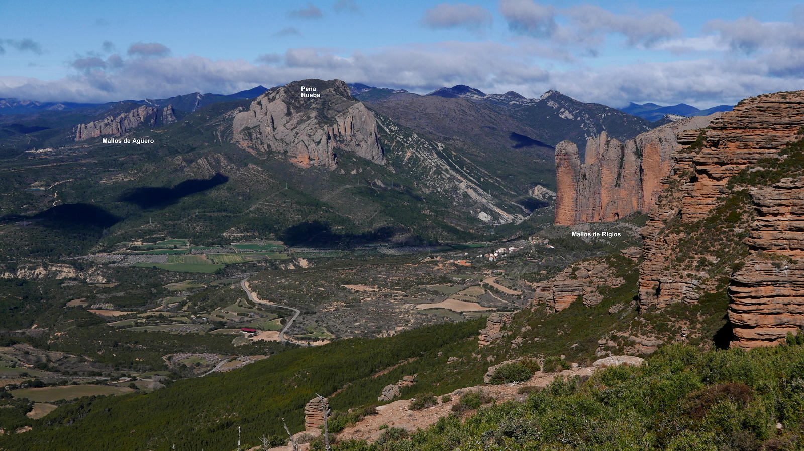 Las vistas desde el Mirador, por muchas visitas que hayamos hecho a los Mallos de Riglos, tampoco nos dejan indiferentes. Pocos enclaves hay tan impresionantes. Además, desde aquí, tenemos en segundo plano la Peña Rueba y, un poco más lejos, los Mallos de Agüero. El Mirador de los Buitres es también el punto más alto de la ascensión de la ferrata Cubilillo os Fils