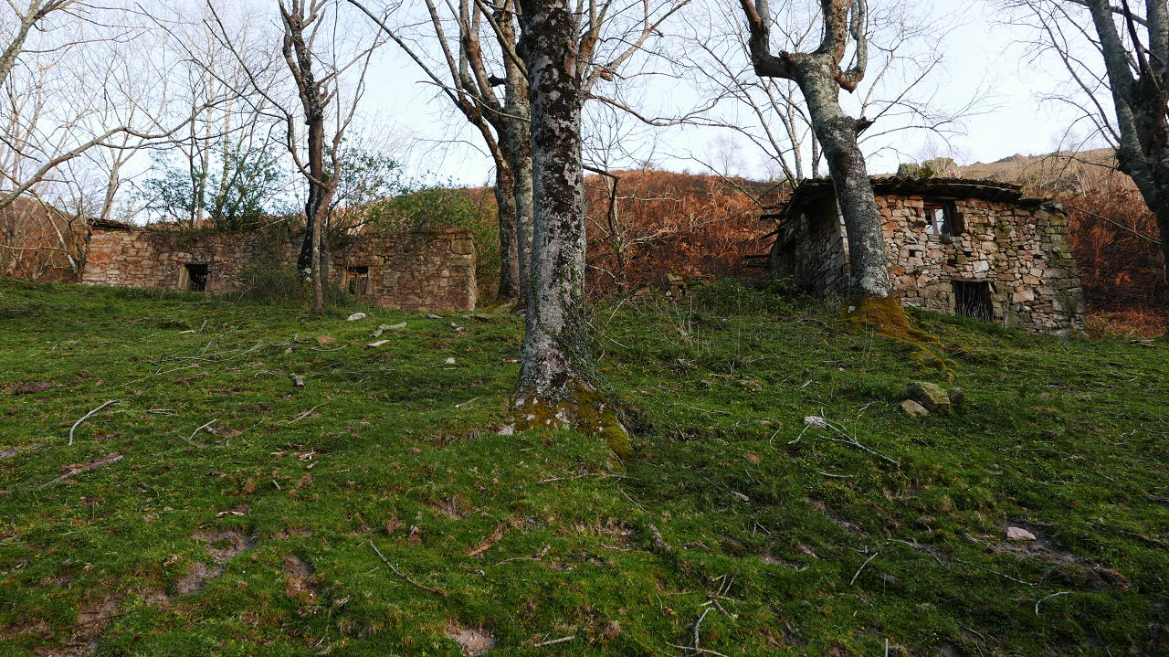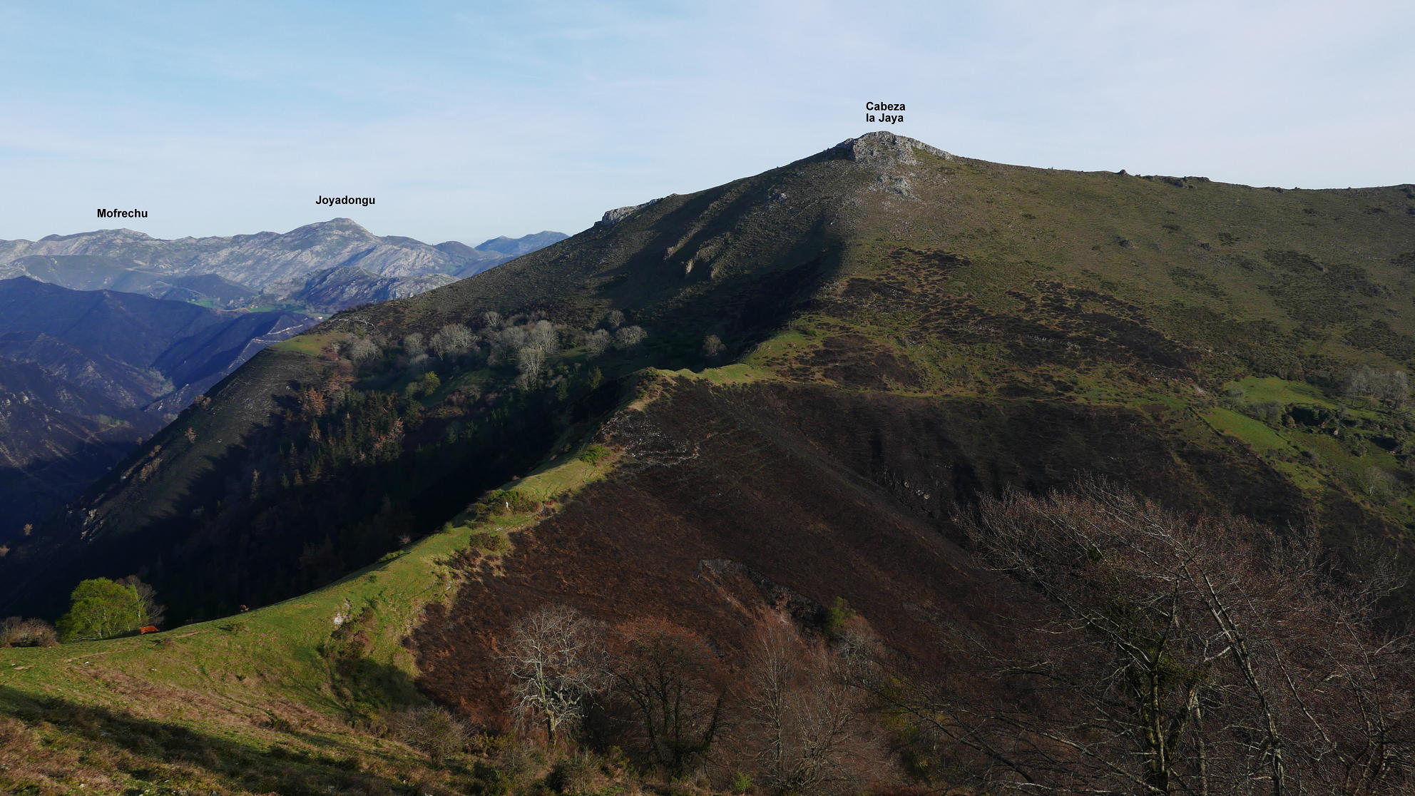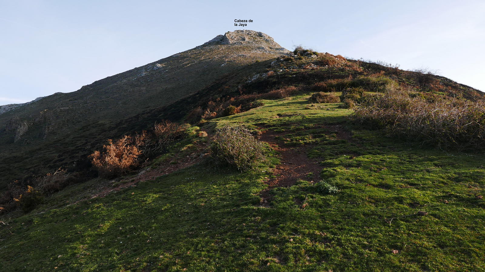 A partir de aquí asciende una senda, en algún momento algo confusa ya que debe tener poco mantenimiento y más bien parece de paso de vacas, pero de momento se sigue bastante bien. Otra vez cruza el arroyo girando a la derecha y subiendo la ladera de la izquierda se pierde la senda para llegar a las cabañas de Cuerín (485m 0h58′). Se pasa por encima de las cabañas y se vuelve a recuperar la senda que faldea claramente la ladera hasta el collado Sur (637m 1h18′) del Cabeza de la Jaya.