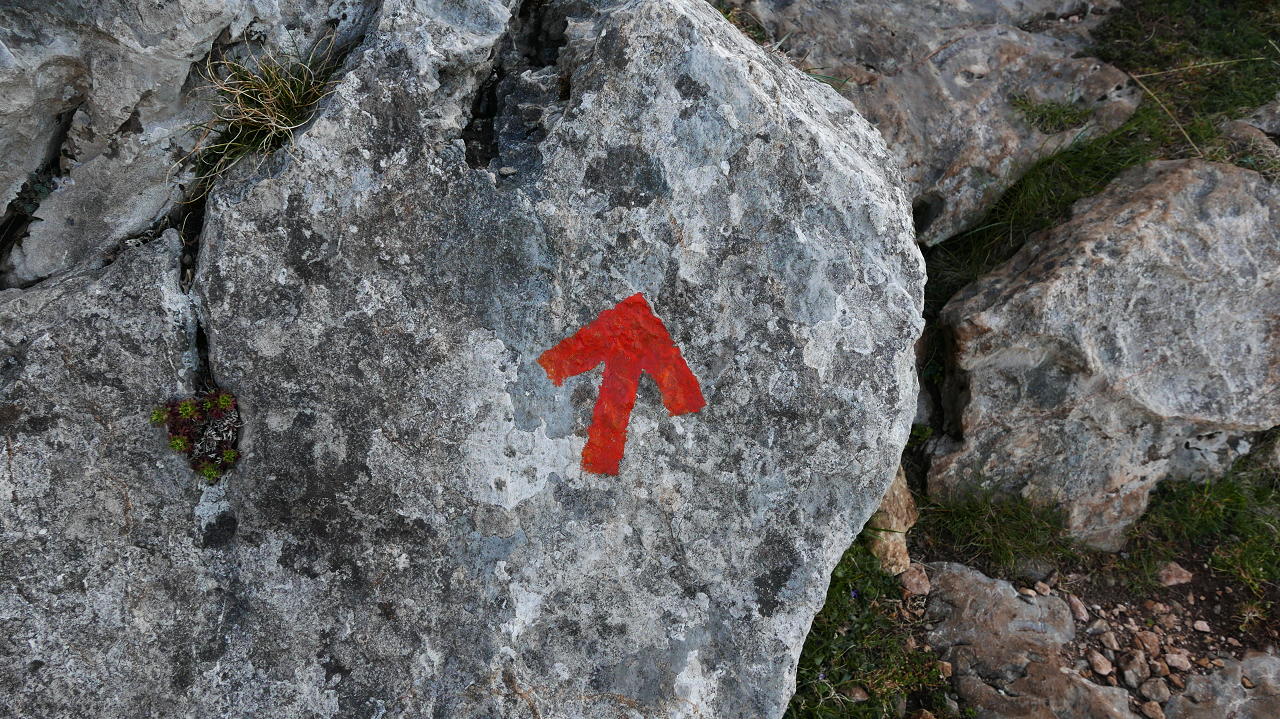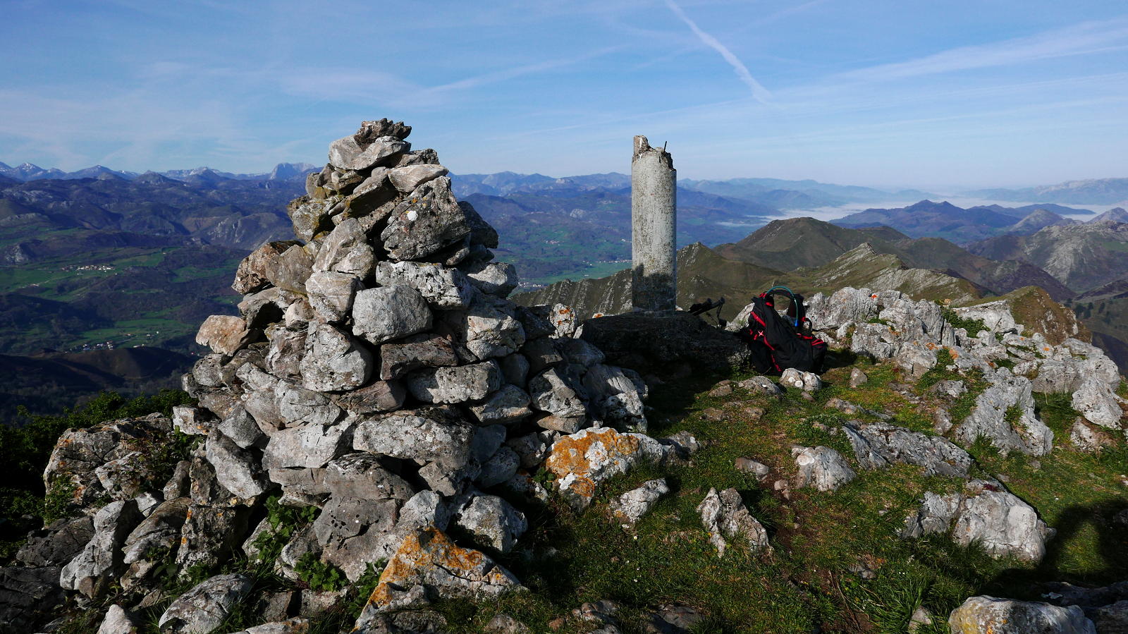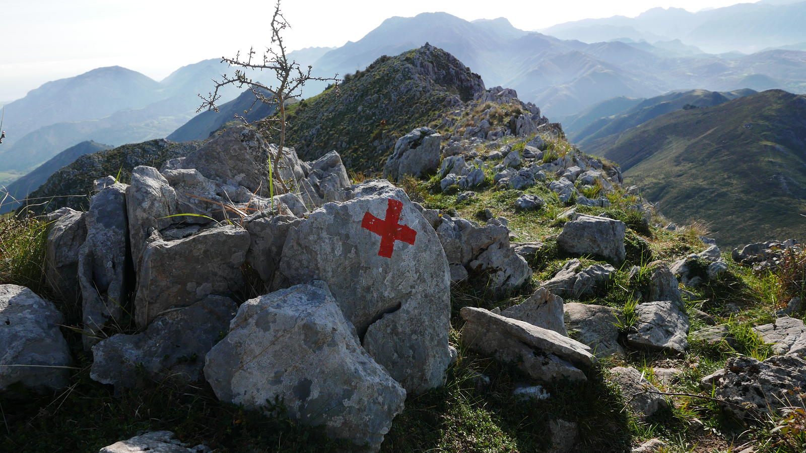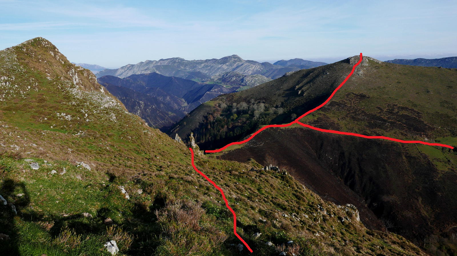 Afronto directamente la ladera sur de este pico, sin senda, la ruta es evidente y solo requiere un pequeño esfuerzo llegar a la cima del Cabeza de la Jaya (767 m 1h30′). Un buitre levanta el vuelo justo cuando piso la cumbre. Vuelvo al collado (637m 1h40′) y sigo la cresta lomosa hacia el sur. Un primer resalte se pasa por la izquierda tomando dirección este. Se sube un corredor de hierba pasando junto a dos pináculos rocosos (los pináculos quedan a mi izquierda y la montaña a la derecha). Empieza a haber más piedra, el lapiaz calizo sobresale por encima del pasto. El siguiente resalte se evita por la derecha, pero ya solo queda una pendiente más fuerte, balizada con flechas naranjas bastante recientes, que da acceso al Hibeo o Cabeza Juralista (872m 2h17′). Espléndida vista de los Picos de Europa.