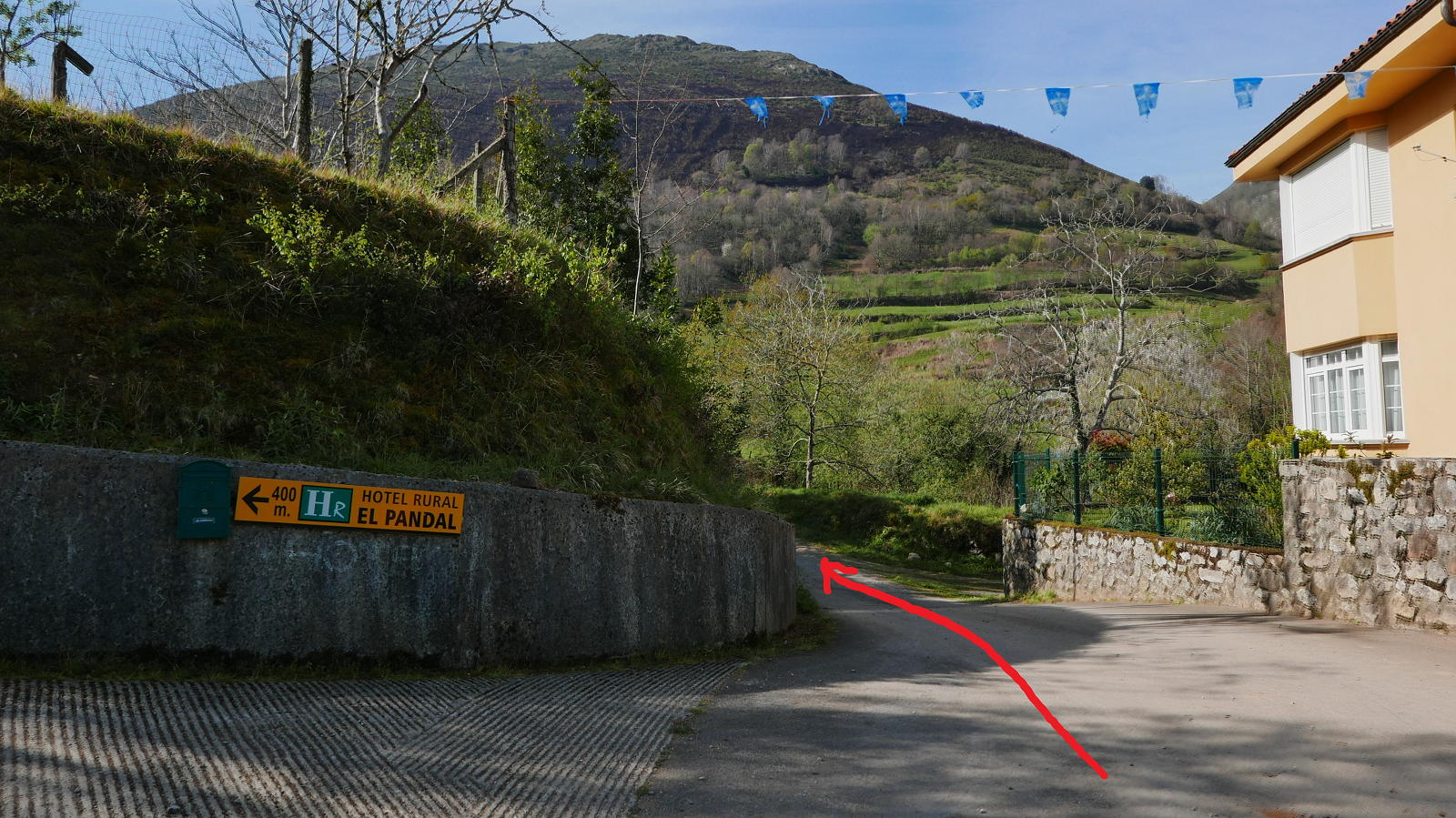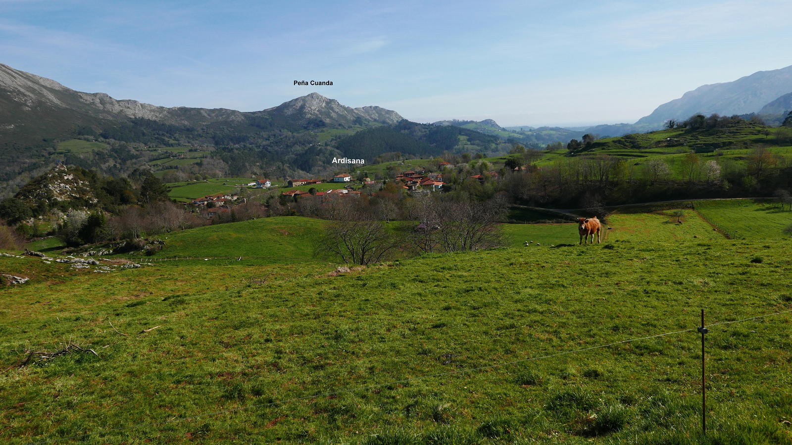 Descripción de la ruta: Ardisana (200m). Avanzo por las calles del pueblo hacia el hotel rural el Pandal hasta salir por una pista en dirección sur y sigo siempre la pista principal, llegando a un banco de madera (290m 0h15′) donde sigo recto dejando otro camino a mi izquierda. Más adelante hay una bajada pronunciada y cementada con una curva cerrada a la derecha, yo sigo recto (290m 0h23′). Paso una barrera canadiense y cruzo el arroyo Orticeda, hay unas cabañas y cercas para ganado. Acaba la pista y vuelvo a cruzar el arroyo Orticeda (370m 0h33′), hay una caseta para la toma de agua de Ardisana.