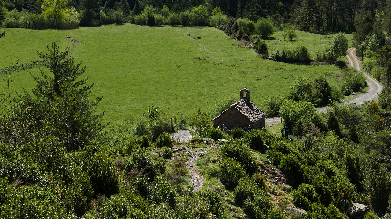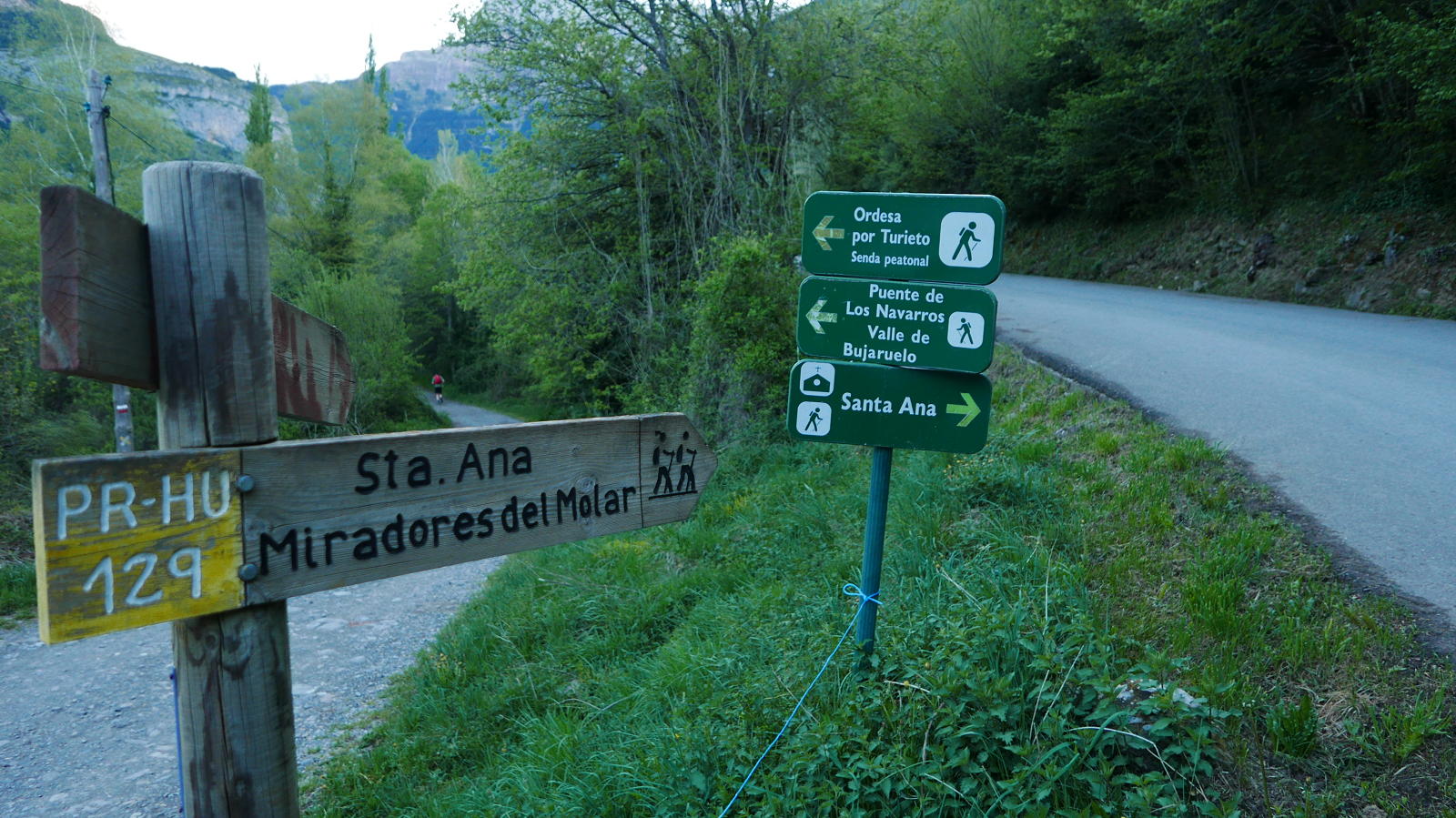 Descripción de la ruta: Torla (1020m). En la esquina del hotel Bellavista baja una calle cementada que baja al puente de la Glera (960m) atravesando el río Ara y hay que seguir las indicaciones a la Ermita de Santa Ana por el PR-HU-129. Se pasa junto a la entrada del camping Río Ara y enseguida se toma la senda señalizada con las marcas amarilla y blanca de PR. Ascenso por bosque de quejigo bien sombreado, por la orilla derecha del barranco de Diazas.