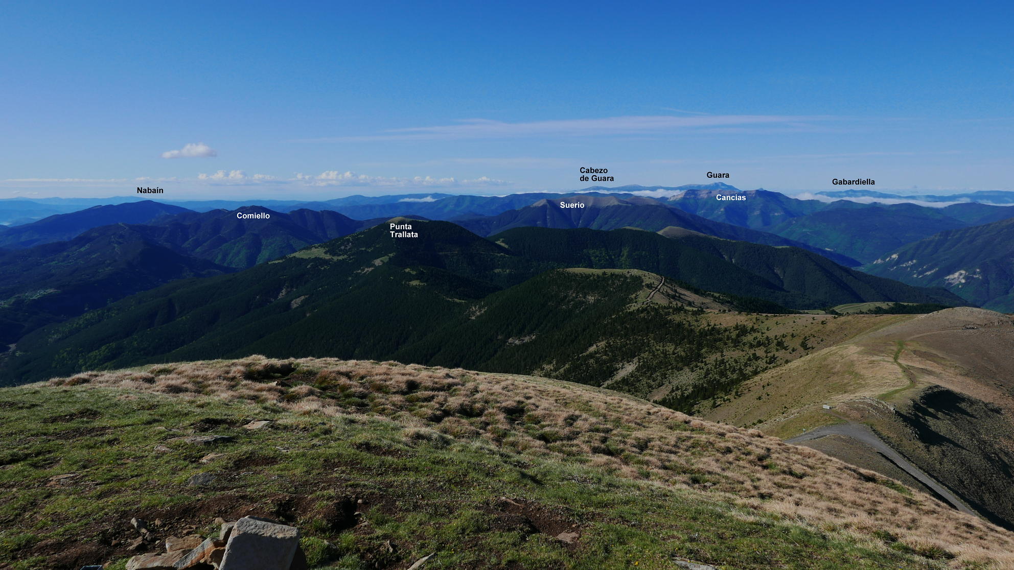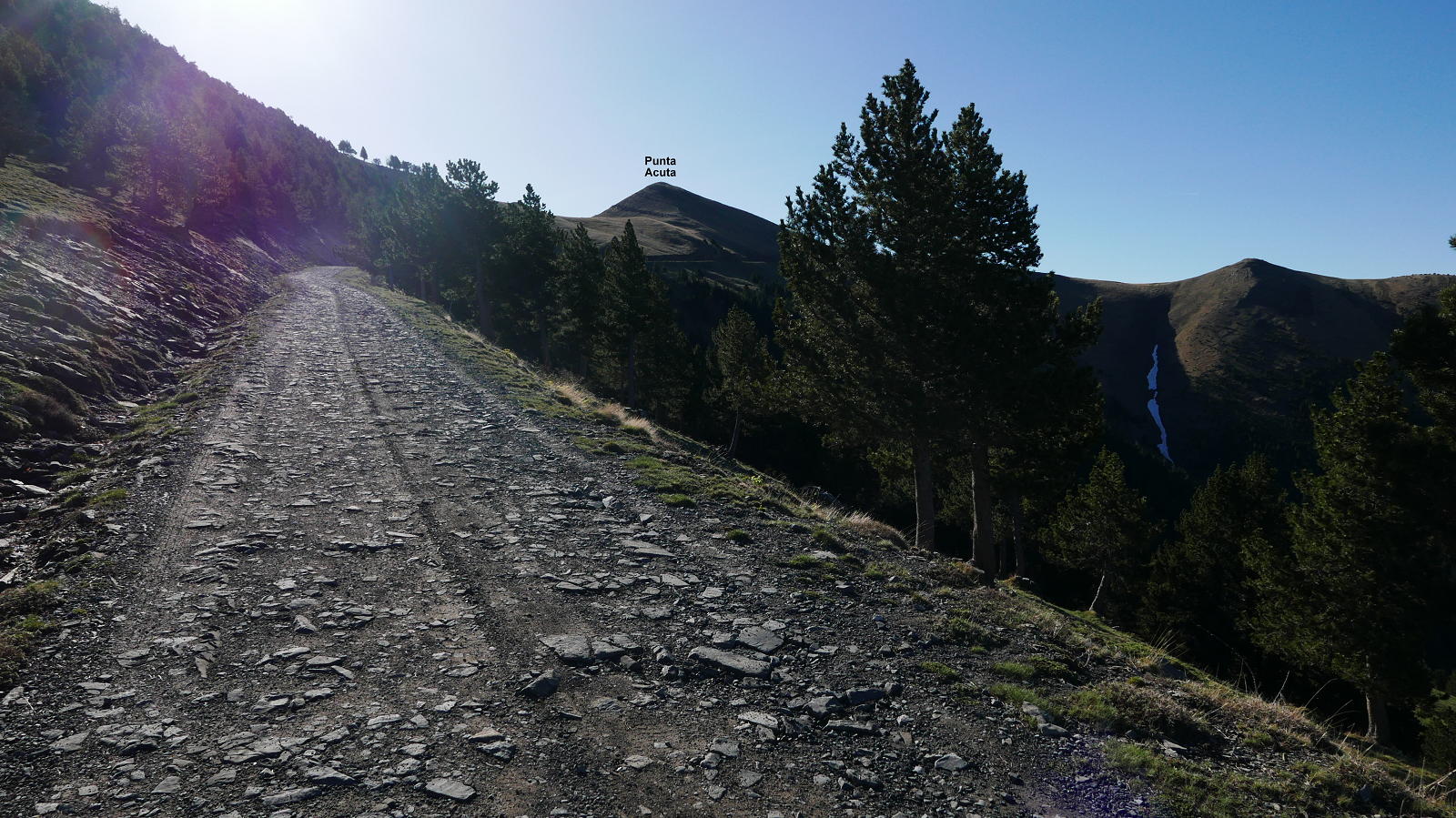 Se cruza la pista (1210m 0h32′). Hay que cruzarla 5 veces y al salir la 6ª vez a la pista desemboca en la Ermita de Santa Ana (1475m 0h58′). Dejando la pista a la derecha, la senda toma el lomo y sale de nuevo la pista en el mirador de la Cruceta o de la Herradura (1695m 1h20′) y continúa por el lomo bajo el bosque de pinos. De nuevo salgo a la pista (1865m 1h33′) y ahora sí que hay que seguirla un rato hasta una curva a la derecha donde se vuelve a atajar dos amplias curvas por una traza difusa. Después, ya por la pista bajo la cresta de la sierra de las Cutas, continúo hasta lanzarme sin senda por el lomo WNW (2085m 2h05′) de la Punta Acuta, alcanzándolo con un último esfuerzo (Punta Acuta 2242m 2h19′).