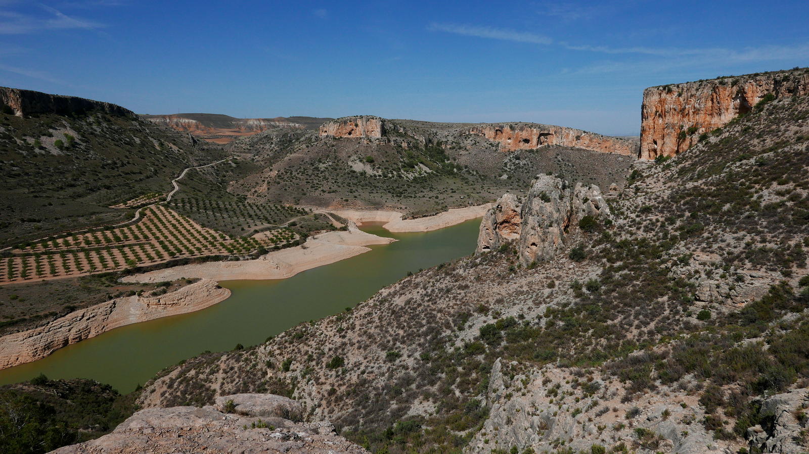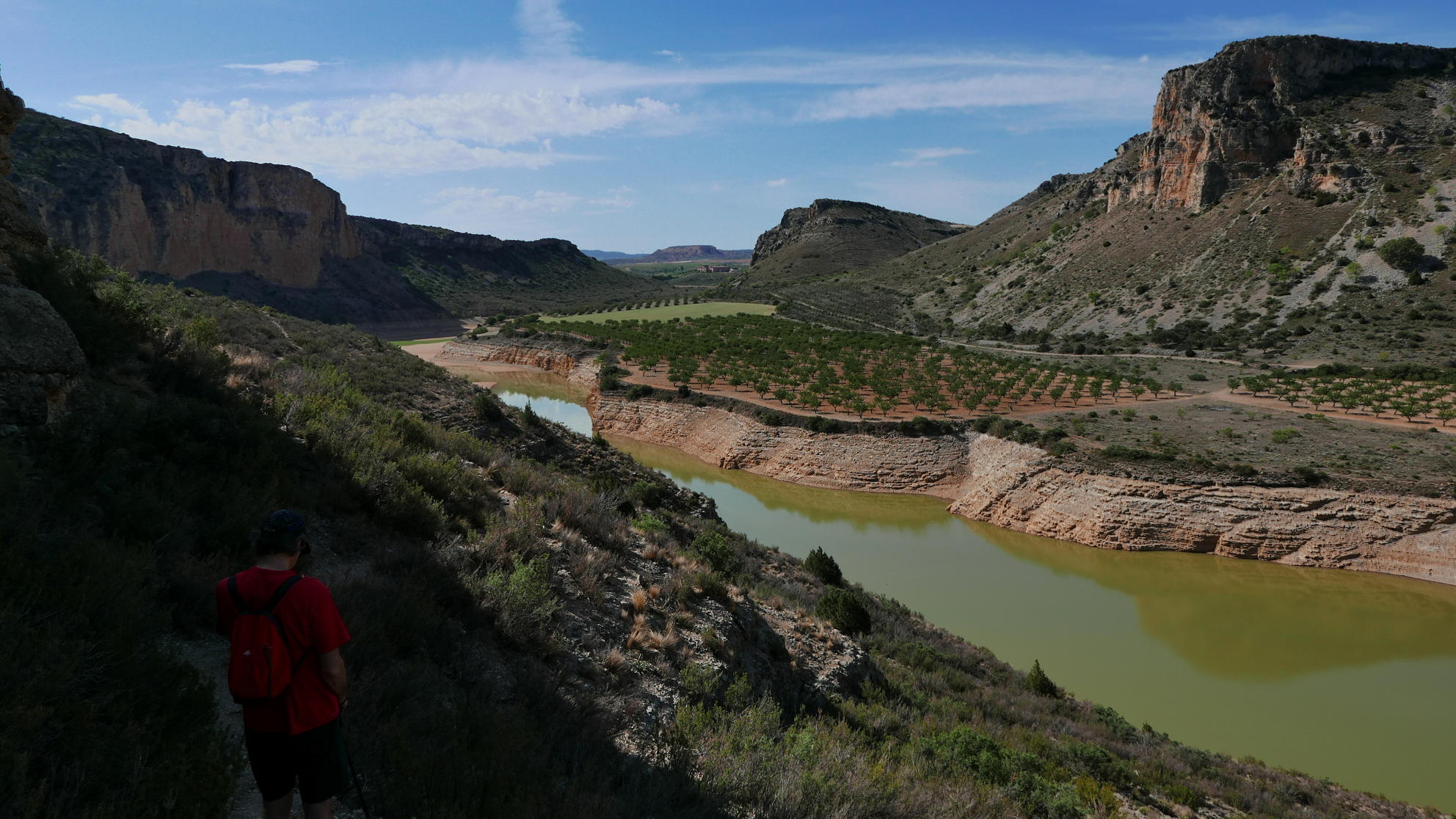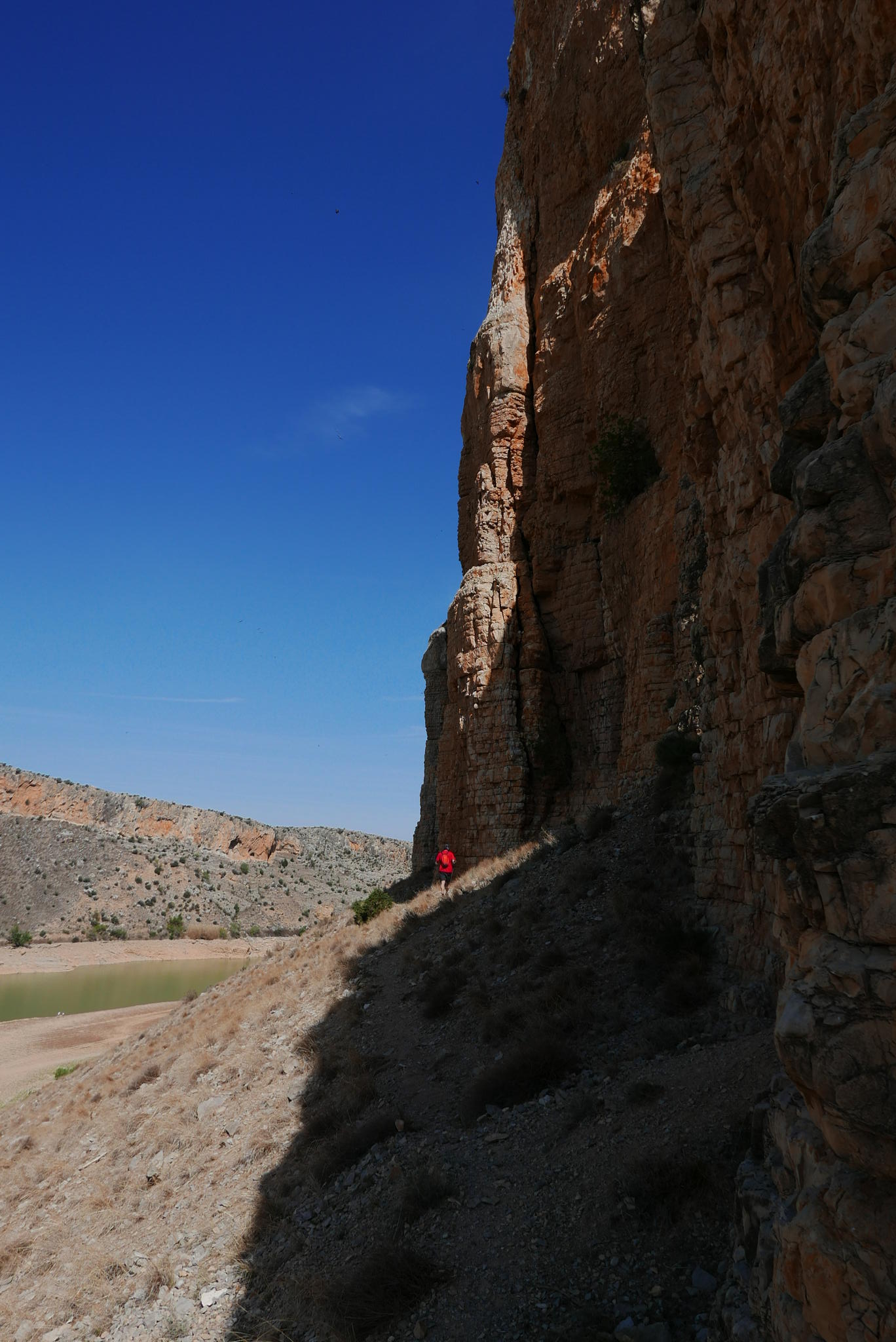 Al cabo de 3km el sendero gira a la izquierda y se aleja del río. Vamos por un camino entre campos de cultivo desembocando en una pista que seguimos a la derecha. Campos de cereal, barbechos, huertas, vides, olivos y almendros configuran el paisaje hasta llegar a la presa de Mezalocha (480m 1h41′). El entorno cambia drásticamente ya que el embalse está incrustado entre verticales paredes rocosas, y una senda, la PR-Z-45, avanza pegada a la pared. Por aquí ya solo continuamos Víctor y yo.