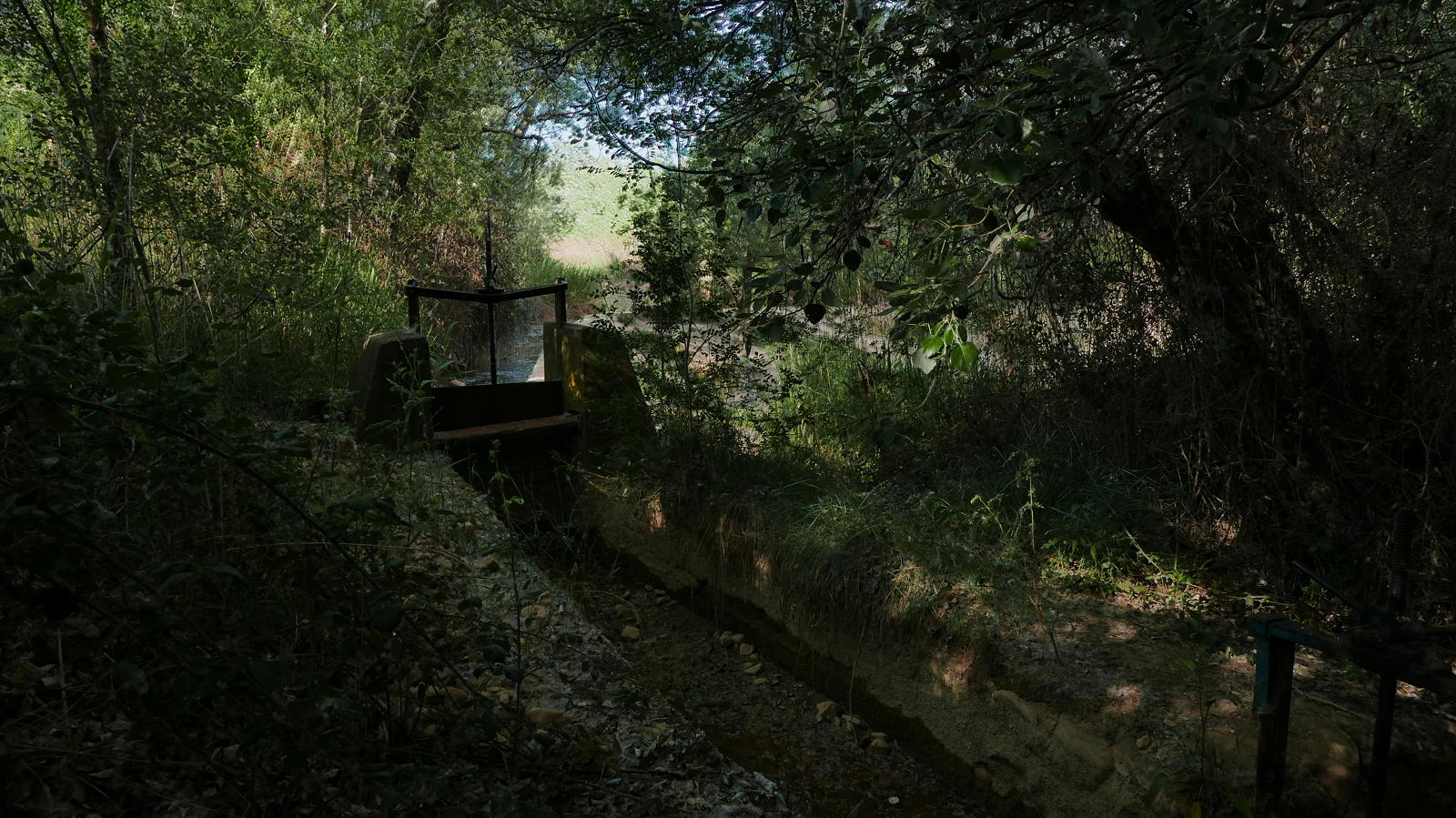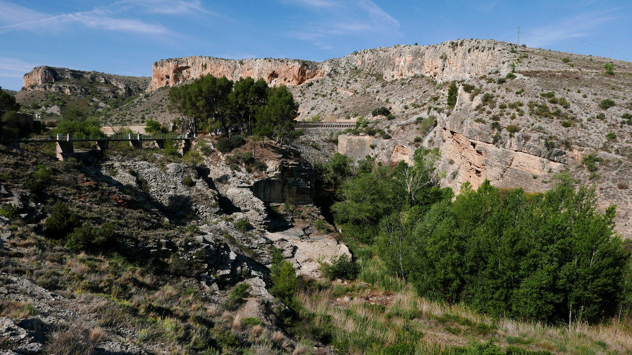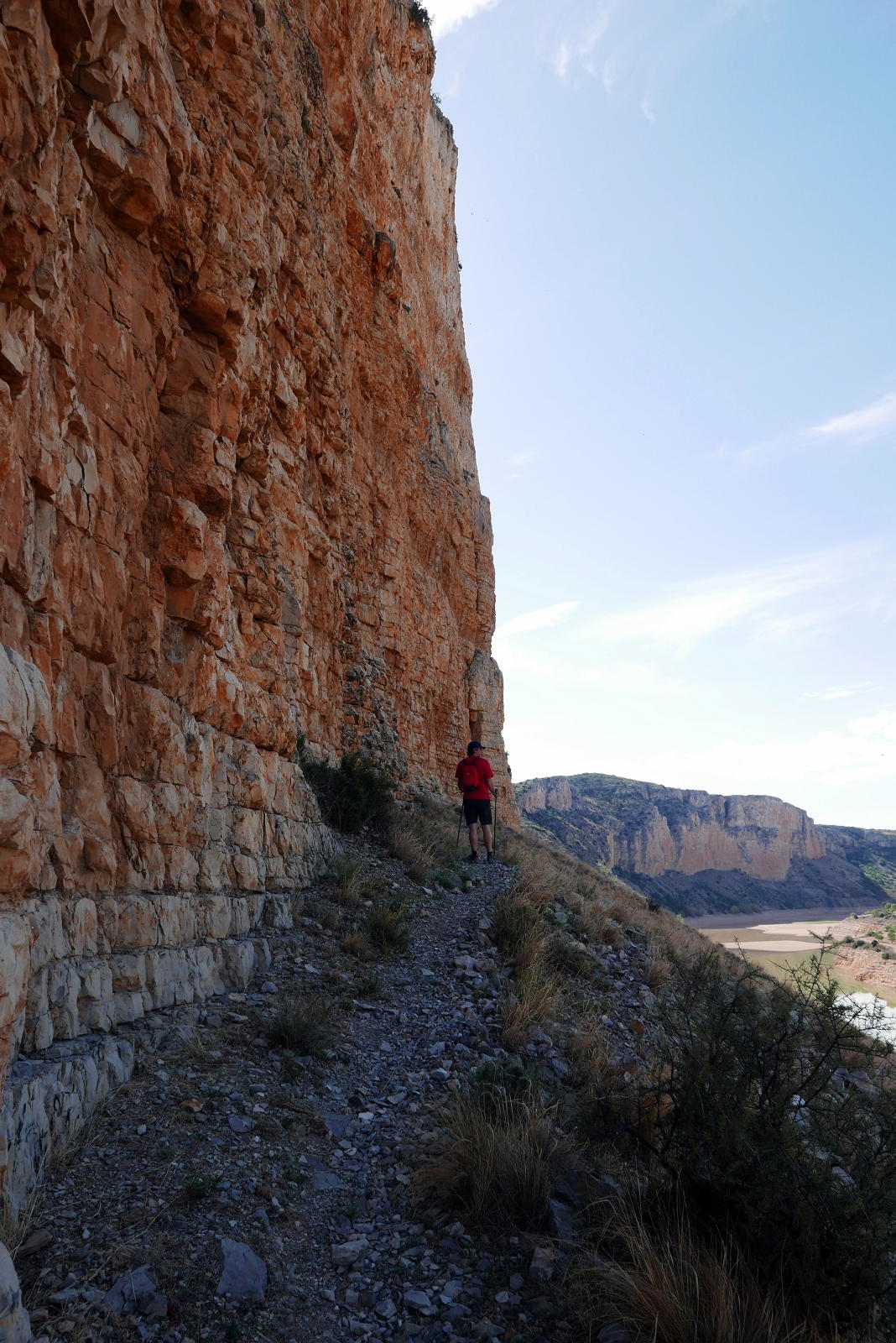 Al cabo de 3km el sendero gira a la izquierda y se aleja del río. Vamos por un camino entre campos de cultivo desembocando en una pista que seguimos a la derecha. Campos de cereal, barbechos, huertas, vides, olivos y almendros configuran el paisaje hasta llegar a la presa de Mezalocha (480m 1h41′). El entorno cambia drásticamente ya que el embalse está incrustado entre verticales paredes rocosas, y una senda, la PR-Z-45, avanza pegada a la pared. Por aquí ya solo continuamos Víctor y yo.