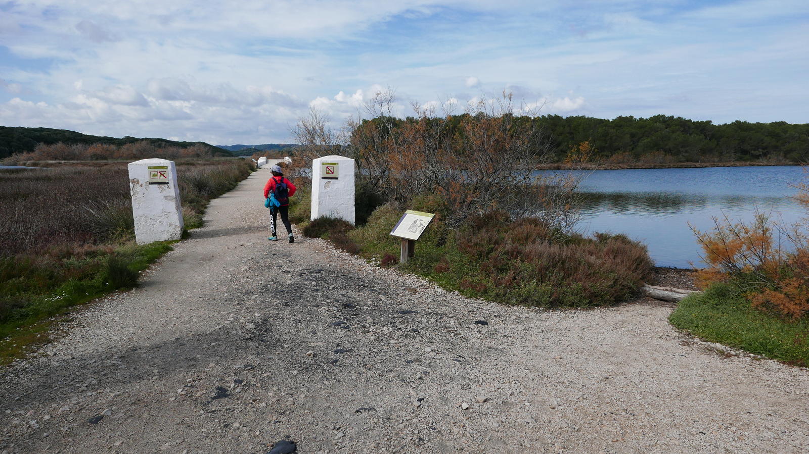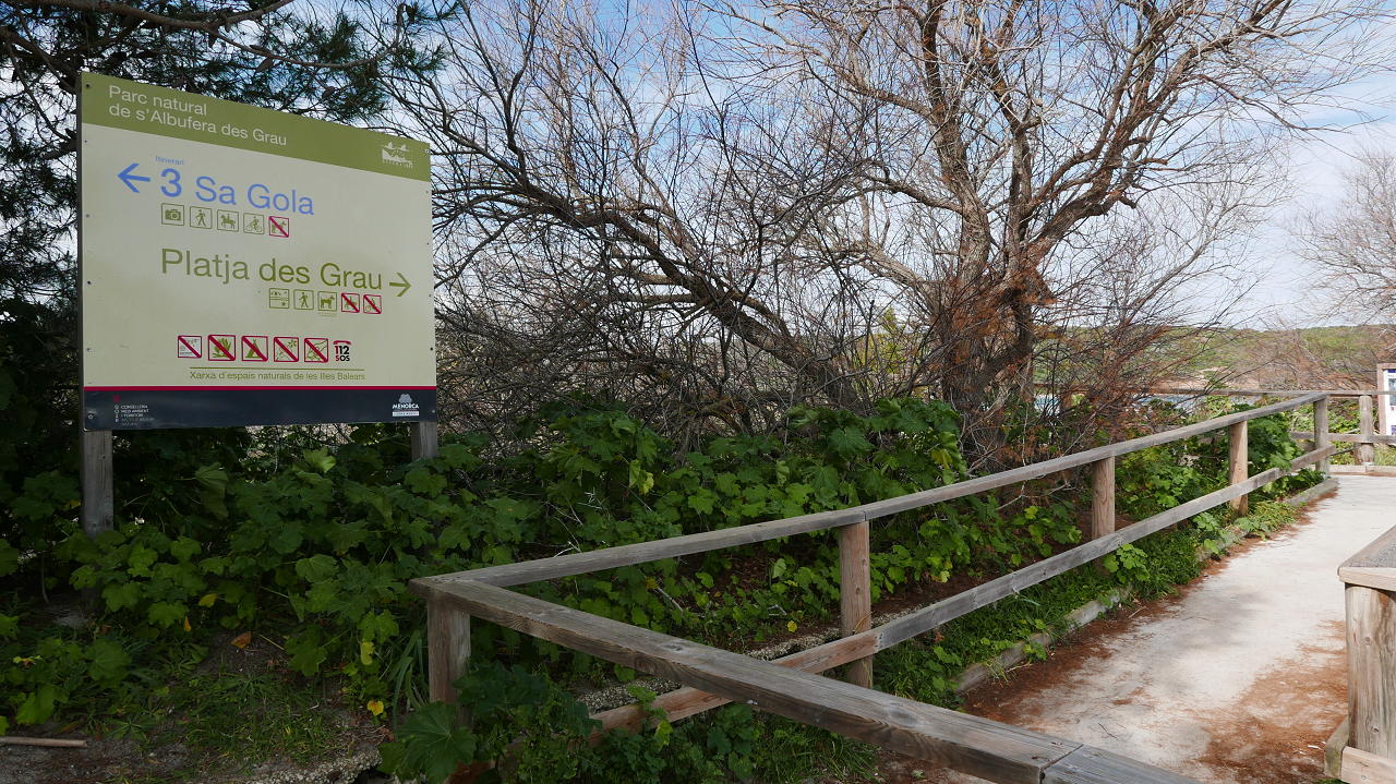 Descripción de la ruta: Desde el aparcamiento se vuelve unos 200 metros por la carretera por un carril peatonal y de bicis, encontrando la entrada al itinerario a la derecha. Se pasa un puente de piedra sobre el canal de Sa Gola y una pasarela de madera protege la vegetación de salicornia y otras especies de plantas especializadas en suelos de alta salinidad.