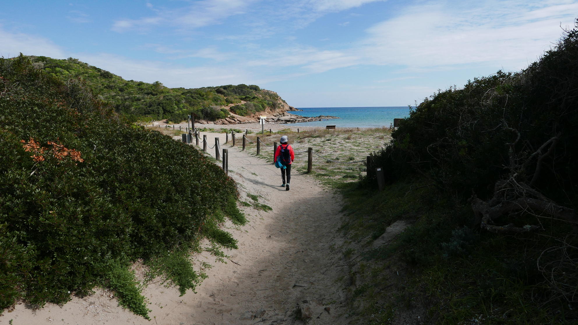 Subimos a la Punta Sa Gola, mirador excepcional desde donde podemos ver la albufera, a la izquierda, y el sistema de dunas y la costa, a la derecha. Volvemos al camino principal que avanza por pinares y se introduce entre la vegetación que fija las dunas para salir finalmente al extremo norte de la playa de Es Grau (0h36′).