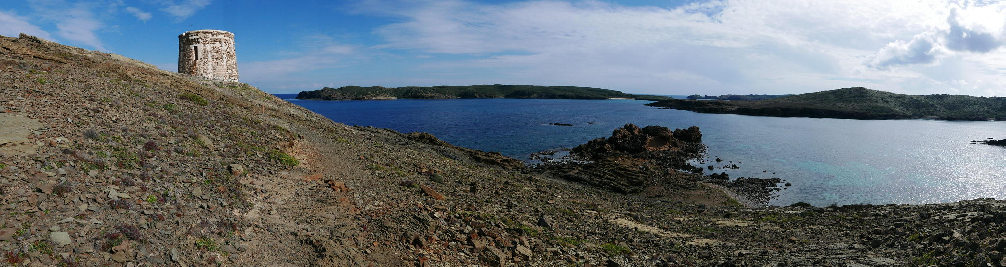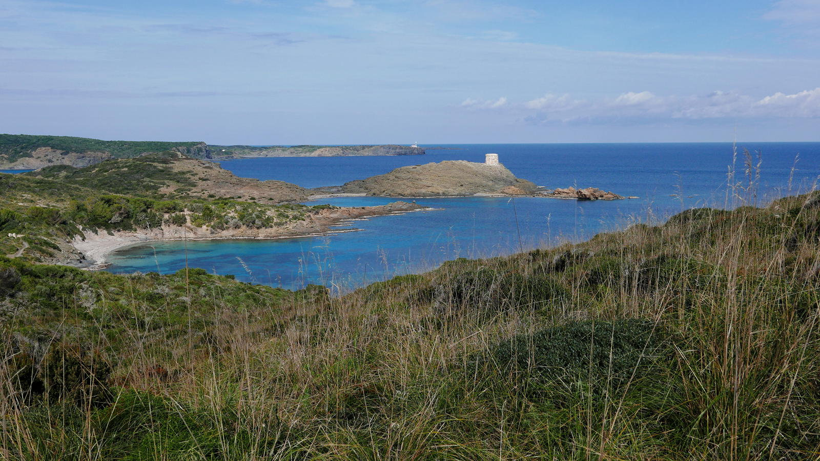 Conectamos aquí con el Camí de Cavalls que asciende por un denso bosquete y luego desciende abruptamente a Cala Tamarells (1h00′), primero a la cala Sur y luego a la Norte, como siempre, totalmente solitarias. Entre ésta y la Cala Torreta está el cabo con la Torre de Rambla (1h10′), una torre de piedra de estructura defensiva. Una desviación del Camí de Cavalls se dirige, a través de una senda sobre la piedra con curiosas erosiones alveolares, con un ascenso final a la torre de vigilancia, desde la que se ven las calas de Tamarells y, enfrente, la isla Colom.