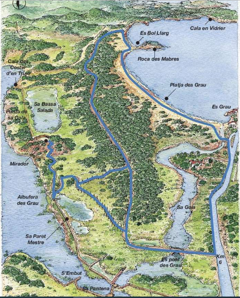 Después de hacer el itinerario Santa Madrona, nos dirigimos a Es Grau para hacer el de Sa Gola y continuar por el Camí de Cavalls hasta Cala Tamarells y la Torre de Rambla. Este itinerario circula al este de la albufera, entre ésta y los sistemas de pinos y dunas que la separan de la playa des Grau. Sa Gola es el canal que conecta la albufera con el mar y, hoy en día, permite la regulación de los niveles de agua y salinidad de la albufera, esencial para su conservación, ya que la sobreexplotación de los acuíferos hace que la regulación natural se haya visto afectada. Descargar la descripción en menorca diferente