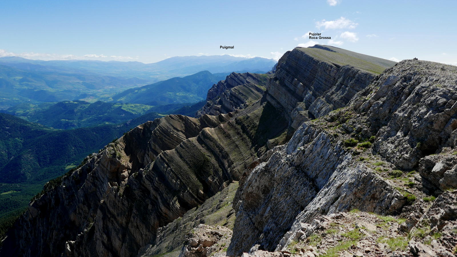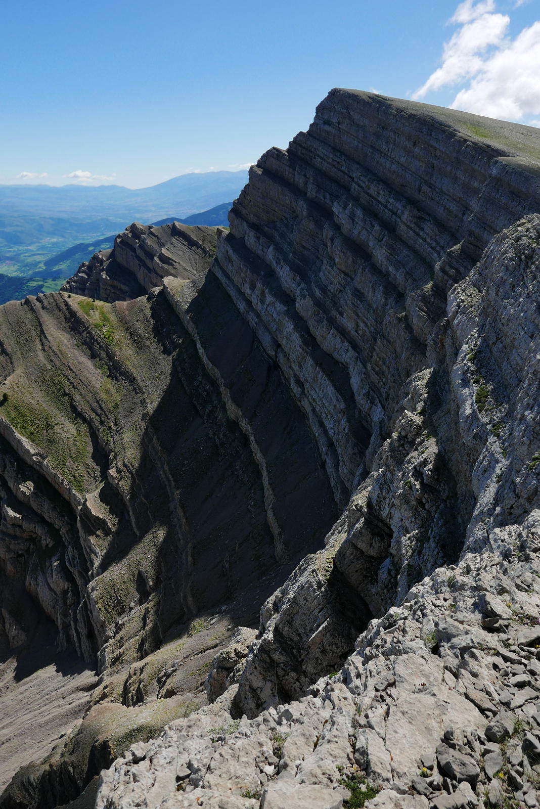 Por fin se sale a una zona bastante más llana de pasto y piedra (2385m 2h04′) que debo ir faldeando hacia la izquierda hasta subir a la Torreta del Cadí (2562m 2h30′). Espectacular la vertiente norte, de gran verticalidad, canales muy muy pendientes y estratos inclinados preciosos.