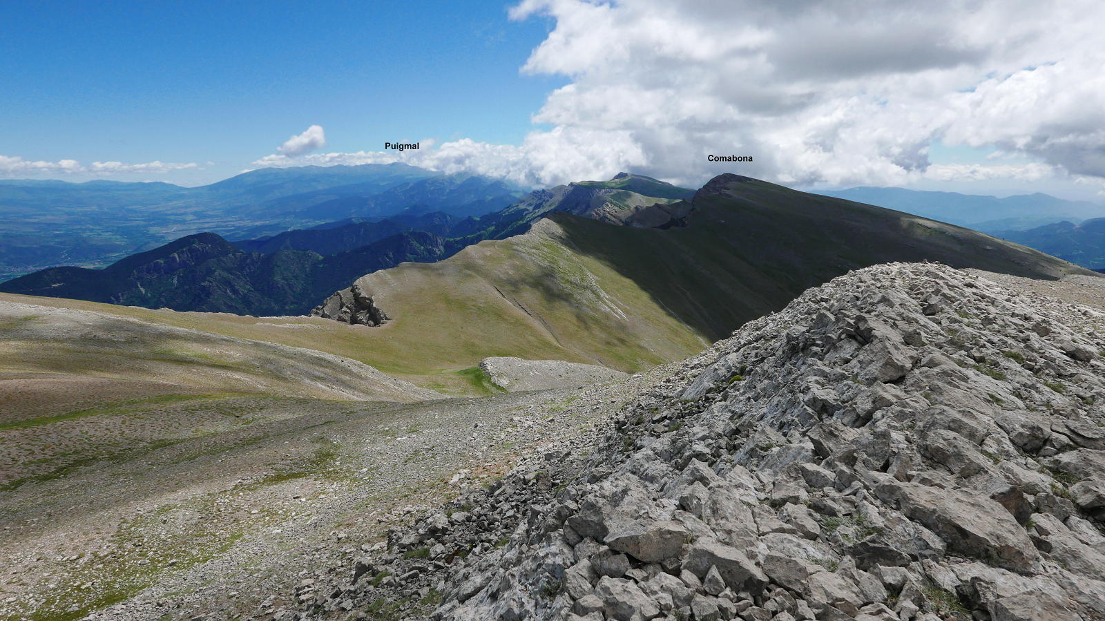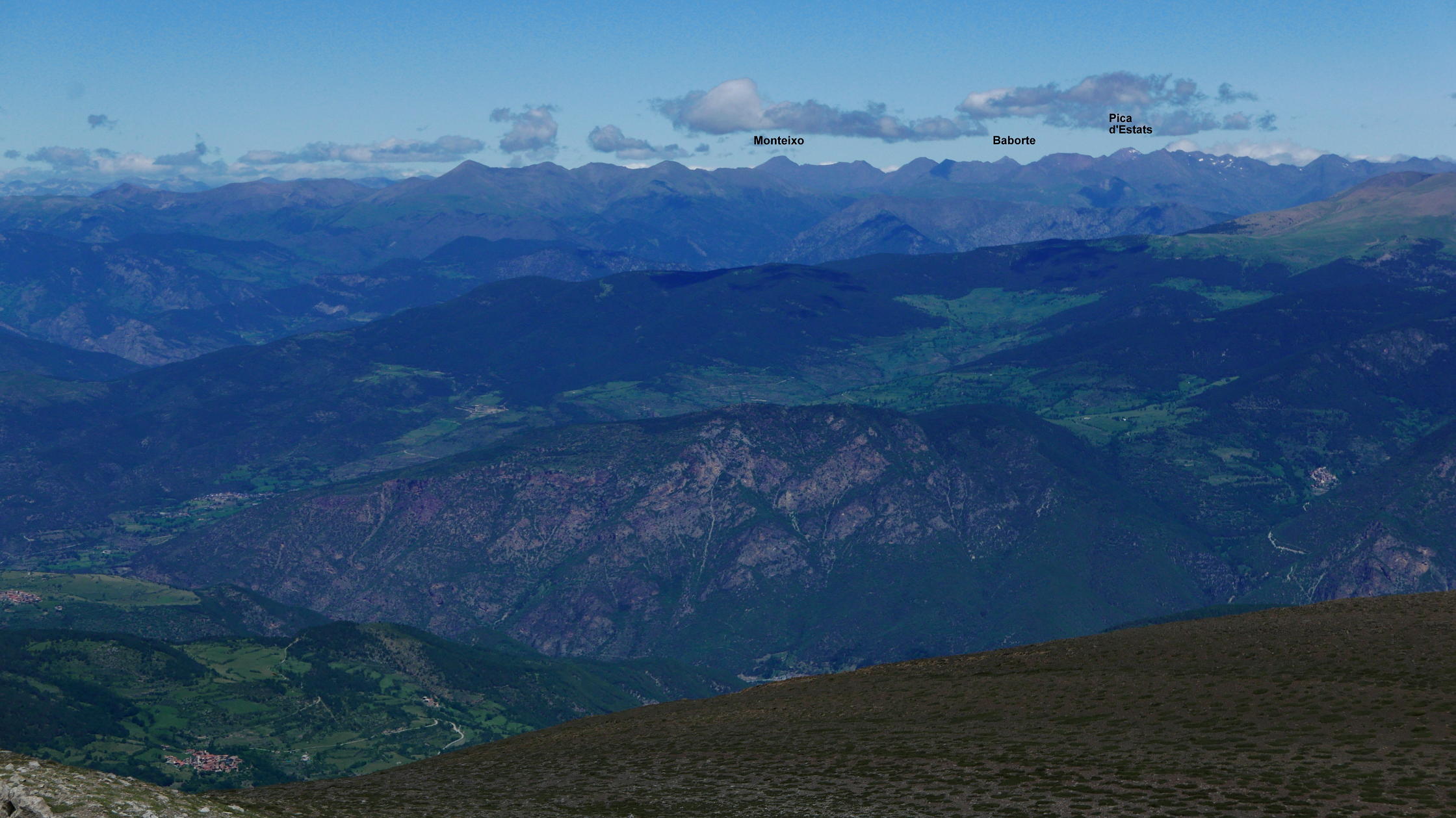 Sigo junto al filo, fácil pero sin senda, coronando varias cotas, como el Pujolar de Roca Grossa (2611m 3h40′). Desde el Puig de les Gralleres (2613m 4h07′) hay que bajar a un collado, coll de la Canal Baridana (2501m 4h18′) , para afrontar la subida final al Vulturó (2649m 4h32′) al que se accede superando un pequeño resalte rocoso. Desde aquí puedo ver claramente el Costa Cabirolera que subí el año pasado.