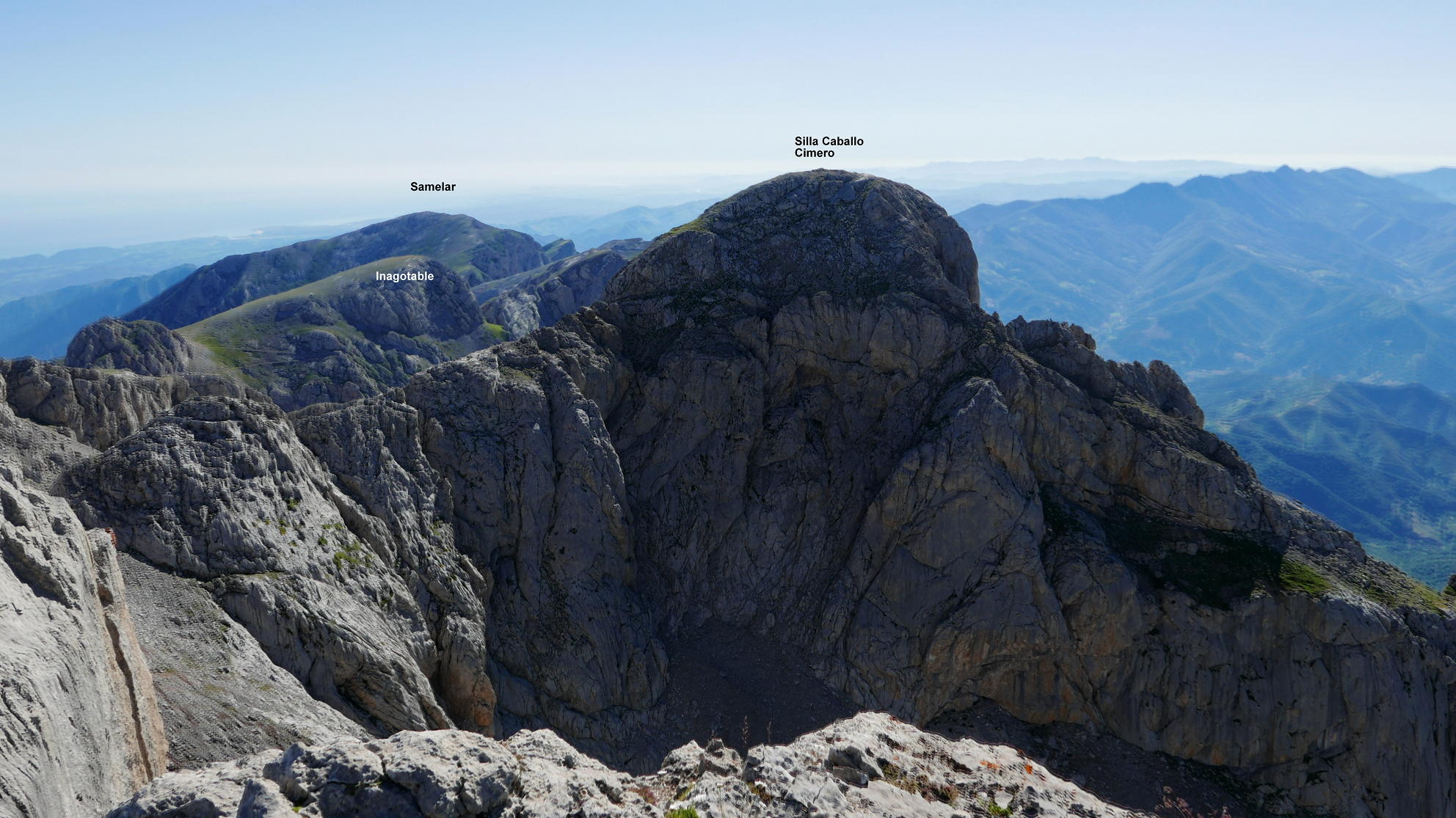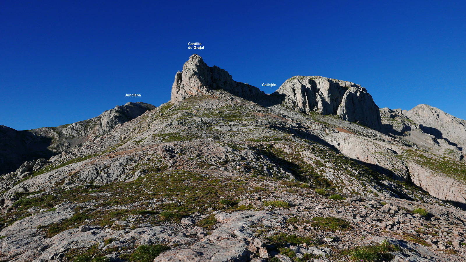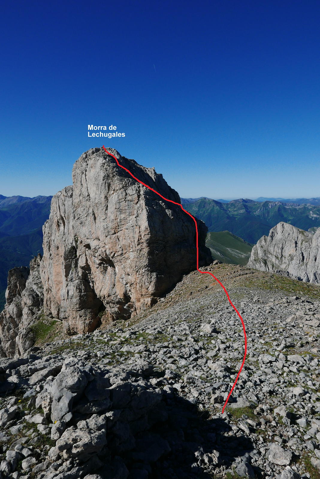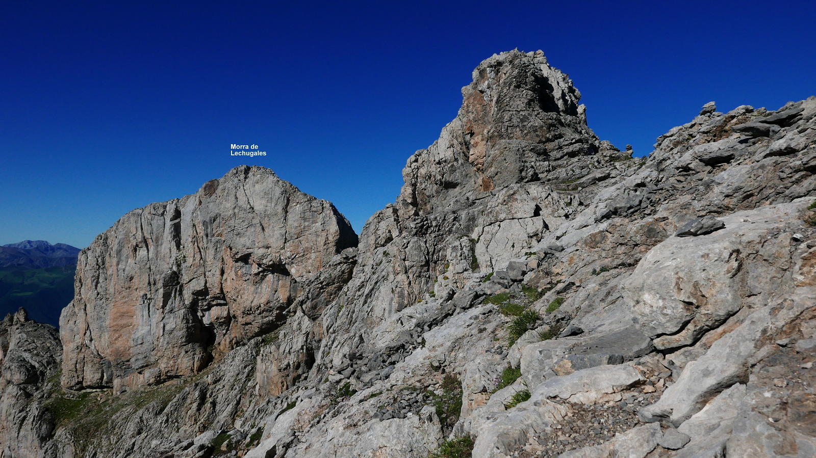 Esta prolongación también se rodea por la izquierda, para luego subir y bordear por la derecha un par de cotas antes de la Morra. Al dejar atrás estas dos cotas me encuentro en un rellano frente a la pared que defiende la curiosa cima de la Morra. Hay que enfrentarse al punto clave, una trepada vertical que tiene una cuerda fija. Me pongo el casco y dejo los bastones. La trepada se afronta por la derecha de la cuerda, las presas son buenas, no utilizo la cuerda y, en realidad, solo un paso me resulta un poco comprometido (había leído descripciones más inquietantes, pero esto siempre es muy subjetivo). Superado este tramo ya solo queda un corto ascenso andando hasta la cima de Morra de Lechugales (2442m 3h25′) con magníficas vistas del macizo Central y de Peña Vieja, que subí el año pasado.