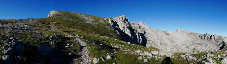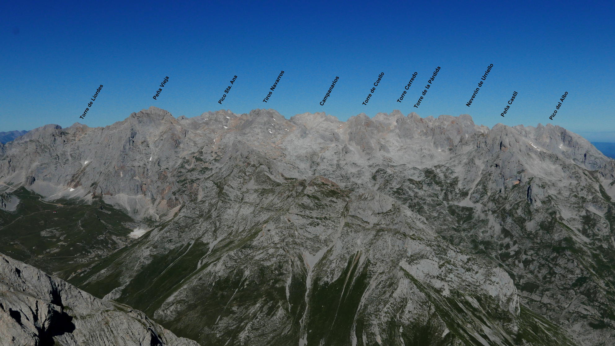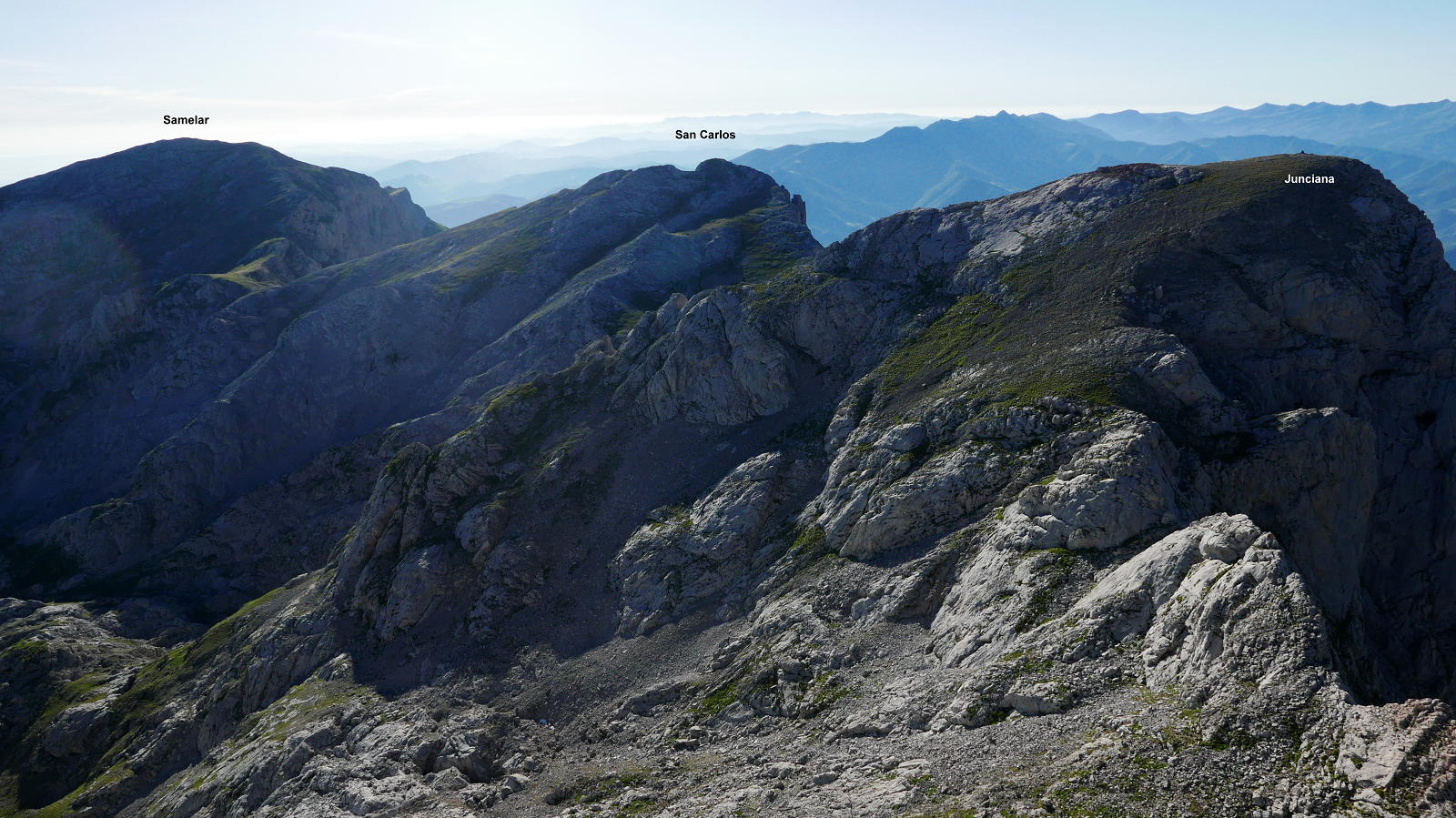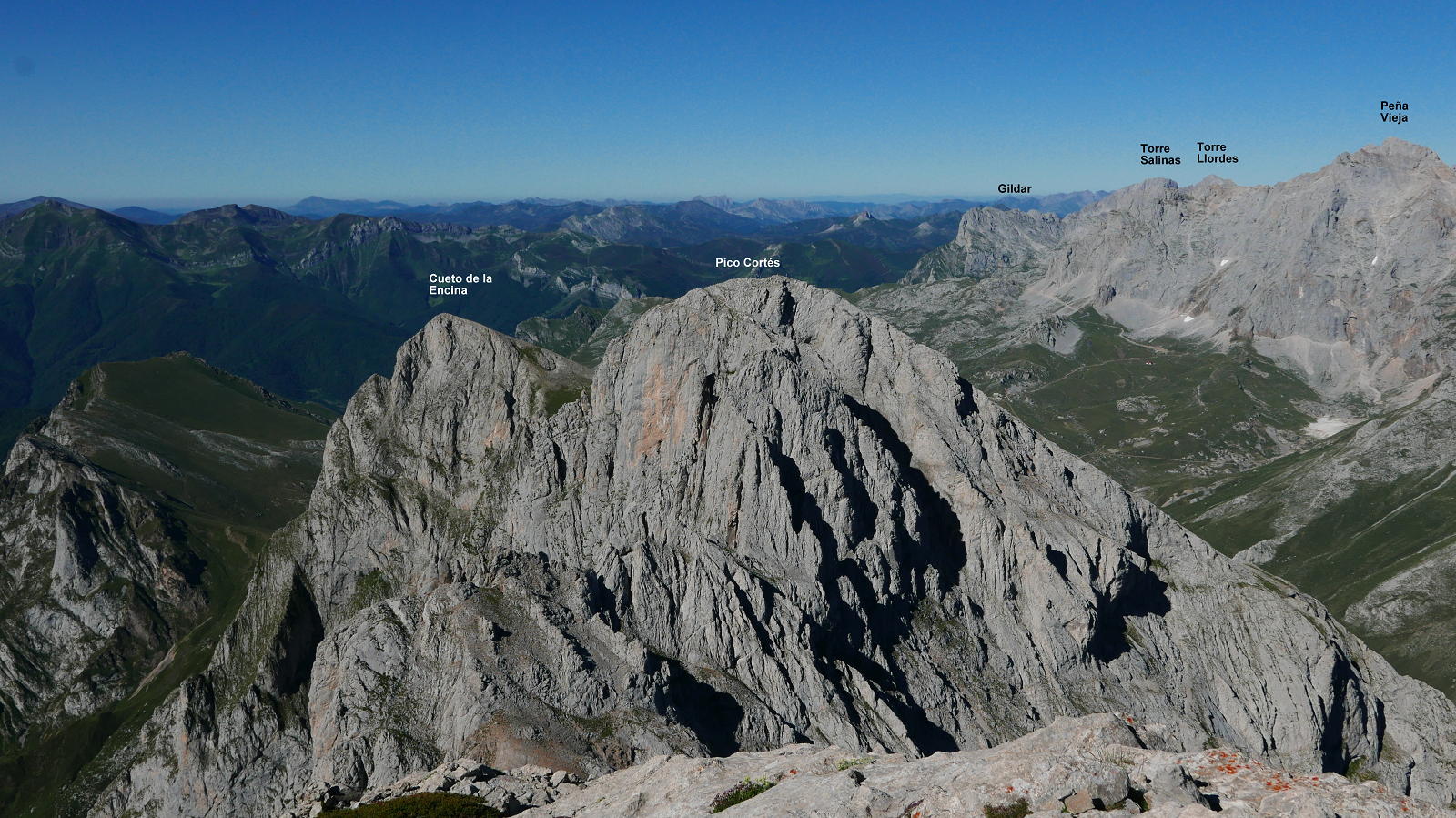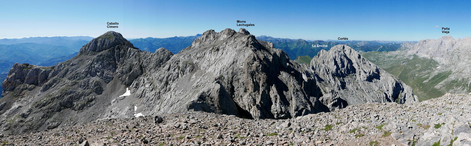 Esta prolongación también se rodea por la izquierda, para luego subir y bordear por la derecha un par de cotas antes de la Morra. Al dejar atrás estas dos cotas me encuentro en un rellano frente a la pared que defiende la curiosa cima de la Morra. Hay que enfrentarse al punto clave, una trepada vertical que tiene una cuerda fija. Me pongo el casco y dejo los bastones. La trepada se afronta por la derecha de la cuerda, las presas son buenas, no utilizo la cuerda y, en realidad, solo un paso me resulta un poco comprometido (había leído descripciones más inquietantes, pero esto siempre es muy subjetivo). Superado este tramo ya solo queda un corto ascenso andando hasta la cima de Morra de Lechugales (2442m 3h25′) con magníficas vistas del macizo Central y de Peña Vieja, que subí el año pasado.