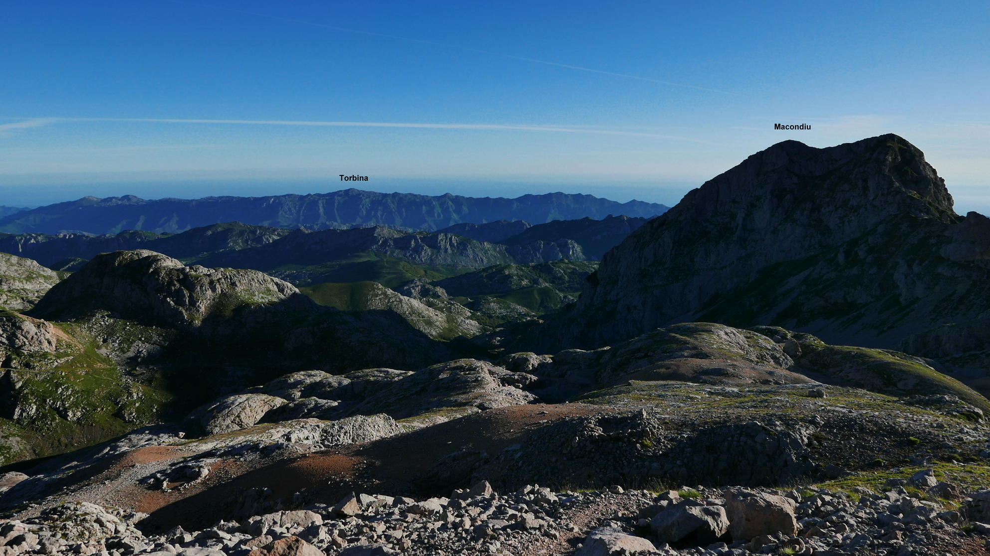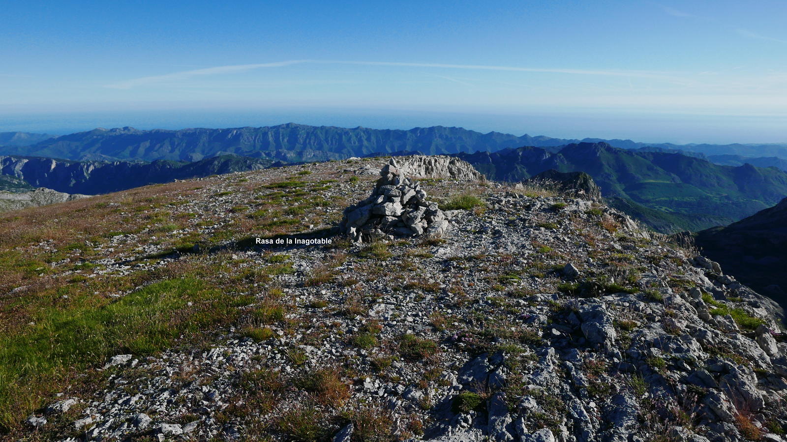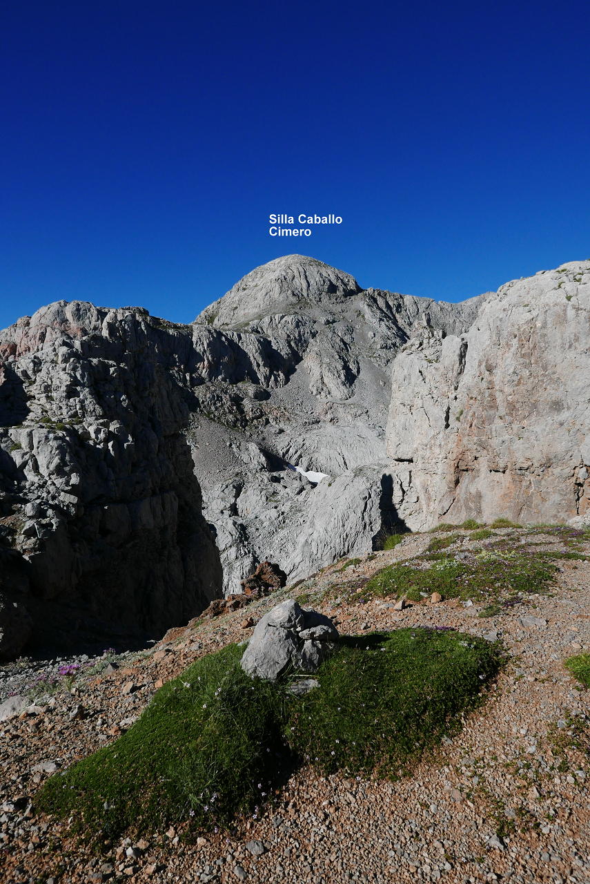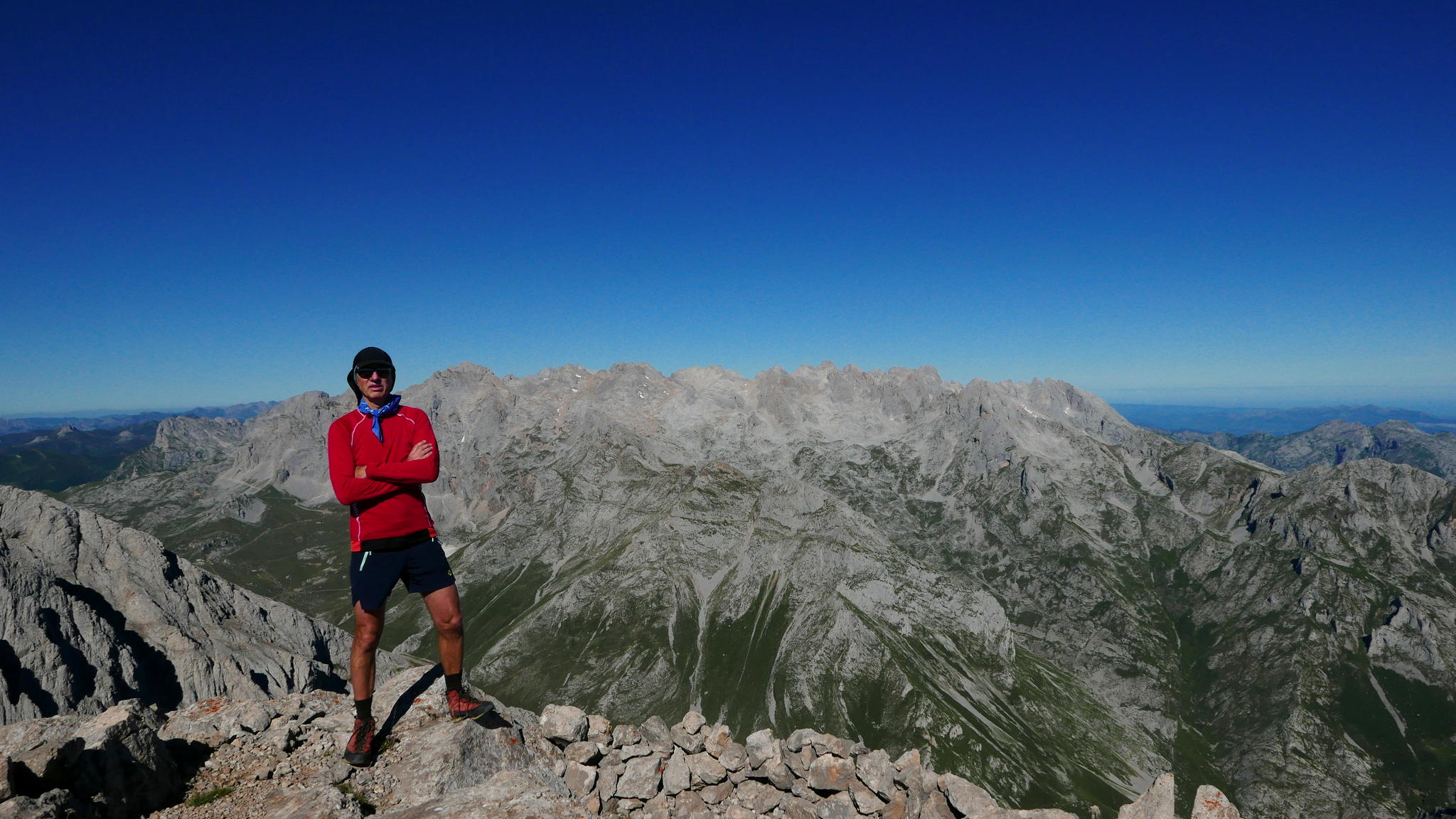 Esta prolongación también se rodea por la izquierda, para luego subir y bordear por la derecha un par de cotas antes de la Morra. Al dejar atrás estas dos cotas me encuentro en un rellano frente a la pared que defiende la curiosa cima de la Morra. Hay que enfrentarse al punto clave, una trepada vertical que tiene una cuerda fija. Me pongo el casco y dejo los bastones. La trepada se afronta por la derecha de la cuerda, las presas son buenas, no utilizo la cuerda y, en realidad, solo un paso me resulta un poco comprometido (había leído descripciones más inquietantes, pero esto siempre es muy subjetivo). Superado este tramo ya solo queda un corto ascenso andando hasta la cima de Morra de Lechugales (2442m 3h25′) con magníficas vistas del macizo Central y de Peña Vieja, que subí el año pasado.