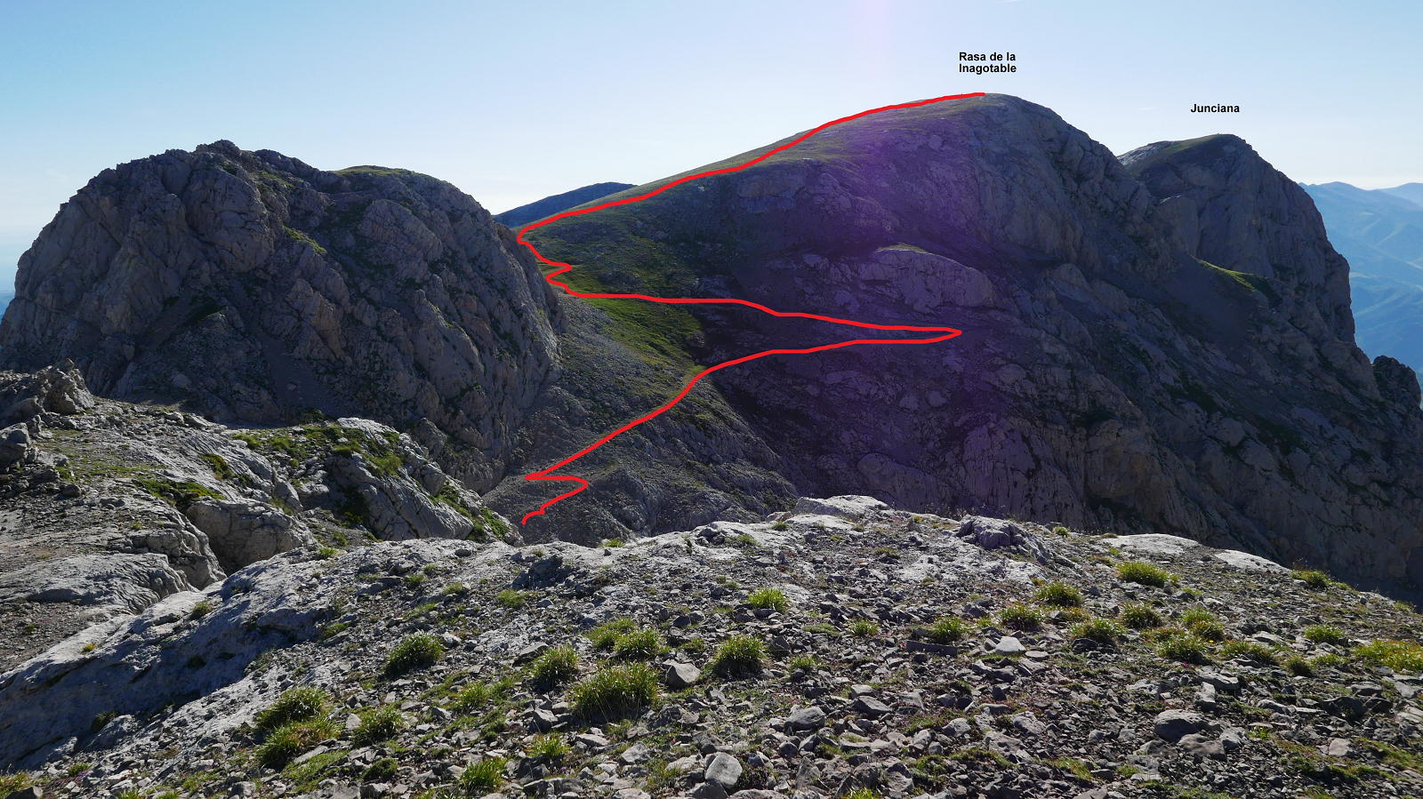 Se toma el lomo que lleva hacia el collado del Mojón, entre la Rasa y el pico Grajal de Abajo, pero bastante antes del collado salgo de la senda hacia la izquierda (2135m 1h48′) para ascender la Rasa de la Inagotable (2282m 1h57′). Desde su cima desciendo directamente al collado del Mojón (2205m 2h06′), rodeo el Grajal de Abajo por el sur. Aquí hay un punto confuso porque parece que hay una senda que bordea por las paredes rocosas, pero tengo que retroceder y ascender a un collado SW del Grajal de Abajo (2198m 2h22′) para seguir por la cresta hacia el SW, pasando por el pico Grajal de Arriba (2349m) y luego girando hacia el sur para esquivar la cima de la Pica del Jierro por su izquierda, alcanzando el collado entre la Pica del Jierro y la prolongación norte de la Morra de Lechugales. En todo momento hay que intentar buscar los puntos de pintura roja.
