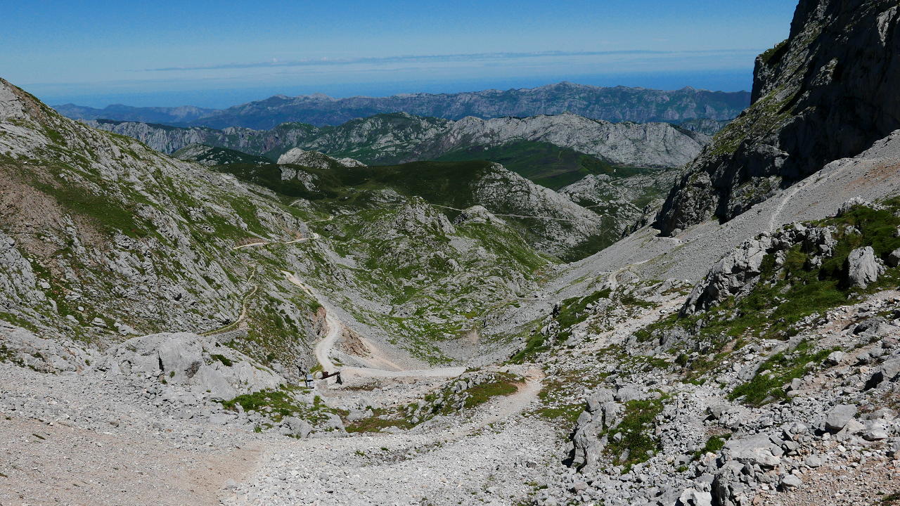 Toca destrepar. Ahora sí que me ayudo de la cuerda. Sigo el mismo camino hasta el collado sur de la Pica del Jierro y asciendo sin problemas a su cima (2425m 4h22′). Desciendo por su cresta NW hasta una brecha (2273m 4h37′) bastante antes del collado Valdomineguero, donde tomo el descenso por la pedrera hasta conectar con una senda que rodea el Jou LLeroso por la derecha, faldeando. Se supera un hombro, los Vallejucos (2015m 5h07′). La senda se convierte en camino, rodea el Jou Valdominguero por otra zona minera. La pista gira a la derecha y conecta el collado de la Aldea (1787m 5h45′) con mi ruta de subida.