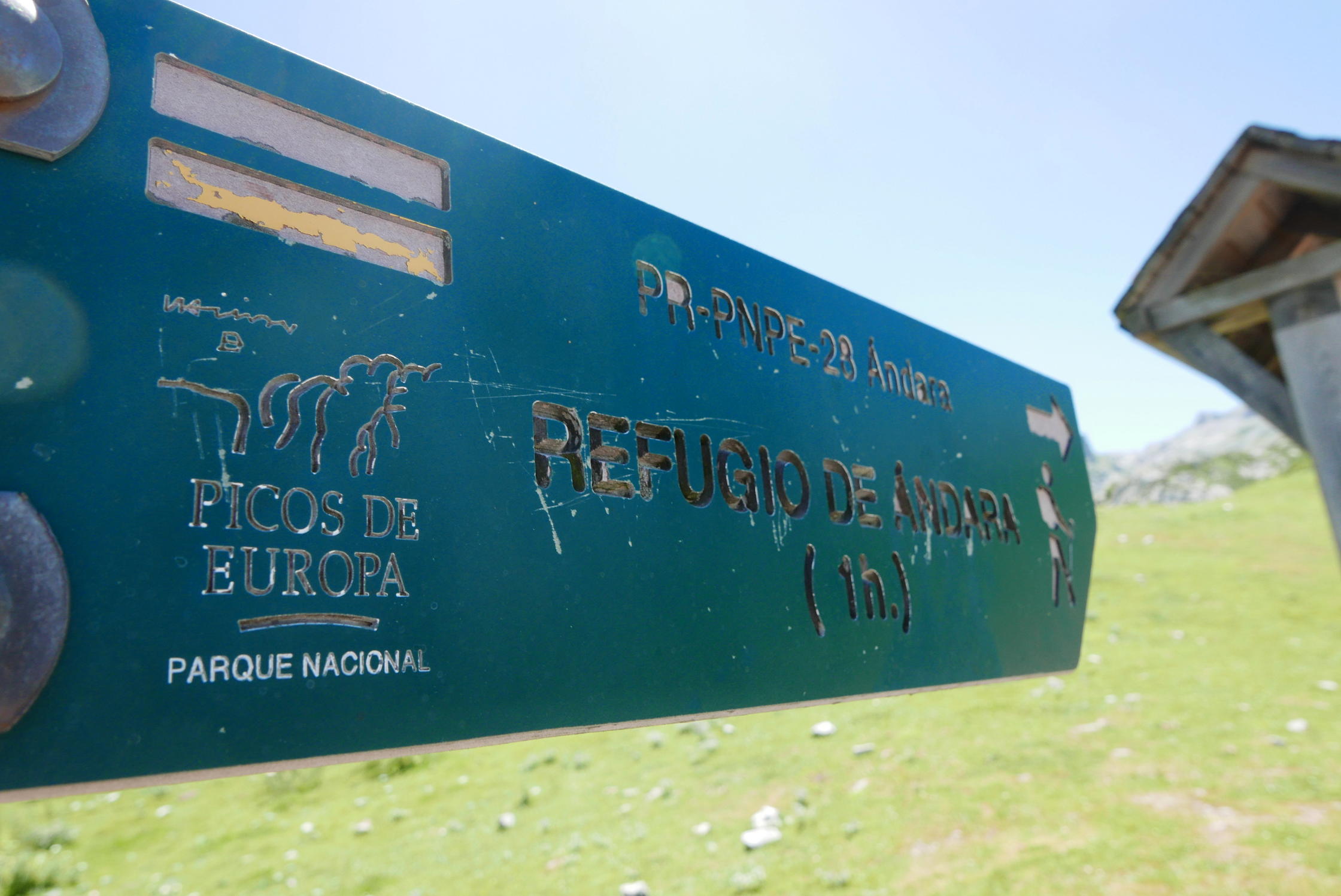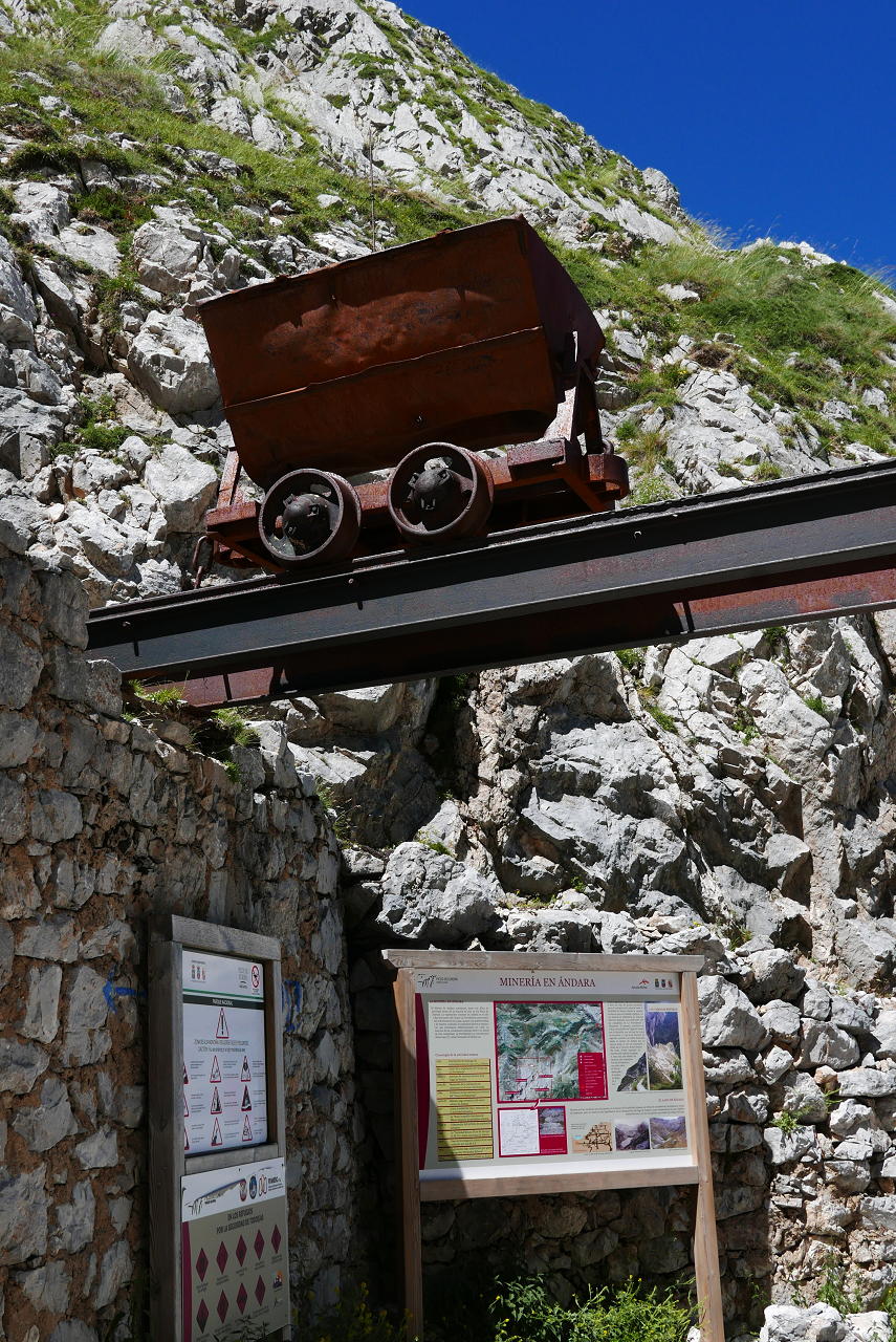 Descripción de la ruta: Jito de Escarandi (1300m) es una zona ganadera, en la zona de aparcamiento hay un mastín con su collar de púas, pero está ahí tan tranquilo. Se toma una pista hacia el sur, casi paralela a la carretera que, sin ninguna pérdida, lleva al refugio Casetón de Ándara (1705m 0h48′), único refugio guardado del macizo Oriental. La subida no se me hace dura, pero la bajada sí que me parece algo pesada. Antes del refugio se pasa bajo una vagoneta como vestigio de la actividad minera en la zona.