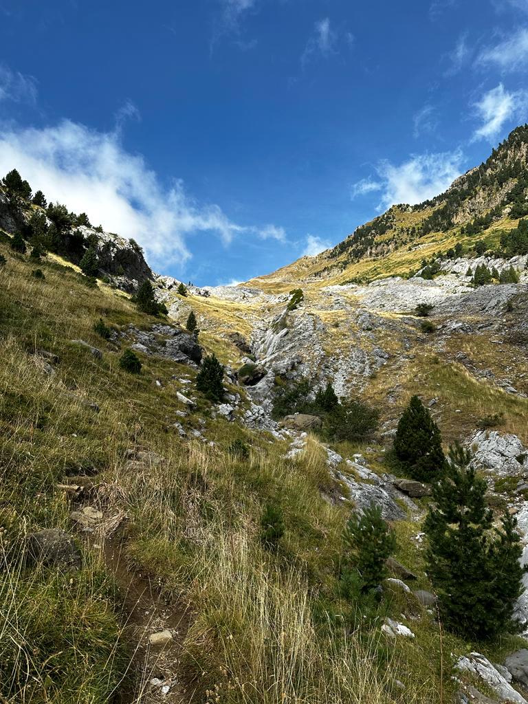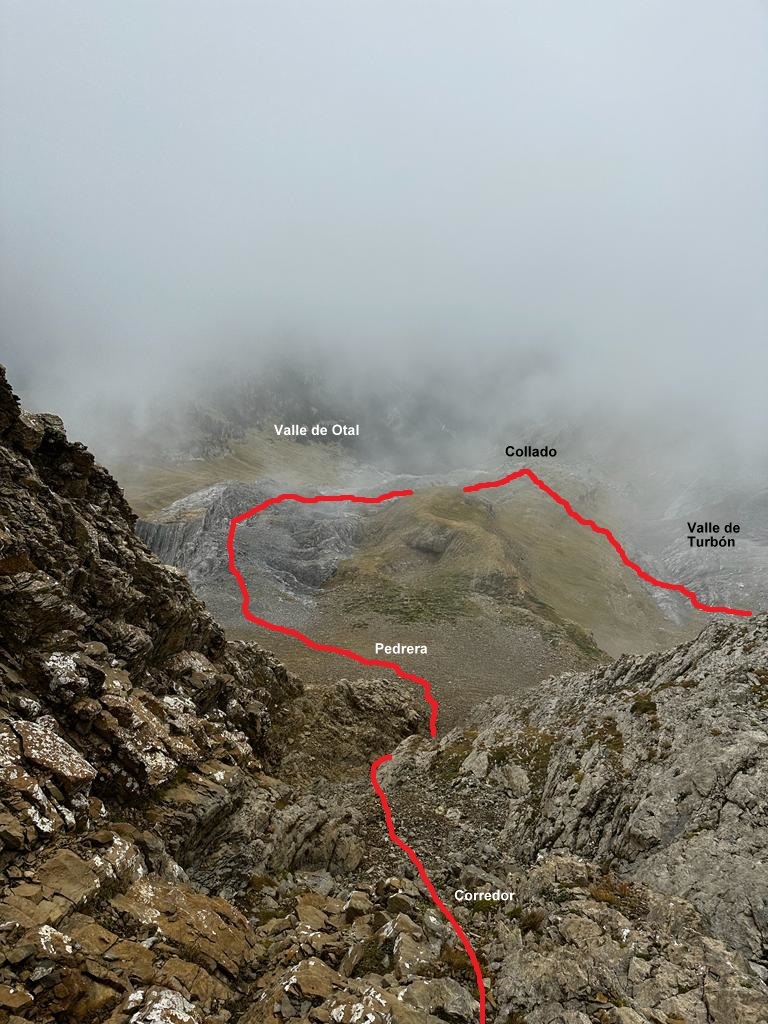 Esta última ruta se desarrolla por el valle que forma el barranco Turbón. Corta en distancia pero con pendientes que no dan descanso en ningún momento. No presenta problemas hasta el collado de Otal, al sur del pico Royo; luego avanza por terreno rocoso y pedregoso y, finalmente, hay que enfrentarse a unos corredores catalogados como I+ en los que, sobre todo a la bajada, tomo bastantes precauciones.