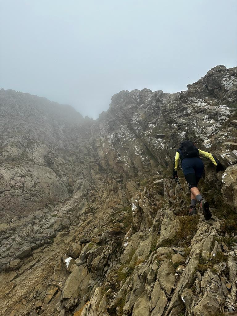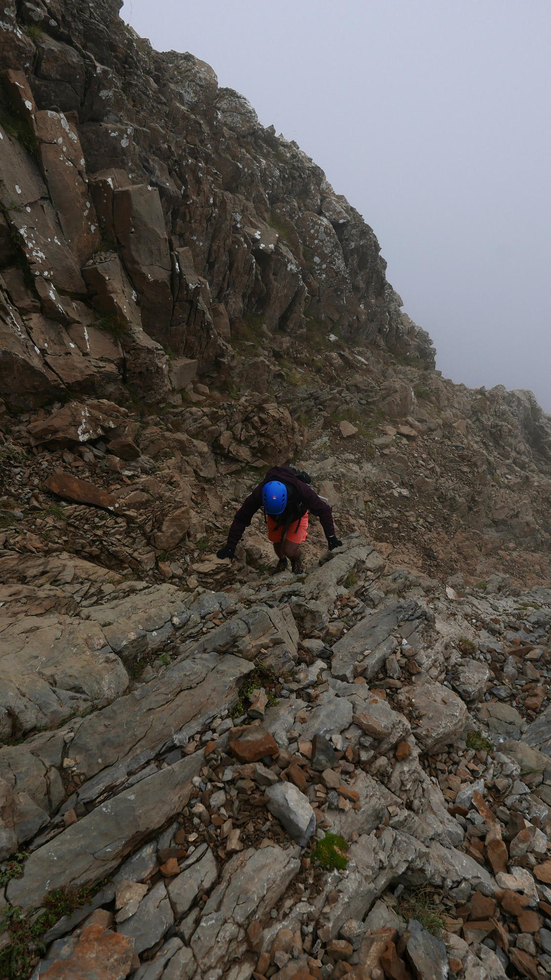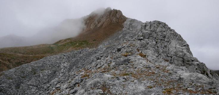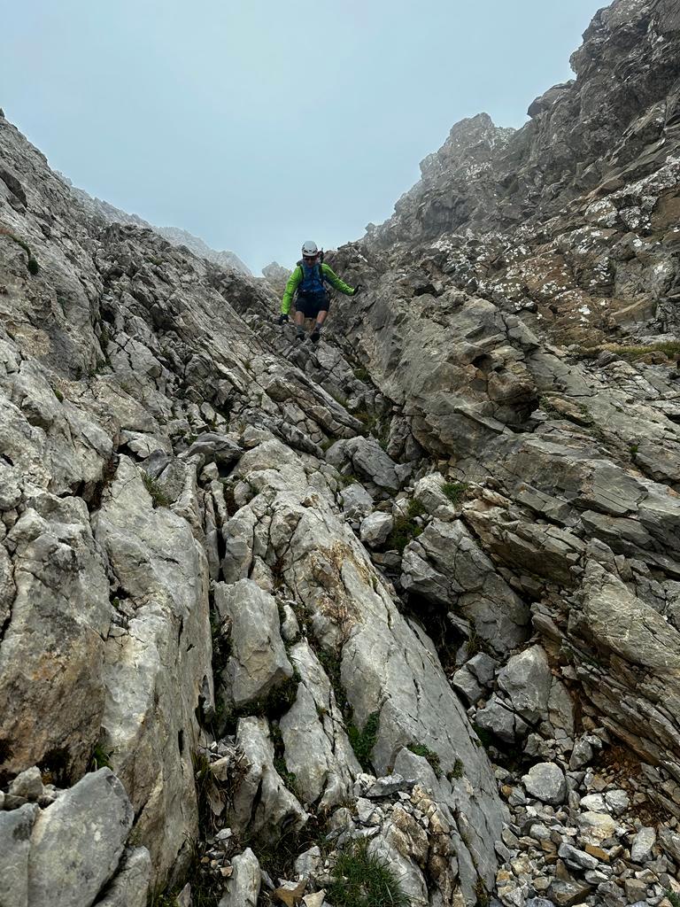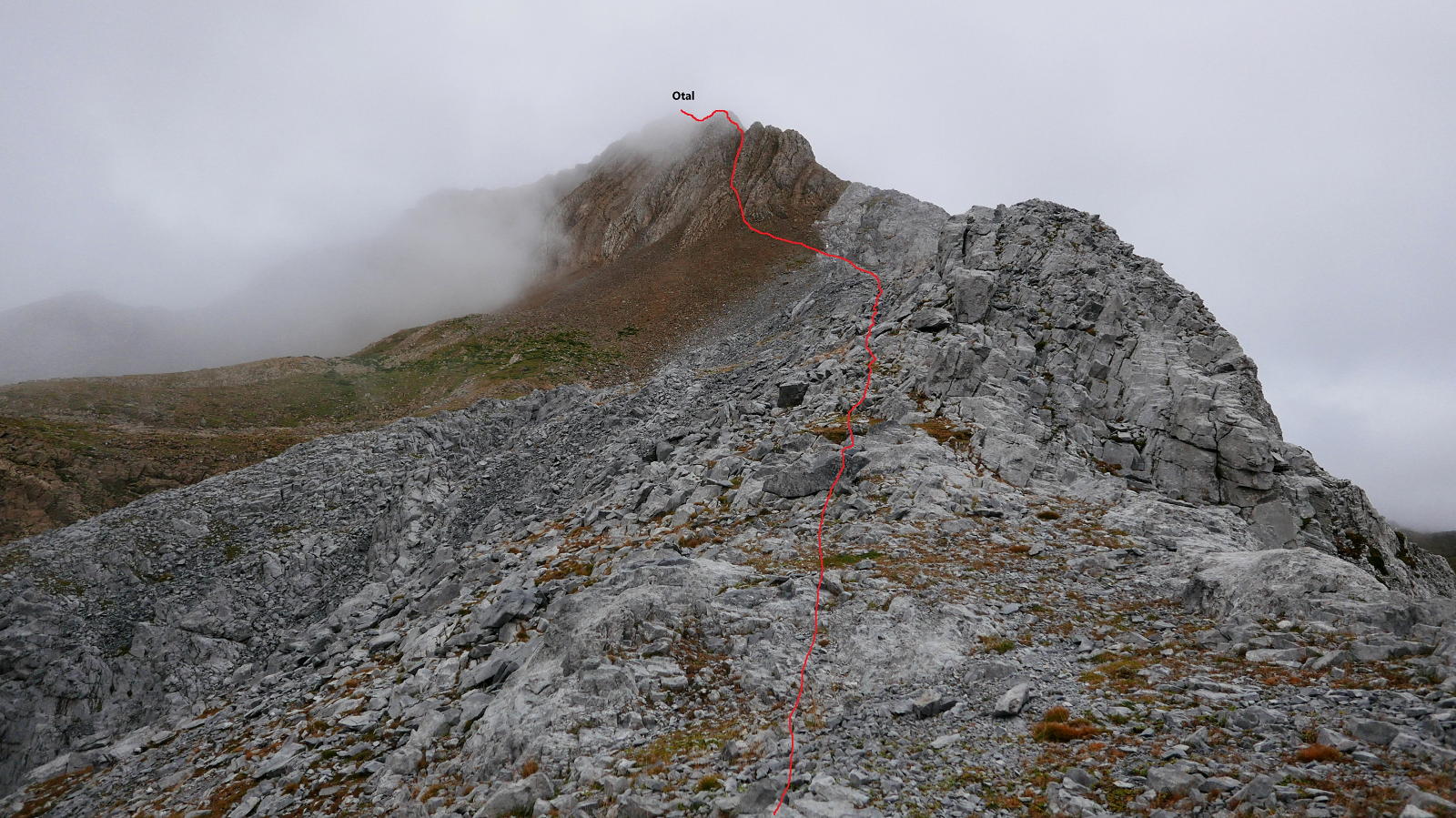 Hacia los 2500m se abandona la cresta (pasamos del terreno calizo gris a la pedrera parda) para tomar una diagonal por terreno pedregoso (hay huella de paso) que nos encamina a la pared NE del pico Otal. El paso de las nubes nos deja entrever las canales que surcan esta pared. Primero una canal en diagonal hacia la izquierda nos lleva a una canal más larga y directa que desemboca en una brecha a la derecha de la antecima del pico Otal. Los corredores están compuestos de roca bastante rota, por lo que se ascienden bien a pesar de su verticalidad. Durante el descenso guardo los bastones y bajo con suma precaución porque a veces está algo húmedo.