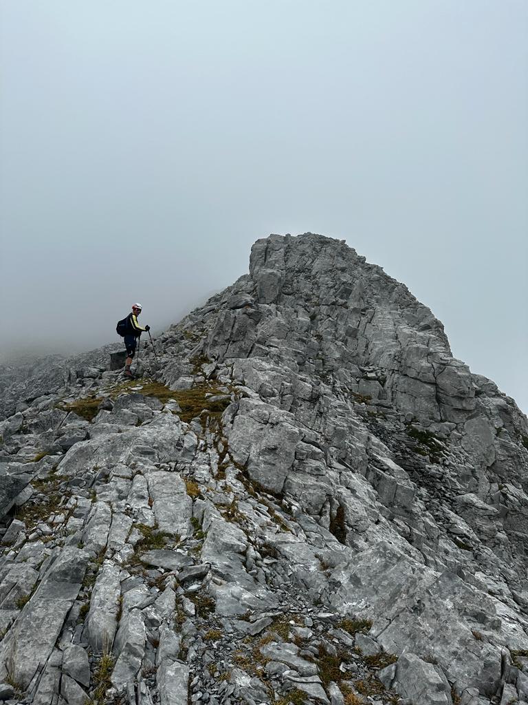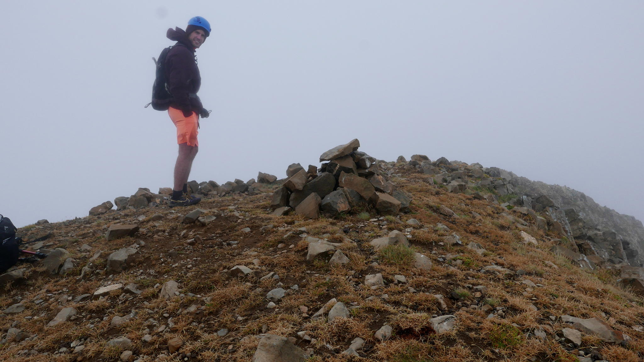 Prácticamente en la brecha trepamos por roca a la antecima, a nuestra izquierda; bajamos la pequeña brecha que nos separa de la cima y, rápidamente, nos encaramamos a la Peña Otal (2705m 2h25′). El frío, el viento y la niebla no nos animan a permanecer mucho rato. Unas fotos rápidas y descenso al valle, al aparcamiento (1260m 4h 18′)