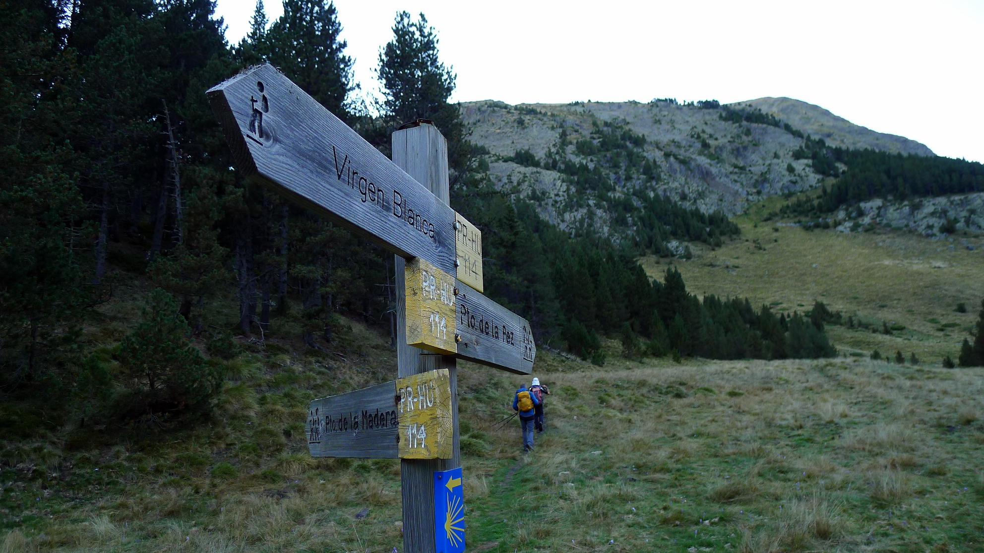 Descripción de la ruta: Tabernes (1730m) es un gran refugio libre. En la explanada ya hay algún coche y furgoneta, habrán pasado la noche aquí. Tendremos que seguir el PR-HU-114 que cruza el Cinqueta de la Pez y asciende por su orilla derecha. Tras un repecho más fuerte el camino se allana y vamos por el pinar junto al río hasta una zona amplia, el Vado de Bachimala (1800m 0h29′) donde el PR se bifurca al puerto de la Pez y al puerto de la Madera. Tomamos esta última dirección a nuestra izquierda.