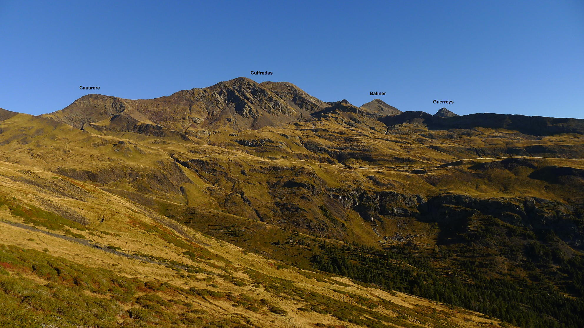 La cresta de los Culfredas o Batouas permite coronar 3 tresmiles sin excesiva dificultad. Se extiende entre el valle Cinqueta de la Pez, en el Parque Natural Posets-Maladeta, al este, y el francés valle de Rioumajou, al oeste, alargándose hacia el norte hasta el pico Lustou, aunque esta parte del recorrido parece ser más complicada y creo que podremos abordarla en otra ocasión.