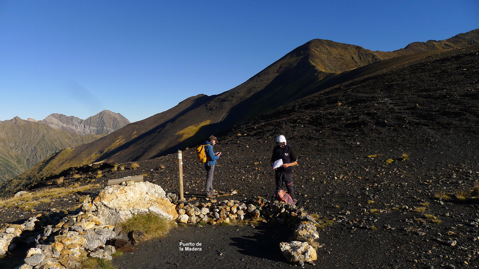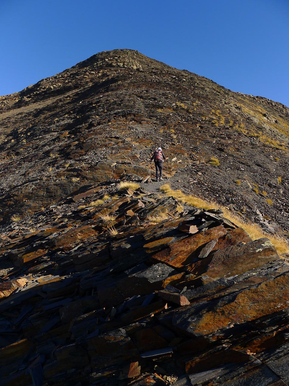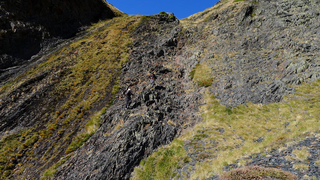 La subida es algo más exigente. Al salir del bosque la senda gira a la izquierda y luego a la derecha para encarar las rampas por zona de pasto que nos llevan al puerto de la Madera (2525m 1h55′). Estamos ya en el dominio de la roca negra, esquistos y pizarras, que dan casi un aire volcánico al entorno. La huella y los hitos nos llevan por la cresta hacia el norte, al principio ancha y alomada, luego se afila y se empina hacia el pico Cauarere, que no es más que el hombro SW de la arista que tenemos que recorrer. Aquí la arista gira a la derecha (NE).